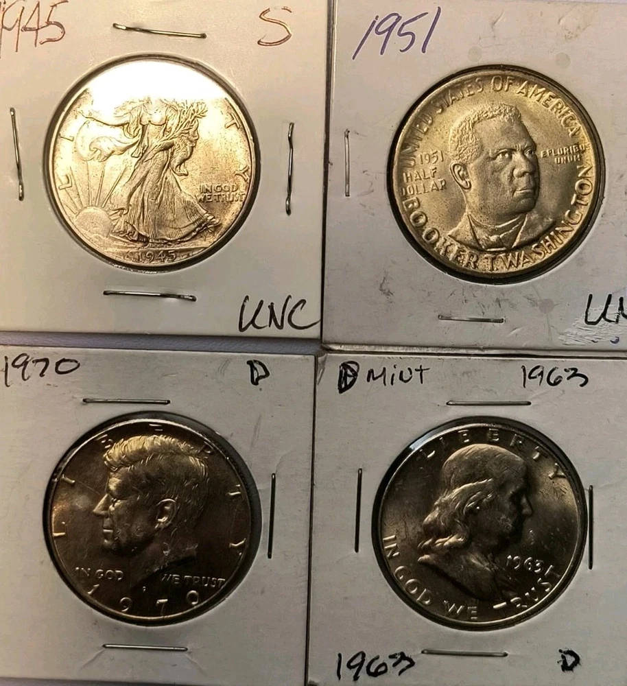 Rare US Silver 1/2 Dollar Mixed Lot 4 Decades Key Mints. Shipped with USPS First Class 1945 S 1951 Booker commemorative 1963 D Franklin 1970 D JFK Nice lot