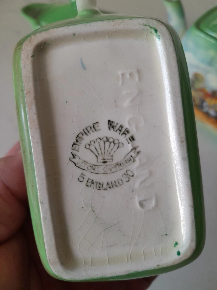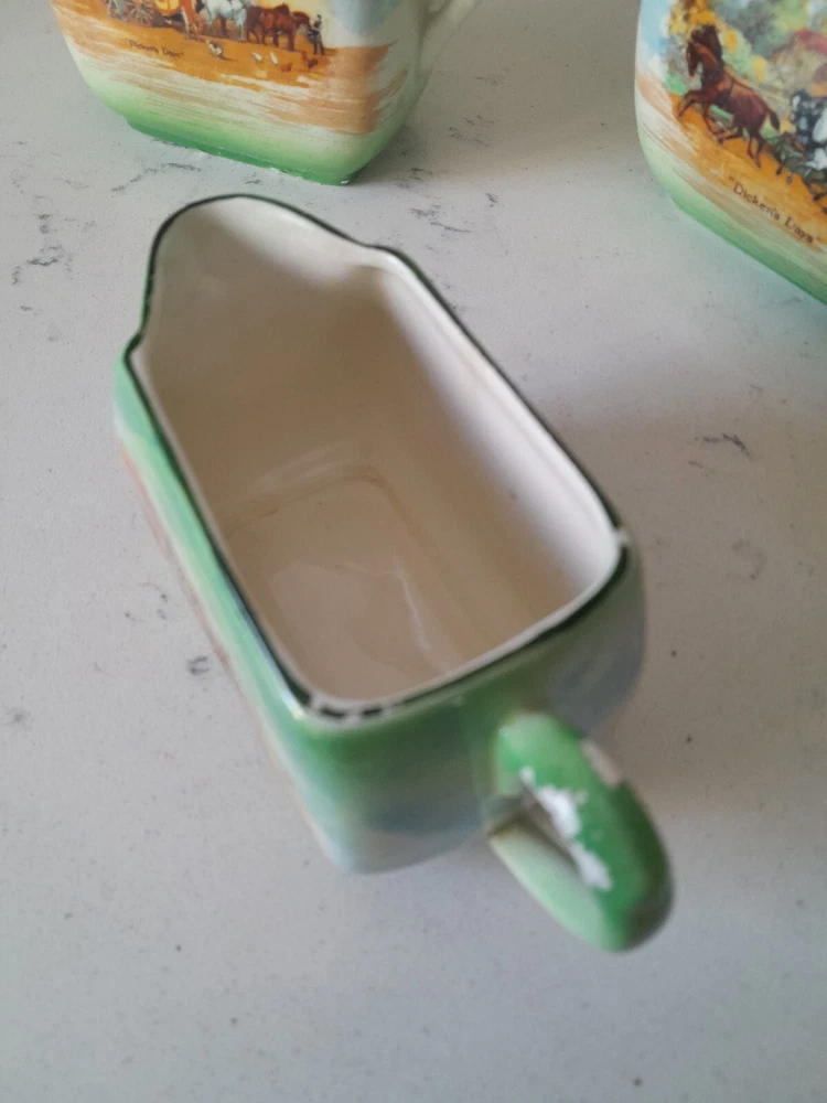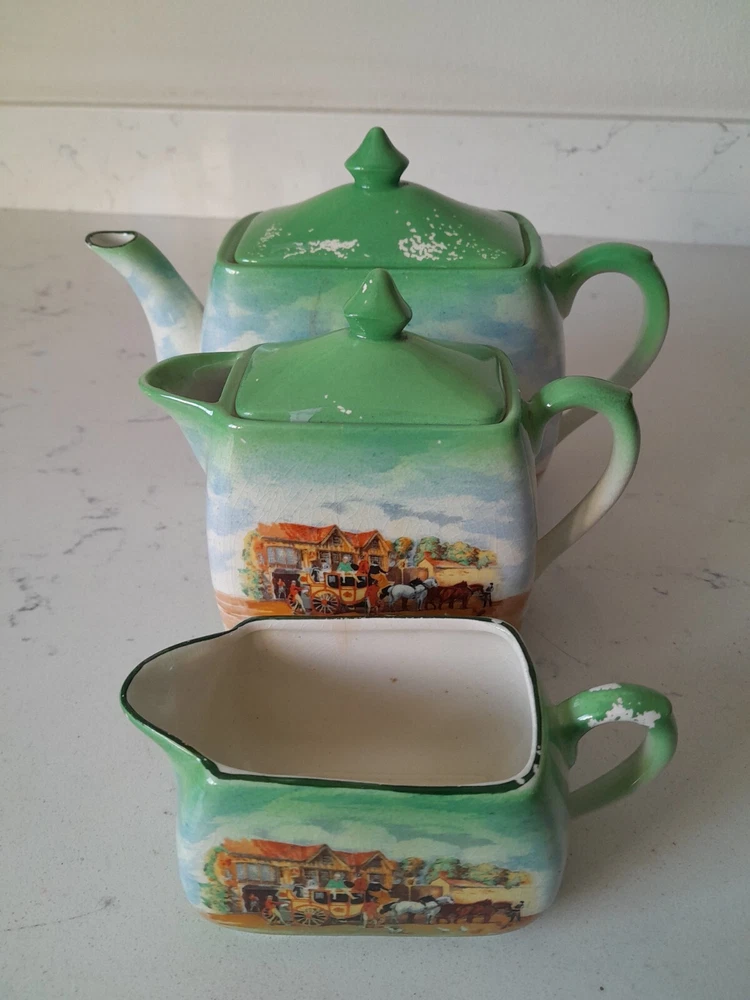 This is a rare vintage 3-piece tea set from Empire Ware in the Dickens Days pattern. Made in the United Kingdom, the set features a multicolor design on bone china with a glazed finish. It includes a teapot with lid, along with a creamer, both featuring 3 compartments. This original set is a charming addition to any tea collection. Some wearing to original finish as Shown. No chips.