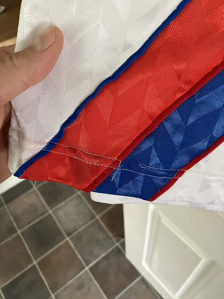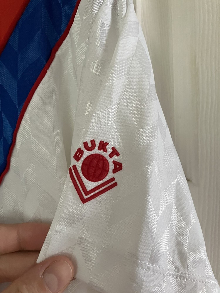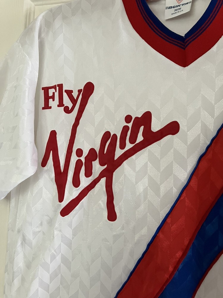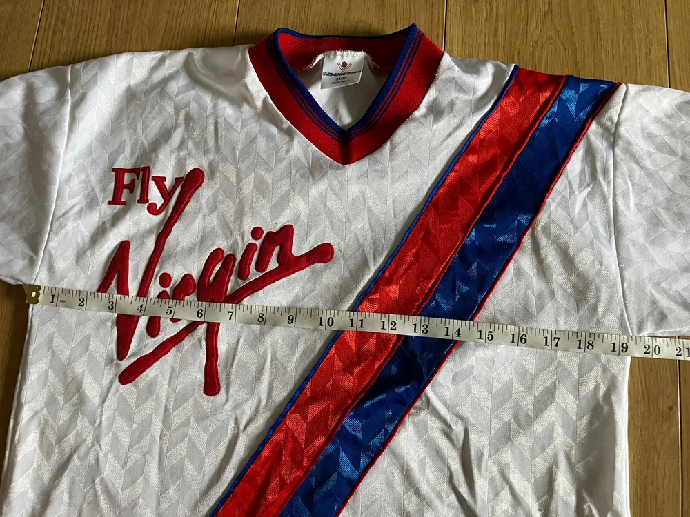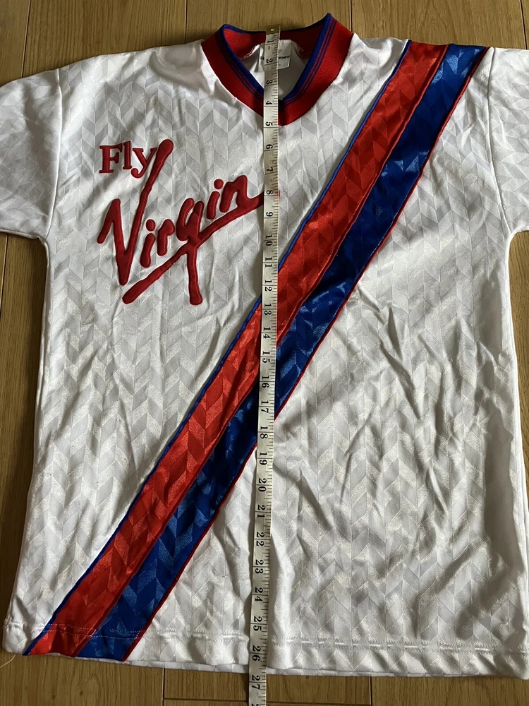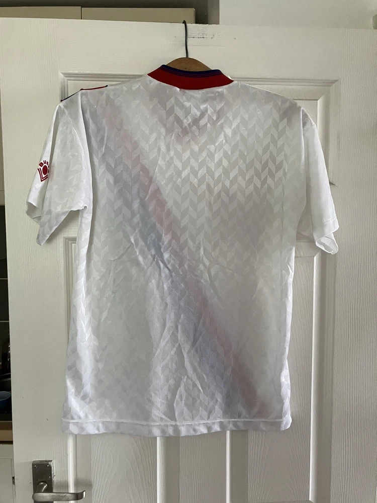 Rare Vintage Bukta Crystal Palace 1989/1990 Away Shirt Size 34/36 Small. An absolute beauty of a shirt, the famous palace sash which is an absolute classic among fans. Considered to be one of the favourite away kits in history. You may be thinking where is the badge? I certainly was but I’ve been told this kit had the club badge on the shorts and you had to sew or iron the badge on yourself. The person who owned this shirt obviously chose not to. I checked other shirts and it seems the badge is frequently on a different area on most shirts and not in the identical place on other shirts so it would make sense. Obviously if anyone has more information I would be grateful. Everything else is identical so that reason would very much make sense to me. While it would be nice to have the badge on for me it gives it a unique feel and you can’t beat an original shirt with some history behind it. This is a used item and given it’s age is in excellent condition, tried to take good pictures for condition. Abit of loose stitching to the bottom right corner but small bobbling and stitching loose are to be expected given the age. Label states 34/36 and I’ve added measurements to pictures. I would say it was a size small and the shirts were quite fitted back then. From a smoke and pet free home. Any questions feel free to get in contact and I’ll help as best as I can!