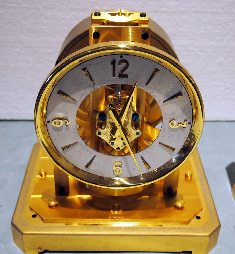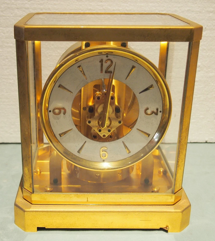 Up for the auction is a very fine vintage mantel clock by: Jaeger-LeCoultre .This Atoms clock is fully stamped and it is 15 jewels with serial #: 37953.5 panel glass and gilt metal cover is removable. The clock is in very good working condition .It shows the age on the outside metal patina that can be cleaned .The total height is:9 1/4" and the base measures:8 1/4" by 6 1/2".The clock also has a lever for adjusting slow or fast on the top of the clock. RECENTLY HAS BEEN NAMED THE BEST 5 STAR JEWELRY & ANTIQUE SHOP IN BEVERLY HILL ,CALIFORNIA. OR YOU CAN VISIT OUR NEW LOCATION WORLD FINEST ANTIQUES IN BH,CA. CLICK HERE TO VISIT MY OTHER EBAY LISTINGS FOR MANY FINE PIECES! UPON YOUR REQUEST, WE DO APPRAISALS . FOR A WIDE VARIETY OF FINE ANTIQUES, TAKE A LOOK AT MY OTHER AUCTIONS. HAPPY BIDDING!!