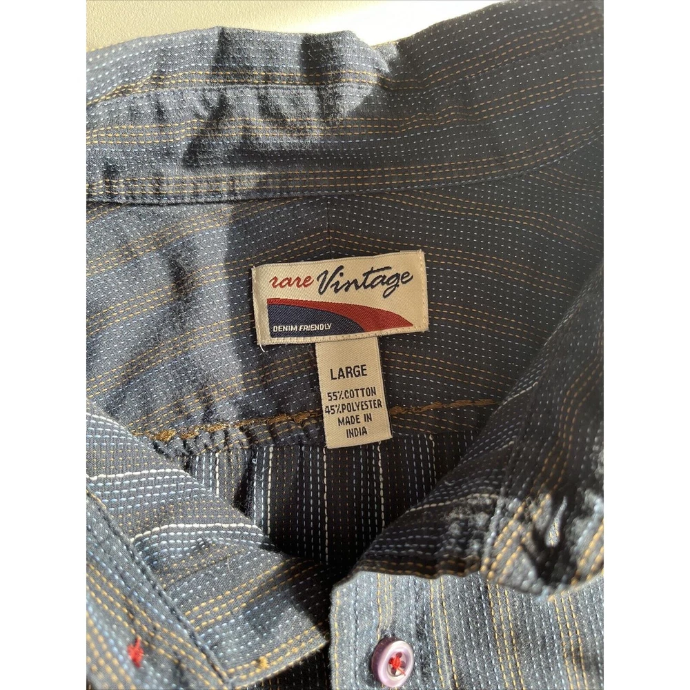 This rare vintage men's button-down shirt features a blue and tan striped pattern and long sleeves with buttoned cuffs. The collared neckline and buttoned closure add to the classic and versatile style, making it perfect for travel, casual outings, or business settings. The shirt is machine washable and made of a comfortable knit fabric consisting of polyester and cotton. It also includes accents such as pockets, and the cowboy-themed design adds a unique touch. The shirt is labeled as a size large and has a regular fit for a comfortable and flattering look. This shirt is a great addition to any wardrobe and is perfect for the winter, fall, and spring seasons. Excellent condition! See photos for measurements.