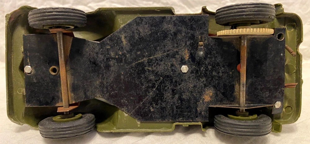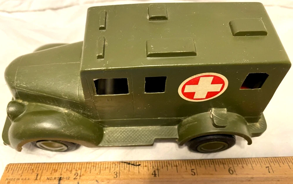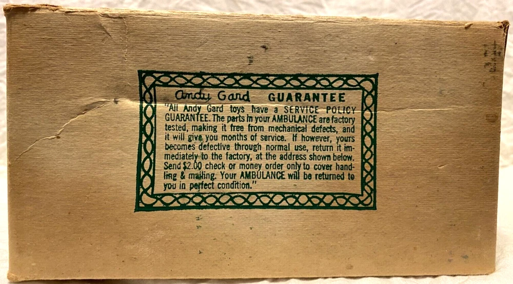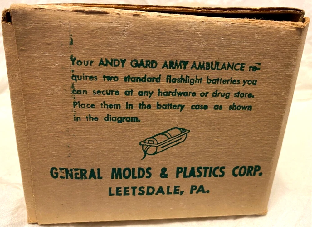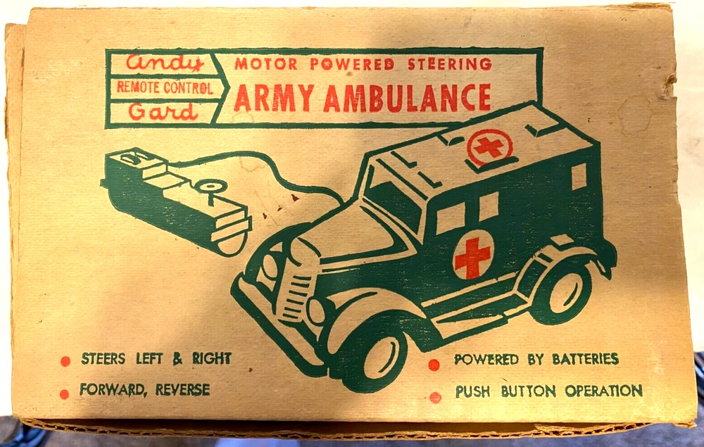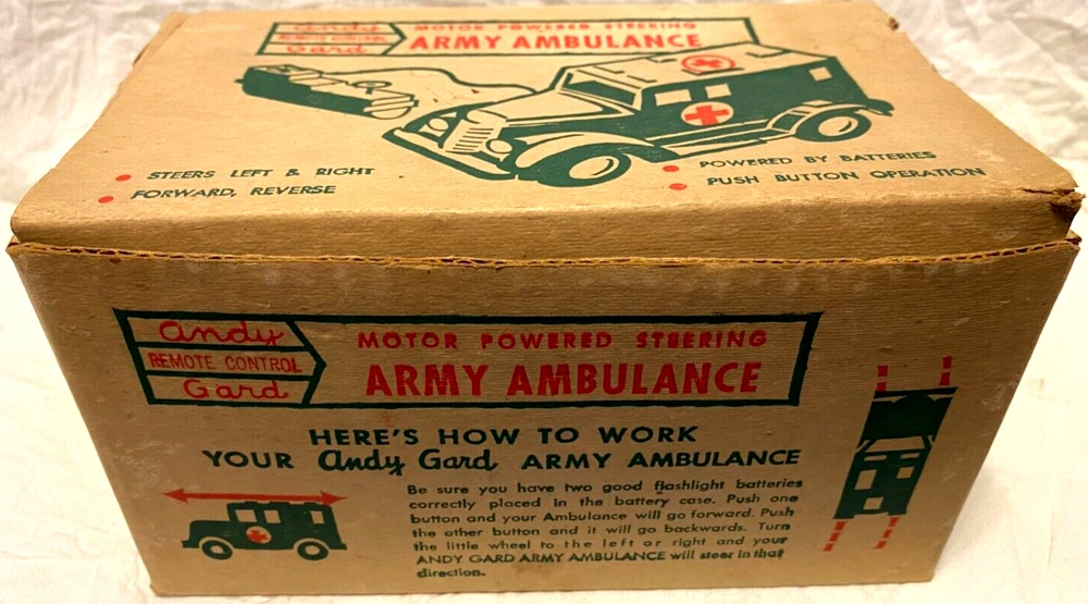 Wow! This could have been an awesome Rare, Vintage find, if the Remote Control & cable were attached. However, it's still a great find to have just the Toy and it's original Box. Research reveals it is a 1950's/60's Andy Gard Remote Controlled Army Ambulance with the cable & battery compartment missing. Take a look at the pictures. The Ambulance itself is in Good shape. It appears someone attempted to clean the right side with a cleaning product that didn't like plastic. It is made of plastic by the General Molds & Plastic Corp., Leetsdale, PA, right here in the USA. The Box is still in pretty good shape, except for time discoloration. This is still a Collectors item & could be used for parts. Smoke Free Environment Stored for 25+ years (Seller Cat.#0341)