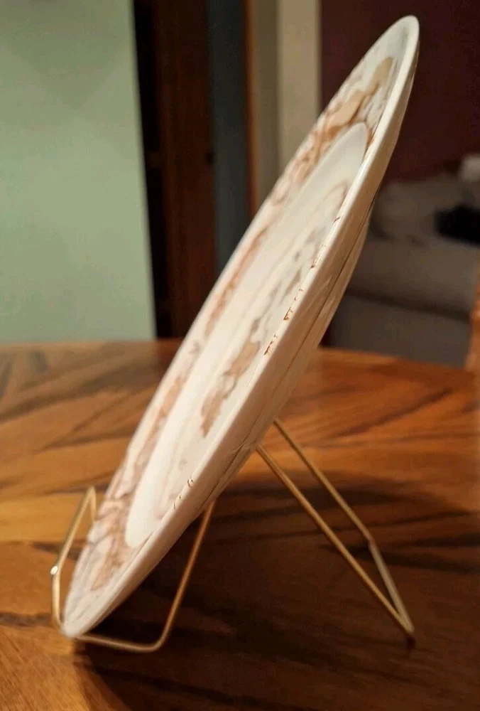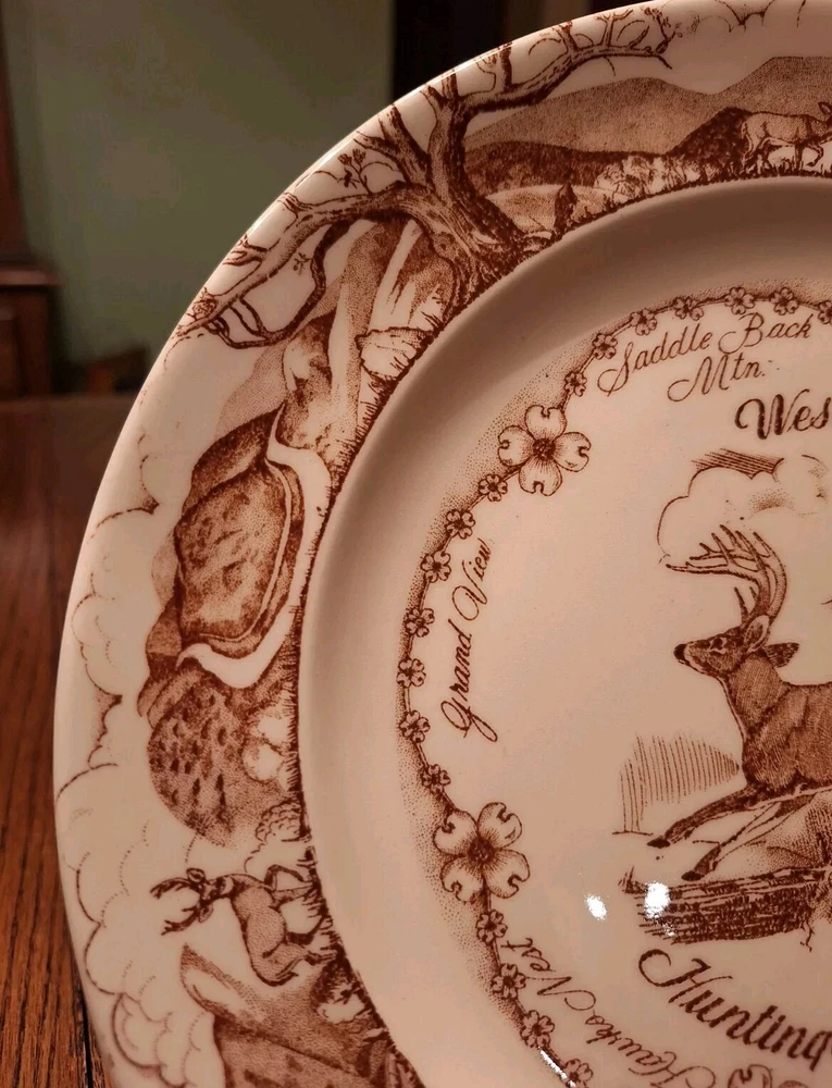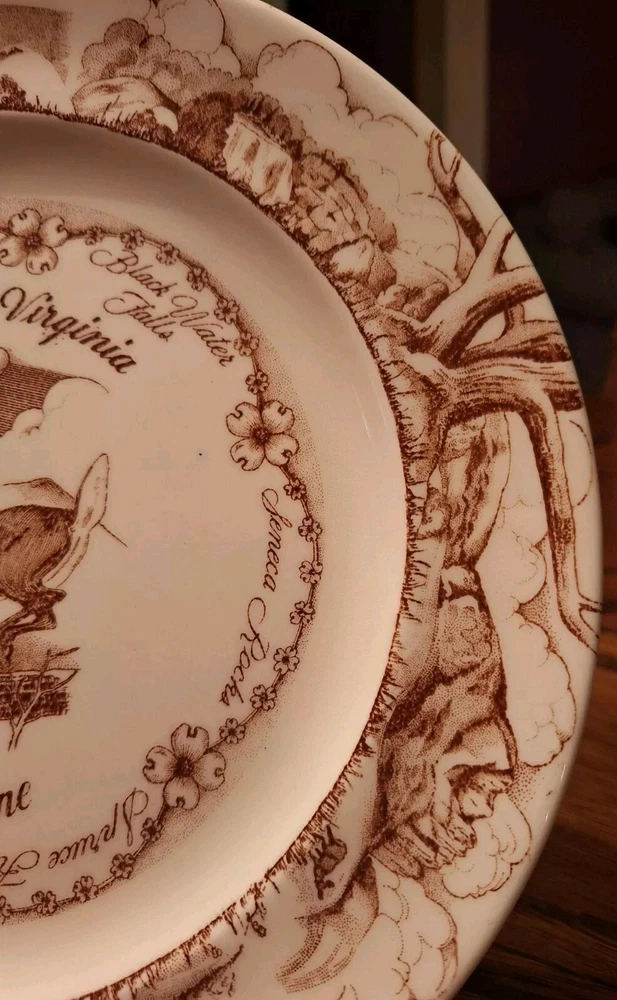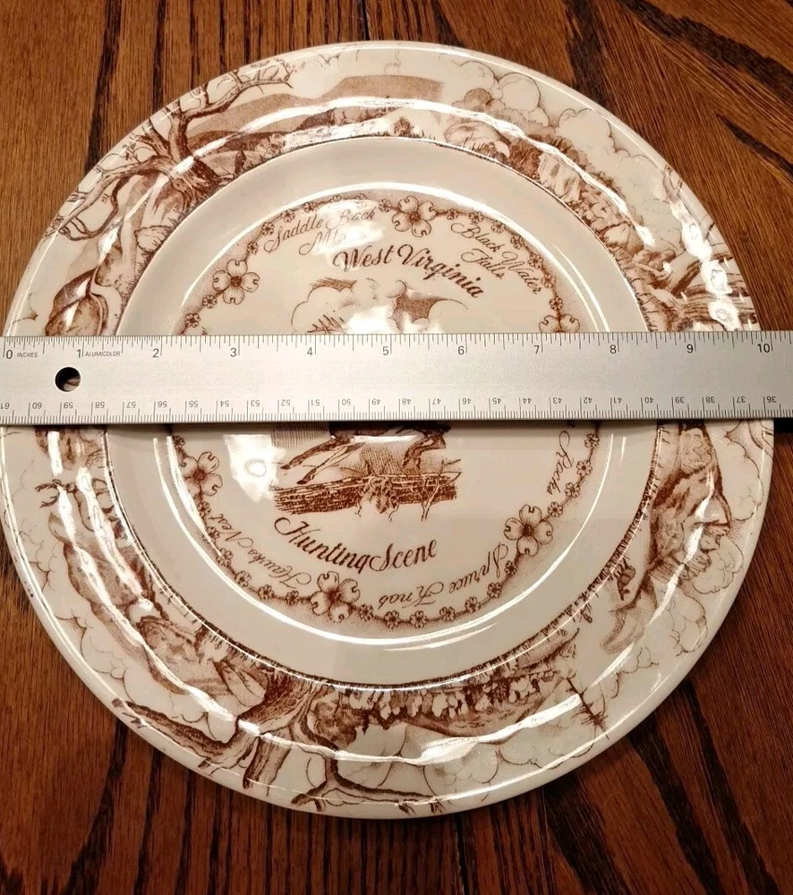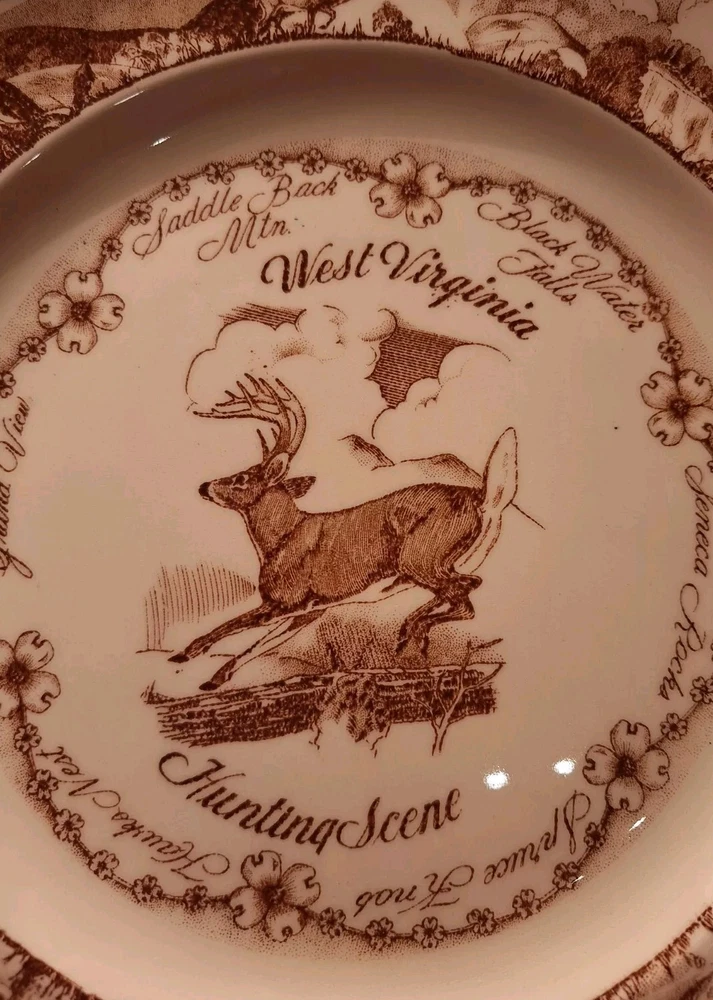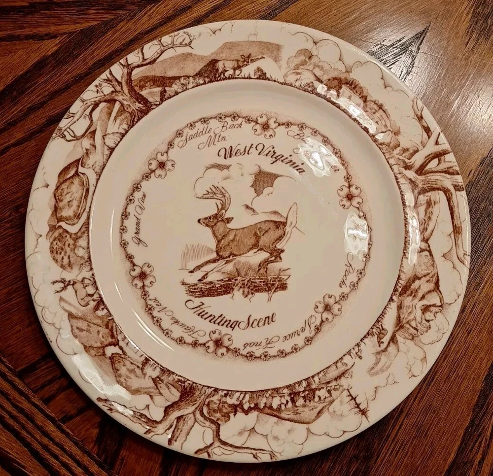 This rare West Virginia collector plate features a stunning hunting scene with Seneca Rocks and Black Water Falls. The round, 10-inch plate is made of high-quality ceramic and boasts a unique transferware production style. Laurel China branded this vintage piece, which is perfect for any decorative or hunting-themed collection. The plate is in great shape and ready to be displayed in your home. This is a great plate in great condition. There are some marks on the back where a plate hanger was and a couple small blackish dots on the front. Please see in photos. Stand not included