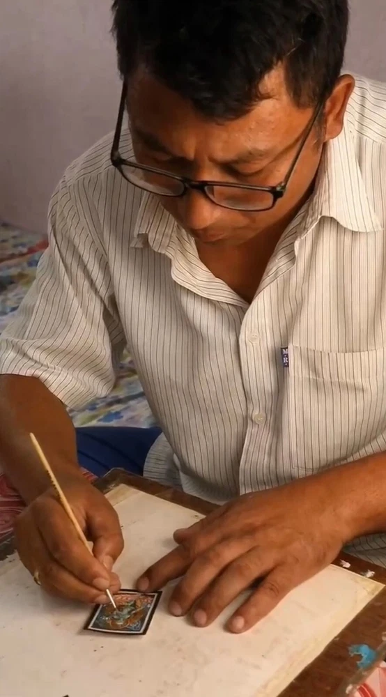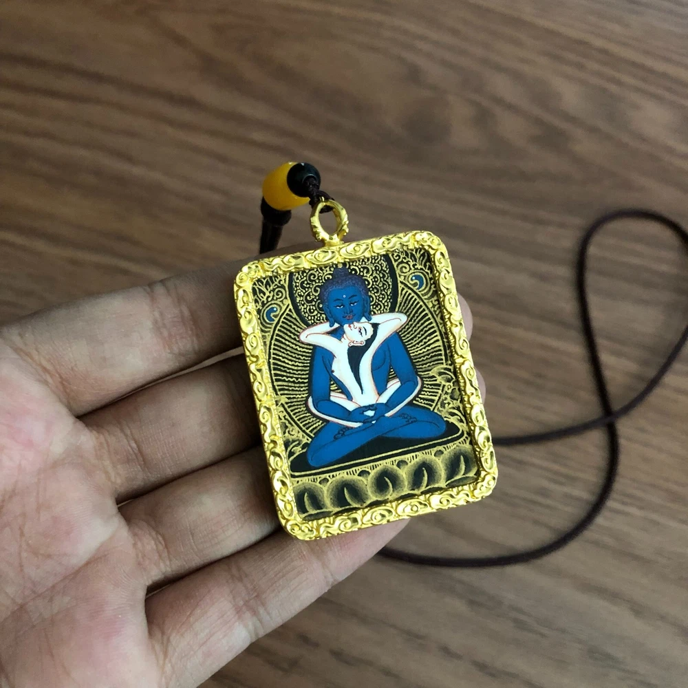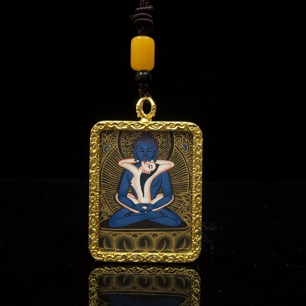 ~~ Buddha Shakti Thangka Pendant~~ Pendant thangka are believed to bring internal peace and good luck within one and family. Buddha Shakti is deep blue in color, symbolizing the sky or emptiness of mind. Samantabhadri or buddha’s consort is white in color, symbolizing the aspect of the clarity of our mind. The male female of Adi Buddha in union depict the unity of emptiness and cognizance. Samantabhadri is completely nude and while not ornaments symbolizing that she is free from all thought constructs. It means that enlightenment can be realized only when we are free from thought constructs and one perceives the empty nature of the mind directly. [Size = 4.5cm x 3.5cm] Material Used for Thangka Art: • Cotton Canvas • Natural Pigments and colors • Gold leaf ~Genuine 100% hand-painted from Himalayas Please feel free to contact me if you have any question regarding the painting.