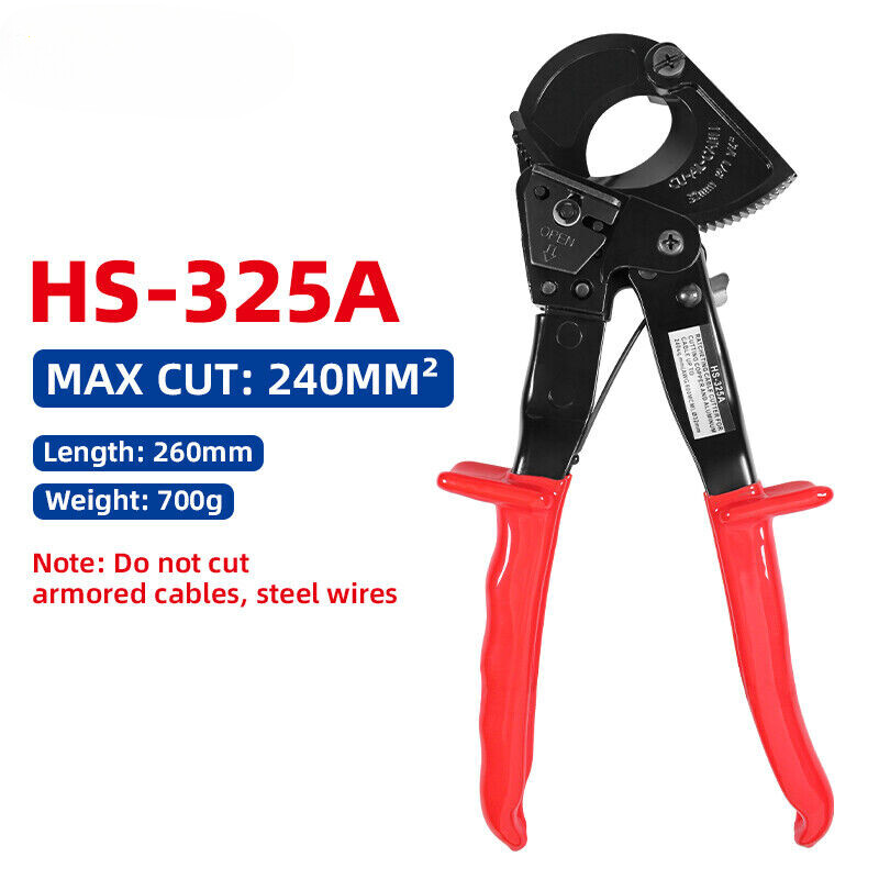 Ratchet Cable Cutter Copper Aluminum Shear Ratcheting Wire Cut Plier Hand Tool Descriptions: Ratchet Cable Cutter Copper Aluminum Shear Ratcheting Wire Cut Plier Hand Tool Product Description Type: Round Nose Material: Carbon Steel Handle: PVC Model Number: HS-520A, HS-325A (Optional) Plier Style: European Handle Style: Straight DIY Supplies: Electrical Application: Cutting Features: Multifunctional Country of Manufacture: China Note: Only be used for ordinary copper/aluminum cables, can't cut armored cables and steel wire. Features: - The rubber grip handles increase stability, and can be locked for safety when not in use. - Easily to cut with forging blade and long-life time. - The precision blades with optimized shape for clean and smooth cut. - The compact design can be used in tight areas. - It is ideal for the auto body repairer or the home garage DIY'er. - Easy to store and transport. Package Included: 1x Ratchet Cable Cutter Payment Delivery details Terms of sales About us Warranty & Return / Contact us Payment PayPal For PayPal eCheck payment, PayPal usually takes between 3 and 5 business days to clear the payment. We can only ship out order after the payment is cleared. VISA / MATERCARD / AMEX / DISCOVER (U.S. Credit Card Only) If card's registered billing address is not in U.S., please use PayPal as payment gateway. Purchase multiple listings? Simply commit to buy all items, and process the payment from the last checkout. For additional combined shipment request, please feel free to contact us . Delivery details SHIPPING & HANDING: Order will be shipped within the same day or 2-3 working days after the payment is received. Order placed on the weekends will be shipped out on next Monday or Tuesday (holiday excluded) . Local pickup is not available and w e regret that we can not be responsible for any wrong or undeliverable addresses. U.S. DOMESTIC ORDERS: We use USPS,FedEX & UPS as regular forwarder, f or order shipped to California address, we are required to collect CA sales tax. Order with UPS shipping method completed (payment is received) before 9 AM PST will be shipped out on the same day (weekends or holidays excluded) We do not ship to APO, FPO, AK, HI, PR with the same domestic shipping rate via USPS mail, unless charged additionally. ATTENTION FOR ALL INTERNATIONAL ORDERS: Buyer is responsible for any applicableVAT duty, clearance fee and local tax, based on regulation of importing countries. Terms of sales Please leave Positive Feedback and 5 Star Ratings for us if you are satisfied with our products and service, and we will do the same for you !!! =) YOUR SATISFACTION IS OUR HIGHEST PRIORITY. Please contact us if you have any questions or requests about our products or service. We are alwa ys glad to assist you and stand by our products. About us Welcome to our store. We are a reputable business in Southern California since 2012. With our experiences and relationship, we are able to offer quality products and competitive price to our customers. Please purchase with confidence. We carry the most variety of new replacement batteries, chargers, headsets, earpieces, speaker microphones, and accessories for Two-Way Radio, Ham Radio, Portable Radio; and new replacement batteries and chargers for Power Tool, Cordless Drill, Grease Guns, and etc. We continually strive to update and improve our product line. If there is anything that you are tying to find, or if you need help to find the right power tool replacement batteries, please feel free to contact us. ("Ask a question" located on the bottom of our eBay listing) All brands, trademarks and registered trademarks are the property of their respective holders. Warranty & Return / Contact us We guarantee against any defective products. A full refund can be provided for any defective or misrepresented products within 30 days. There is no restocking fee in this case. We provide 30 days money back on non-defective, undamaged, unused and resalable products. Restocking fee and other fee may apply upon the condition of returned products. Shipping and handling fees are non-refundable. Product is not eligible for refund after the 30 - day refund period has expired. Each product carries limited replacement warranty period stated in each listing's item description. Customer will be responsible for the return shipping. All returned products (Replace or Refund) have to obtain a RMA # (Return Merchandise Authorization #) prior to return. Any returned product without a RMA # on package will not be processed. To obtain a RMA #, please contact us through eBay message system with your eBay user ID, eBay item ID #, and a brief description about your item condition and/or service requested. We will work on resolving your particular case ASAP. The warranty does not cover damage caused by accident, abuse, neglect, modification, alteration, misuse, repair, modification or physical damages. Warranty will be provided to the original purchaser only. The warranty will not renew once a replacement has been made . This means that a warranty replacement item will not have a brand new warranty period. Please allow us to resolve any possible case. Our greatest mission is to provide the best customer service.