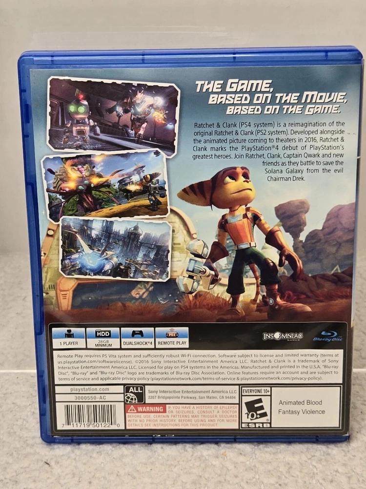 Game is in good working condition and was closely inspected and tested. See pictures for full details! Includes case but no manual insertl. Will be shipped in a protective bubble mailer. All downloadable codes should be considered either expired or no longer eligible. Immerse yourself in the thrilling world of Ratchet & Clank on the Sony PlayStation 4. This action-packed game, released in 2016 by Insomniac Games, is perfect for players of all ages with an E10+ (Everyone 10+) rating. Join Ratchet and his trusty companion Clank on their journey through the galaxy to save the universe from the evil Dr. Nefarious. This game, part of the popular Ratchet & Clank series, is region-free and comes with a case and game. The publisher, Sony Interactive Entertainment, has done an excellent job of creating an immersive game that will keep you engaged for hours. Get ready to embark on an exciting adventure with Ratchet & Clank and save the universe today!