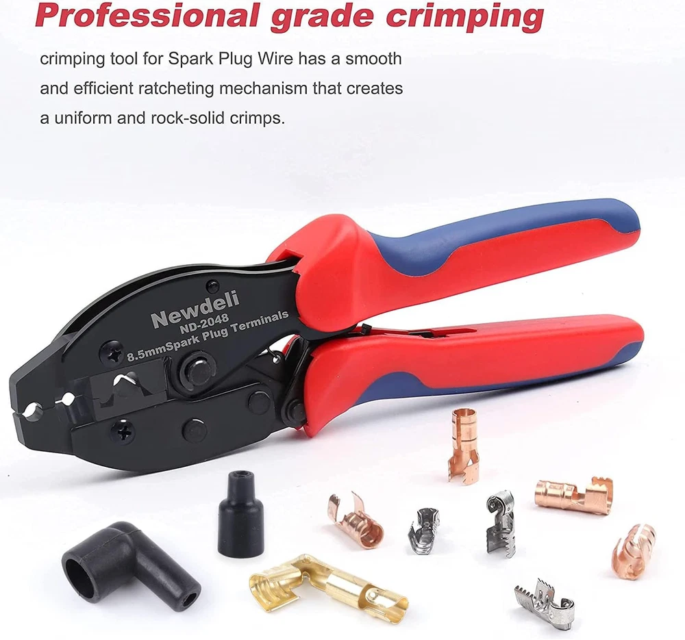 Ratchet Spark Plug Wire Crimper Set, Newdeli 25Pcs Red, Blue, Black Product Details Brand: Newdeli Color: Red, Blue, Black Item Weight: 0.93 Kilograms Handle Material: Rubber Grip Type: Ergonomic Manufacturer: Wenzhou Yuxuan Electronic Commerce Co.,LTD Part Number: 2048-25PCS Item Weight: 2.05 pounds Package Dimensions: 11.38 x 5.16 x 2.91 inches Country of Origin: China Item model number: 25Pcs Spark Plug Wire Crimper Set Style: ND-2048 with 24Pcs Terminals Included Components: Spark Plug Wire Crimper, Spark Plug Coil Terminals Batteries Included?: No Batteries Required?: No Brand: Newdeli Color: Red, Blue, Black Item Weight: 0.93 Kilograms Handle Material: Rubber Grip Type: Ergonomic 【MULTI-FUNCTION Spark Plug Wire Crimping Tool】The wire crimping tool works on spark plug wire diameter is 8.5-8mm. Use this wire crimping tool to quickly and effectively strip, cut, and crimp, saving time and effort. 【Package Include】Spark plug wire crimping tool kit includes a spark plug crimping tool, 24pcs 180 degree/90 degree/straight spark plug coil terminals, diameter is 8mm, fit for 8mm wire. They are made of high quality brass, with high electrical conductivity, reliable and stable. Black rubber boots are matches well with terminals, will keep them from dirt and moisture. 【PRECISE JAWS】 Well polished jaw and ratchet mechanism ensure high-quality crimping effect after repeat crimp, the stripper will work great and cut just enough insulation to not damage the conductor. 【RATCHET DESIGN】ND-2048 spark plug crimping tool for precise and repeatable crimp, preventing over crimping, the ratchet crimper tool has an adjustable compression wheel that adjusts automatically while reducing the strain it puts on your hand and elbow. 【PRESSURE REGULATING AND FORCED RELEASE DEVICE】:The crimping force of spark plug wire pliers can be adjusted according to different crimping terminals, giving appropriate crimping force to one-step crimping. When you want to stop crimping halfway through, just press this device to loosen the jaws.