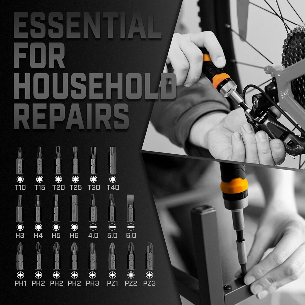 【Precision & Versatility for All Repairs】: Our Screwdriver Set features 21 pcs 1/4" driver bits and 20 pcs precision bits(Security Torx, Phillips, Flathead, Pozi, Hex, Tri-point), ideal for both everyday household repairs and intricate electronic maintenance. Perfectly tailored to meet diverse repair needs. 【Strongly Magnetized Bits for Efficient Work】: The all screwdriver bits are powerfully magnetized to securely hold small parts, making work easier and faster. This feature is particularly valuable for precision tasks, making these tools an amazing cool kits for man 【Ergonomic Efficiency with Ratchet Function】: Designed with a comfortable grip and an efficient ratchet mechanism offers three settings (forward, reverse, and locked), the Ironcube Screwdriver Set enhances work productivity, ensuring ease of use for prolonged tasks and tight spaces. 【Compact and Portable for Easy Storage and Accessibility】: All components are neatly organized in a durable, compact case (8x6x2 inches). This portable solution is perfect for storing in your home, car, or office, ensuring that you always have the right tools at hand. 【High-Quality & Worry-Free】: IronCube Screwdriver Set, engineered with Premium Chrome Vanadium steel, ensures durability and efficiency. Backed by a 24-month hassle-free return policy, it's built for reliability and customer satisfaction. Product Description The video showcases the product in use. The video guides you through product setup. The video compares multiple products. The video shows the product being unpacked. Ironcube 56 in 1 Multi Tool Screwdriver Set - the epitome of versatility for every scenario. Whether it's home repairs, office tasks, or intricate electronic work, this set adapts to all. An ideal gift for men, father or DIY Lover. it's the essential tool for everyday challenges. Comfort & Non-slip Ratchet Screw Driver Designed with a comfortable grip and an efficient ratchet mechanism, the Ironcube 56 in 1 multi tool screwdriver Set enhances work productivity, ensuring ease of use for prolonged tasks and tight spaces. Powerful Magnetized Bits For Speedy Installations Make your work a breeze with our screwdriver's super magnetic Bits! It grabs screws tight, so no more fumbling. Plus, it's great for picking up those tiny parts that fall into hard-to-reach spots. Perfect for quick fixes and DIY projects – a real time-saver! Why Choose Us Professional, Reliable, High-Quality Performance With 32 years of expert experience, our screwdriver has reached over 10.6 million users globally. We stand behind our product with a 24-month hassle-free return and exchange policy. Professional, Reliable, and built to last – this is our commitment to you. Versatile All-In-One Screwdriver Set Ultimate multi-tool screwdriver set, Standard Bits+Small Bits+Nut Driver All In One. Designed for versatility, it simplifies disassembly tasks with ease. Compact yet powerful, it's your go-to for tackling any size screw or nut. Your Professional Edge Elevate your craftsmanship with our all-in-one screwdriver toolset, designed for professionals. Featuring premium CR-V bits & sockets for ultimate durability and versatility. Compact, ergonomic, and precision-engineered to tackle any task, from intricate electronics to heavy-duty repairs. All-in-One Box Set Maximize efficiency with our All-in-One Box Set. Compact and portable, it organizes all essential tools in one place. Ideal for home, office, or travel, this set simplifies repairs and DIY projects, ensuring you're always ready for any task. Convenience in a box. Precision & Versatility for All Repairs 21 pcs Standard Bits Slotted:4mm(5/32"), 5mm(3/16"), 6mm(1/4") Phillips:PH1, PH2, PH2, PH2, PH3 Pozidriv:PZ1, PZ2, PZ3 Torx: T10, T15, T20, T25, T30, T40 Hex: 3, 4, 5, 6mm 20 pcs Precision Bits Slotted: 1.5, 2.0, 2.5, 3.0 Phillips:PH000, PH00, PH0 Torx: T5, T6, T7, T8, T9 Security Torx: T6H T8H T9H Hex: 1.5, 2.0, 2.5, 3.0, 4.0 Tri: Y1.5, Y2.0 10 pcs 1/4" Drive Sockets 10 pcs 1/4" Drive Sockets : 4, 5, 6, 7, 8, 9,10, 11, 12mm. 1 pcs Socket Adpter Drivers and Accessories 1 pcs Bits Holder For Regular Bits 1 pcs Bits Holder For Precision Bits 1 pcs Multi-bit Ratchet Screwdriver 1 pcs Multi-bit Precision Screwdriver Application Scenarios Meet every challenge with the 56 in 1 Multi Tool Screwdriver Set. A must-have for home improvement, office repairs, and electronic fixes. Essential for computer repair, it's the ideal men's tool kit, fitting perfectly into any basic home tool set. What is the overall weight and size? The case's size about 8x6x2 inches, and 1.5 pounds (0.68kg) wetght Does the screwdriver bit have magnetism? Yes, The all screwdriver bits are powerfully magnetized to securely hold small screws, making work easier and faster. Does this screwdrivers come with a ratchet function? Yes, it has a ratchet function with three settings: forward, lock, and reverse. What material is the handle of this screwdriver The material is a high-strength PP core with TPR soft rubber coating, which prevents shattering and also provides a comfortable grip. What is the Return and Exchange Policy for this wrench set? This product comes with a lifetime Return and Exchange. If you encounter any issues, please feel free to provide us with your feedback.
