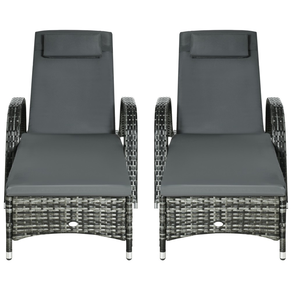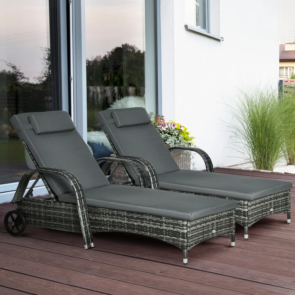 Features: - Pool furniture set with two chaise lounge chairs - Select between five backrest angles, including flat - Wheels to move them from the garage to the pool to the patio with ease - Tropical handwoven charm with water safe build - Heavy-duty steel frame offers a strong weight capacity - Soft, thick cushions - Built-in armrests - Assembly required - NOTE: Keep cushions out of the rain Specification: - Color: Mixed Gray, Charcoal Gray - Material: Steel, PE Rattan, Polyester - Lounge Dimensions: 78.75" L x 28.75" W x 40.5" H (Fully Flat Size) - Seat Dimensions: 22.5" W x 47.25" D x 11.75" H - Backrest Size: 31" L x 19.75" W - Backrest Height: 11.75" - 40.5" - Weight Capacity: 352 lbs. (Lounge Chair)