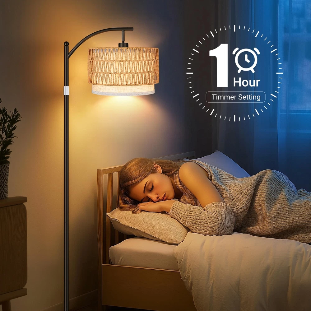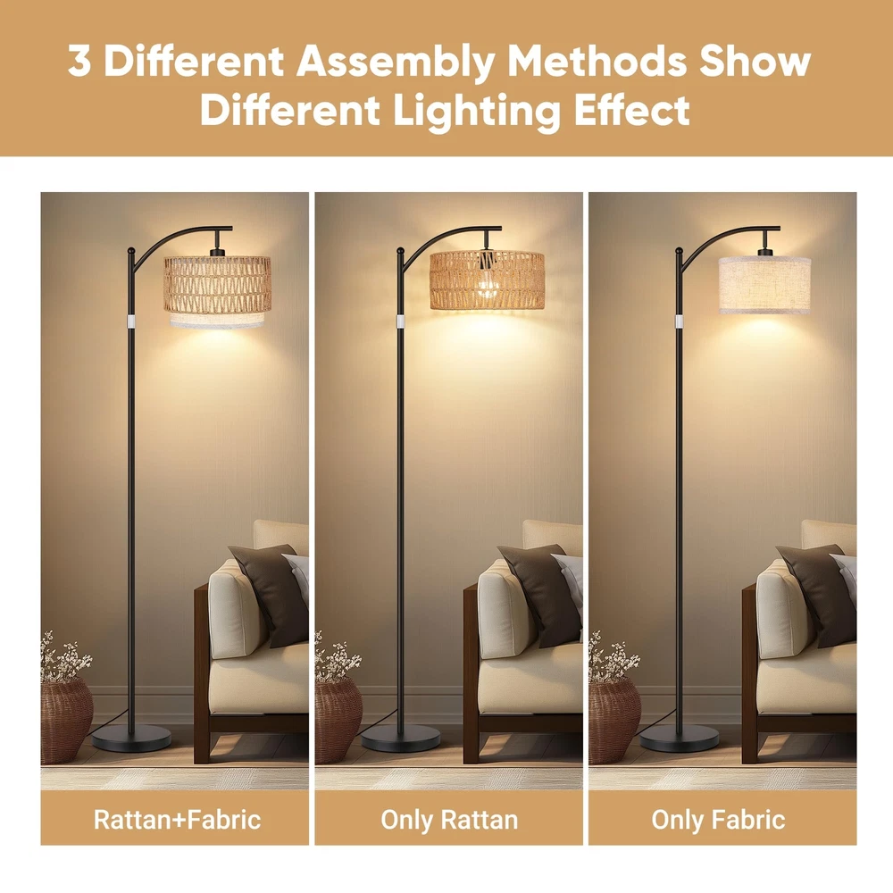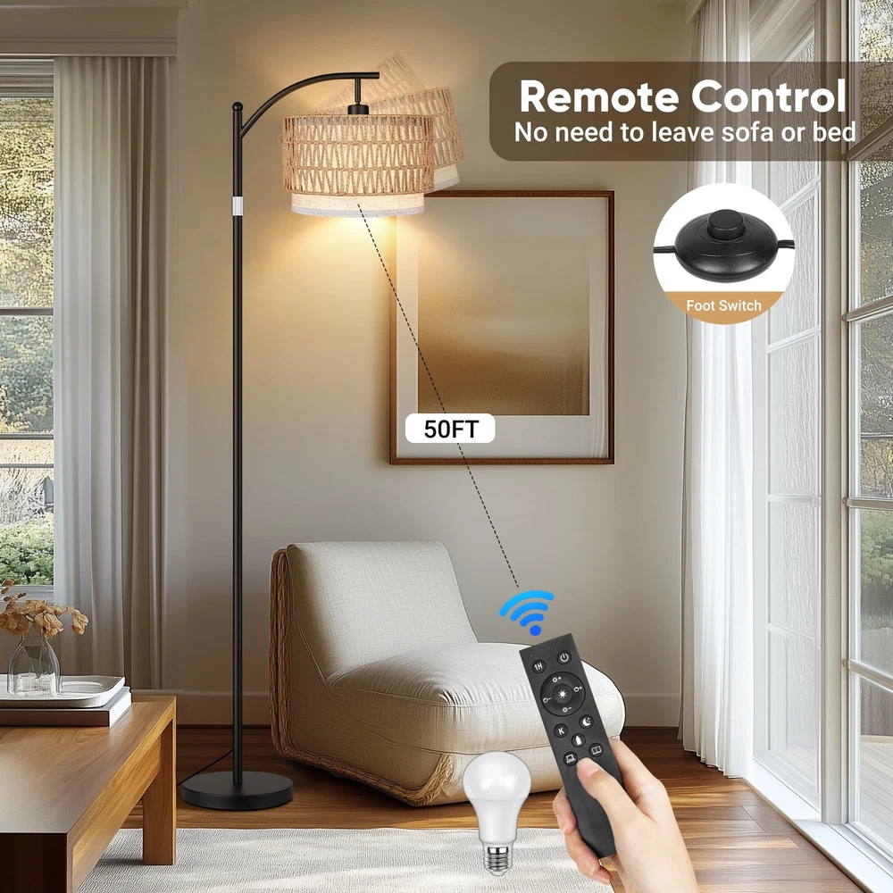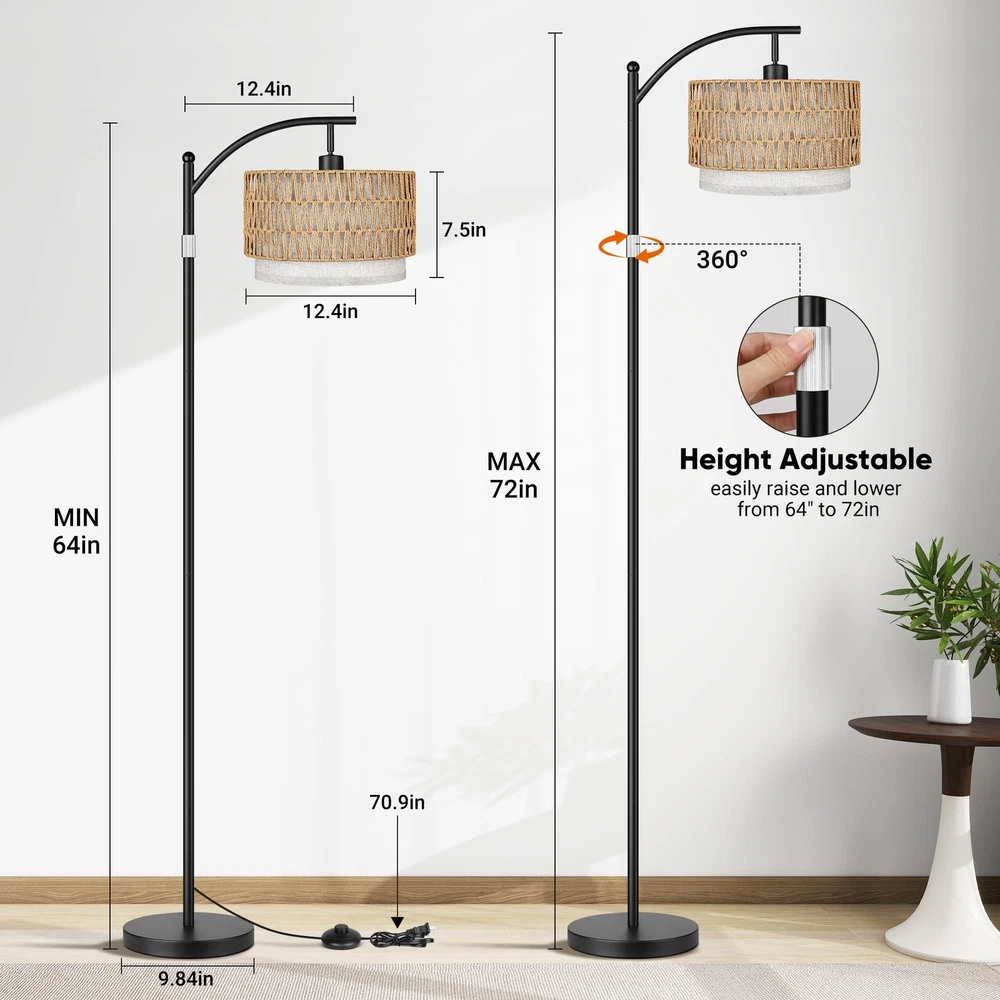 3 Color Temp Adjustable & Stepless Dimmable:This adjustable tall floor lamps has stepless brightness adjustment (from 1%-100%), and stepless color temperature: 3000K-6500K, which allows you to change the ambiance of the room with just a press of the remote. This dimmable floor lamp also have pre-set modes offering various scenes such as: read, nursery, work and night light. The memory function can help you remember the last setting. Stable Base and Height Adjustable: Retractable pole allows you to adjust the height of the tall lamp. You can adjust the height of the standing light up and down between 64 inches to 72 inches according to the height of your desk and sofa. What’s more, this living room floor lamp is equipped with a heavy metal base to resist shaking or accidental tipping, keep the safety of every family member Dual Control via Remote Control or Foot Switch: the combination of traditional foot switch and smart remote control makes the floor lamps more convenient .The control range of the remote can reach 65ft, allowing you to adjust the rustic floor lamp without any hassle.Rattan tall lamp ideal for installation in any room of your home, and this bohemian floor lights will satisfy all your needs for interior lighting and furniture ambience Rattan & Fabric Double Lampshades:The black floor lamp comes with removable hand-woven rattan and fabric double lampshades, which can be freely displayed according to your preference. Innovative design offers diverse options for every home designer, this adjustable floor lamp ffits seamlessly into any decor and is suitable for such style as contemporary, vintage, mid-century, traditional, farmhouse and so the like Easy to Install: Not challenging to install -Takes less than 10 minutes to assemble, and no tools are required. Our boho standing lamp is a stable design, making it stronger and more durable than other floor lamps on the market. Don't hesitate to get in touch with our customer service if you encounter the product problem