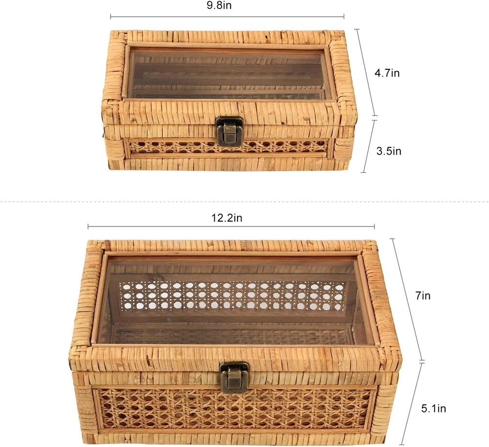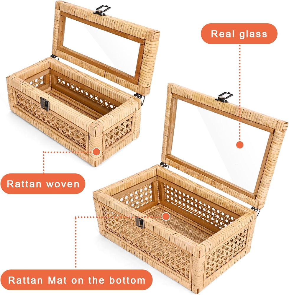 Love this rattan display box! The natural wood and woven rattan give it such a charming, boho-chic look, while the clear glass lid keeps items dust-free yet visible. Perfect for showcasing jewelry, keepsakes, or small collectibles—adds a cozy, handmade touch to any space. Sturdy and well-made, it’s both functional and decorative!