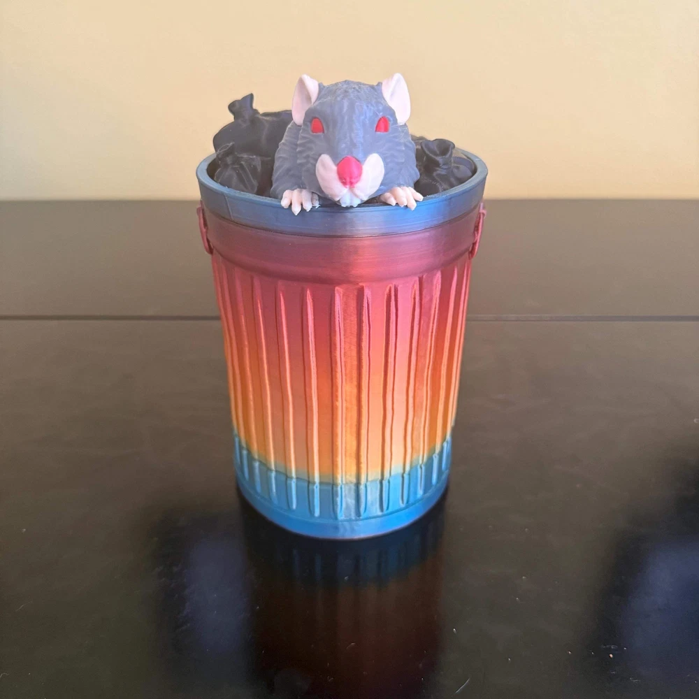 Rat trash can MTG Deck Box | Pokemon | YuGiOh | Commander | Deck Box for 100 Cards | Magic the Gathering | EDH Elevate your Magic: The Gathering experience with a personalized, stylish, and highly durable deck box designed to securely protect your cards. Crafted with a rigid 3D-printed design, this innovative accessory makes an ideal gift for MTG enthusiasts on any occasion. Keep your deck organized and ready for battle with this versatile and premium deck box! If you want something else added or a color not listed just message me and I will see what I can do. Holds a Commander deck (100 cards with double sleeves) in the Trashcan – All the space you need, no need to go dumpster diving else where. Bottom of the trash can also works to store dice. This file was not designed by me as it was made by https://cults3d.com/en/users/SneakyPandaDeckbox/3d-models Elevate your Magic: The Gathering experience with a personalized, stylish, and highly durable deck box designed to securely protect your cards. Crafted with a rigid 3D-printed design, this innovative accessory makes an ideal gift for MTG enthusiasts on any occasion. Keep your deck organized and ready for battle with this versatile and premium deck box! If you want something else added or a color not listed just message me and I will see what I can do. Holds a Commander deck (100 cards with double sleeves) in the Trashcan – All the space you need, no need to go dumpster diving else where. Bottom of the trash can also works to store dice. This file was not designed by me as it was made by SneakyPandaDeckbox