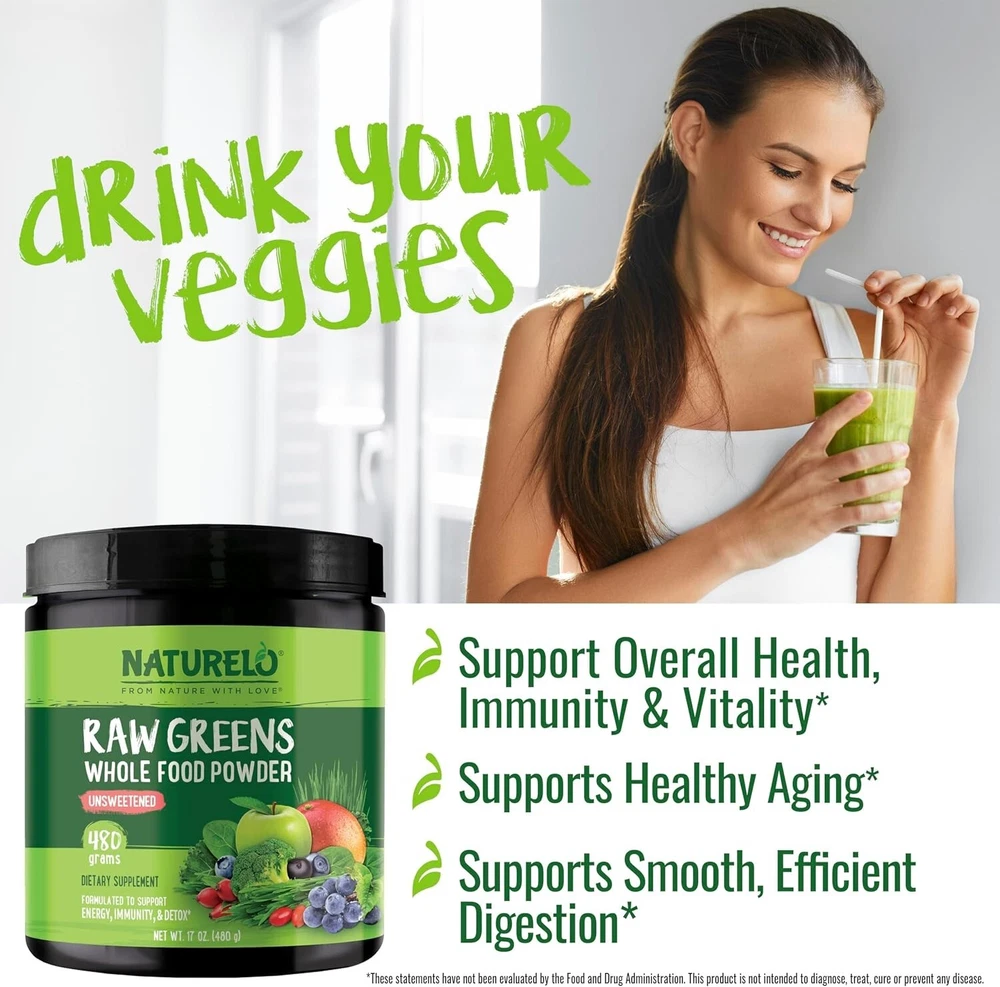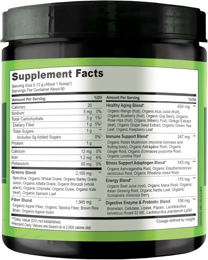 Raw Superfood Powder - Unsweetened - Boost Energy, Detox, Enhance Health - Organic Spirulina - Wheat Grass - Whole Food Nutrition from Fruits & Vegetables - 480 Grams Blend of 35 Superfoods: Made with nutrient-packed whole foods, including raw greens like spirulina, barley grass, alfalfa, wheat grass, chlorella, kale, spinach, and broccoli, and fruits like mango, acai, blueberry, and goji berries. Plant Power: Botanicals rich in naturally-occurring antioxidants and phytochemicals, including organic ashwagandha, reishi mushroom, ginseng, astragalus, nettle, grapeseed, ginger, rhodiola, maca, green tea, and echinacea. Whole Food Nutrition: Our whole food drink mix with greens, fruits and herbs is packed with ingredients chosen for their naturally-occuring vitamins, minerals and antioxidants to help boost your overall health and vitality*. Natural Benefits: Botanical blends to support healthy aging, immune health, energy, and a healthy stress response. Plus probiotics, digestive enzymes, and natural fiber to support your digestive health.* Drink Your Veggies: Ready to drink mix makes delicious vegan smoothies for an extra boost of real fruits and veggies on the go. Wild berry flavor naturally sweetened with monk fruit‚ with no added sugar, no GMOs, and no synthetic colors. (Packaging May Vary)