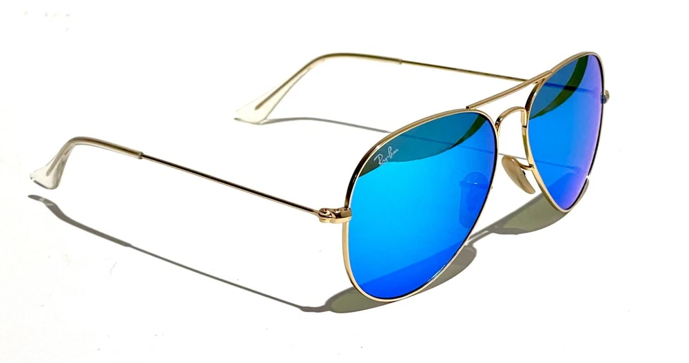 GUARANTEED 100% AUTHENTIC Product Details: Model code: RB3025 112/17 58-14 Currently one of the most iconic sunglass models in the world, Ray-Ban Aviator Classic were originally designed for U.S. aviators in 1937. Aviator Classic sunglasses are a timeless model that combines great styling with exceptional quality, performance and comfort. With a classic gold frame, you can see the world with optimum visual clarity and 100% UV protection. Frame material: Metal Frame color: Matte Gold Lenses: Blue Flash Mirror Shape: Pilot Size lens-bridge: 58 14 Temple Length: 135 Package includes: microfiber cloth, paperwork, Ray-Ban Sunglasses, case and outer box. Shipped with USPS First Class. thank you for shopping with us !!