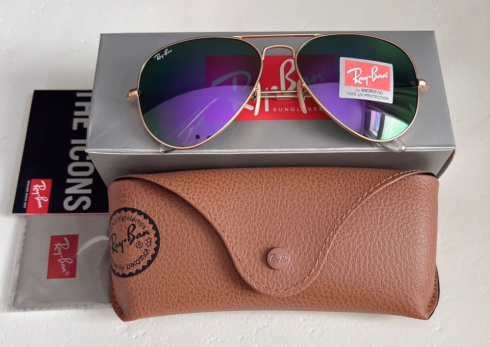 Temple Length: 135 mm Frame Color: Gold Lens Color: Purple Lens Material: Mirror Lens Technology: Mirrored UV Protection: UV400 Pattern: Solid Features: Oversized, Reflective Theme: 80s, 90s, American, Band, Beach, Biker, Classic, Designer, Motorcycle, USA Country/Region of Manufacture: Italy Department: Women Vintage: No MPN: RB3025 Brand: Ray-Ban Frame Material: Metal Model: Ray-Ban RB3025 Style: Aviator Type: Sunglasses Personalized: No