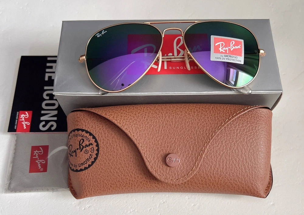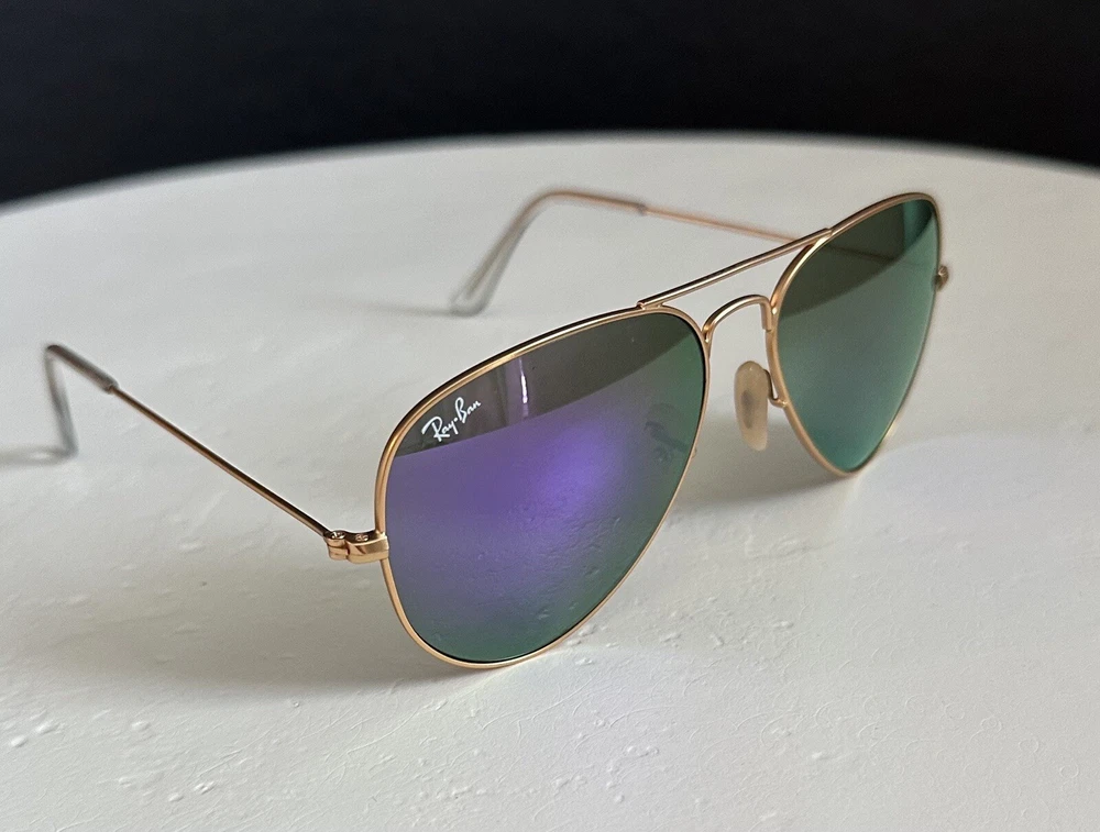 Model: Ray-Ban RB3025 Lens Technology: Mirrored Frame Material: Metal Pattern: Solid Temple Length: 135 mm Style: Aviator Department: Women UV Protection: UV400 Vintage: No Personalized: No Country/Region of Manufacture: Italy Type: Sunglasses Features: Oversized, Reflective Theme: 80s, 90s, American, Band, Beach, Biker, Classic, Designer, Motorcycle, USA Lens Material: Mirror Frame Color: Gold MPN: RB3025 Lens Color: Purple Brand: Ray-Ban