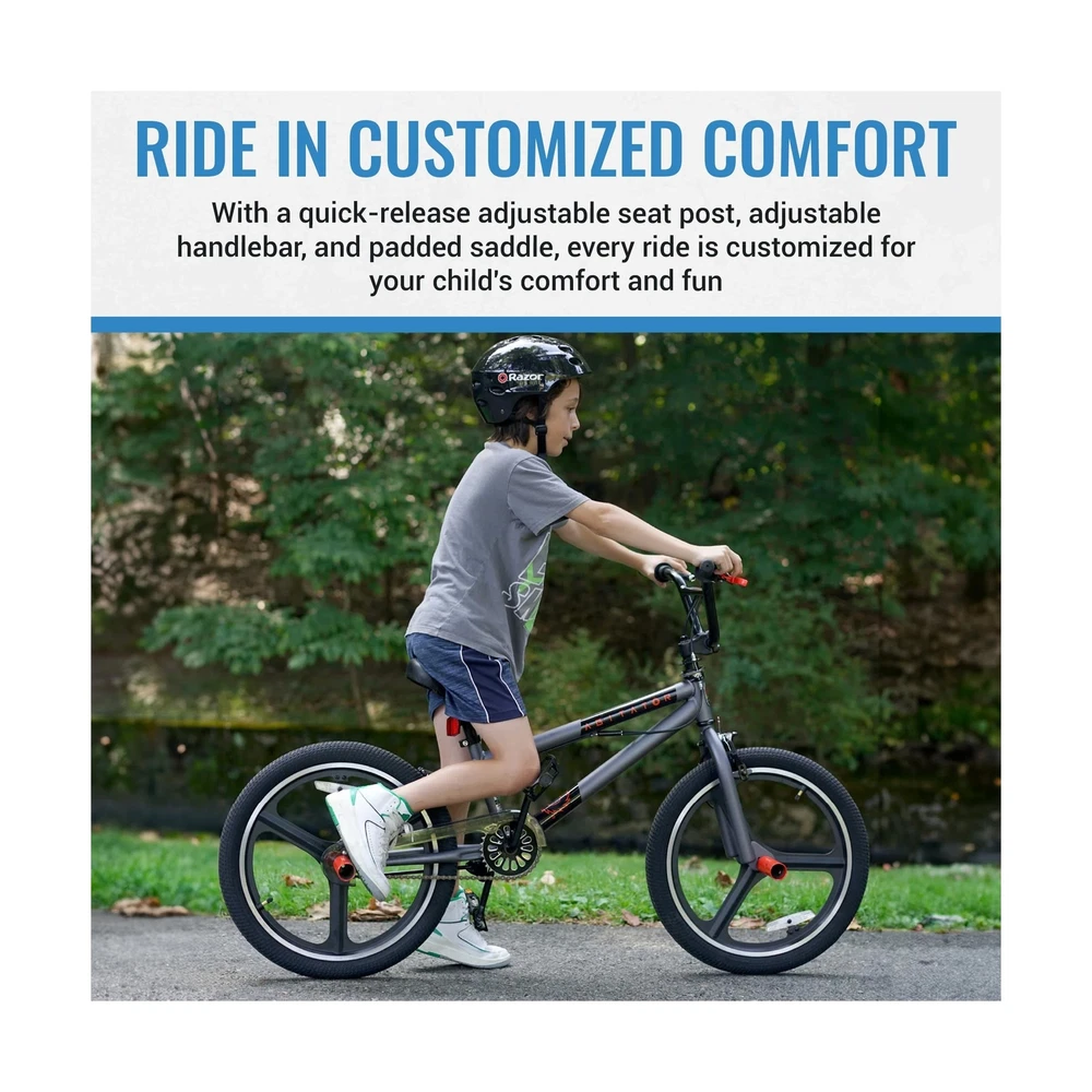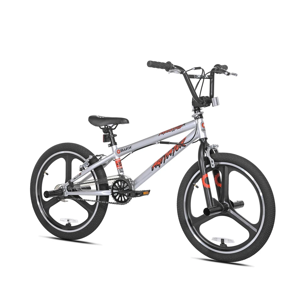 Razor Agitator BMX/Freestyle Bike - 20 Inch Bike for Boys - Quick Release Adjustable Seat Post - BMX Bicycle with Front and Rear Brakes, Steel Frame and Fork, and Front and Rear Pegs Description The Razor Agitator BMX/Freestyle Bike is perfect for young riders looking for a fun and stylish ride. With its sleek design and vibrant color, this bike is sure to impress in any park or neighborhood. The front and rear hand brakes provide excellent stopping power, while the 20-inch BMX/Freestyle tires and lightweight alloy mag wheels ensure a smooth and safe ride. Designed for comfort, the Razor Agitator features a quick-release adjustable seat post, adjustable handlebar, and padded saddle, offering a perfect fit for your child’s adventures. Built with a tig-welded steel frame and a hi-tensile steel fork, this durable 20 inch boy’s bike is made to handle the excitement of BMX and freestyle riding for years of fun. Features: Sleek and Cool BMX Bike for Kids: Featuring a sleek design with vibrant colors and cool front and rear pegs kids love, the Razor Agitator is a showstopper for BMX and freestyle fun. Simple yet stylish, watch your child smile ear to ear as they ride! Custom Comfort: This 20 inch BMX bike features a quick-release adjustable seat post, adjustable handlebar, and a padded saddle, ensuring the perfect height and comfort for your childs ridewhether practicing tricks or cruising the neighborhood. Ride with Confidence: Ensure your child's safety with front and rear hand brakes providing excellent stopping power, while the 20-inch BMX/Freestyle tires and lightweight alloy mag wheels ensure a smooth ride and enhanced braking efficiency. Safe and Sturdy: Sporting a tig-welded steel frame and hi-tensile steel fork with neon red accents, the Razor Agitator is designed to withstand rigorous use and tricks for years of fun in the park or neighborhood. Trusted Brand: Razor, the most trusted name in scooters since 2000, brings you this amazing kids bike! We design our products to grow with your kids, encouraging the whole family to step away from screens, get outdoors, and bond in new ways. Product Details: Bike Type: Multi-Use Bike, BMX Bike Age Range (Description): Kids Brand: Razor Number of Speeds: 1 Color: Silver Wheel Size: 20 Inches Frame Material: Alloy Steel Suspension Type: Rear, Front Special Feature: freestyle Included Components: Kickstand, Owner's Manual CPSC Reflectors Bike Type: Multi-Use Bike, BMX Bike Age Range (Description): Kids Brand: Razor Number of Speeds: 1 Color: Silver Wheel Size: 20 Inches Frame Material: Alloy Steel Suspension Type: Rear, Front Special Feature: freestyle Included Components: Kickstand, Owner's Manual CPSC Reflectors Size: 20 inch Brake Style: Linear Pull, Caliper Specific Uses For Product: Road Item Weight: 37.5 Pounds Theme: Freestyle Bmx Style: Freestyle Bmx Model Name: Razor agitator bmx freestyle bike Power Source: Pedal power Wheel Material: Aluminum Year: 2019 Seat Material Type: Durable synthetic leather or rubber Maximum Weight Recommendation: 250 Pounds Assembly Required: Yes Number of Handles: 2 Skill Level: Intermediate Global Trade Identification Number: 62 UPC: 016751920962 Manufacturer: Kent International Inc. Item Package Dimensions L x W x H: 45 x 23 x 8 inches Package Weight: 17.17 Kilograms Item Dimensions LxWxH: 50 x 25 x 35 inches Brand Name: Razor Warranty Description: 1 year Parts, Limited Lifetime on Frame Material: Steel Suggested Users: unisex-teen Number of Items: 1 Part Number: 92096 Date First Available: June 19, 2019 Delivery We Do Not Ship Outside of the Continental US. Return Policy All items qualify for returns within 30 days of receipt. Buyer is responsible for return shipping on any item that is not damaged. Feedback We take our reputation seriously, we buy and sell online, so we understand the value of trust. If you are unsatisfied with your order, please contact us and we will work with you to resolve it to your satisfaction.