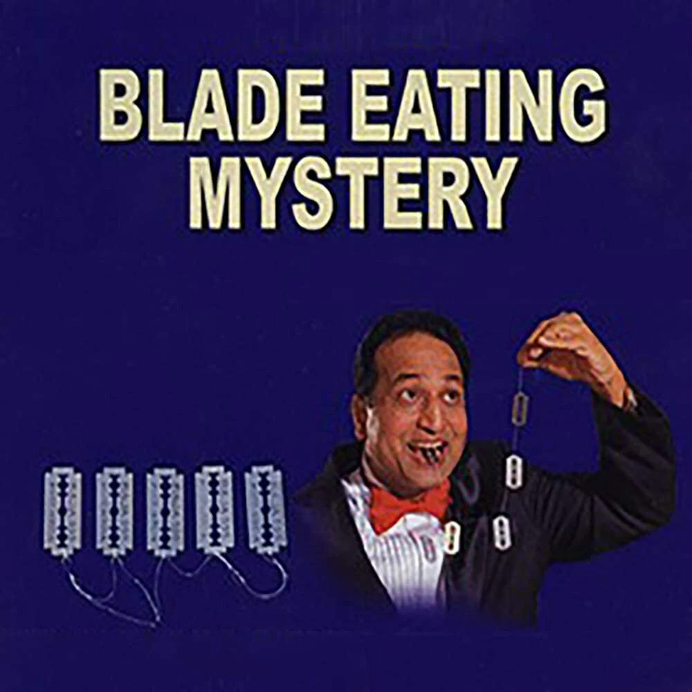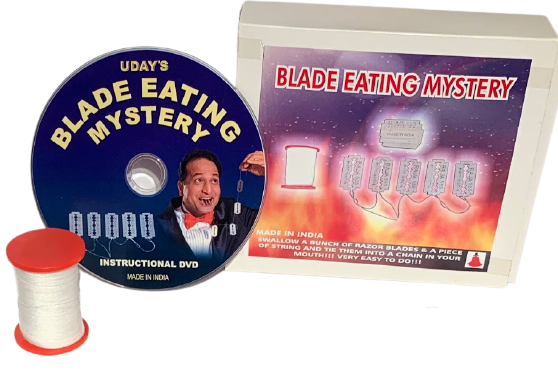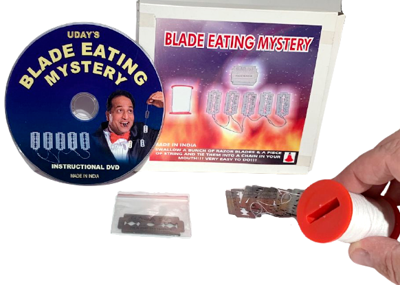 NEW Vintage Blade Eating Mystery! BEST PRICE ON EBAY OR ANYWHERE ELSE! In effect the performer swallows several sharp Razor Blades, then a length of string, and finally regurgitates the blades threaded on the string. We supply you the props for this classic effect. They include the specially gimmicked spool of thread, the loose Sharp Blades, and the threaded blades on a string. Although the professional routine uses a string of 10 blades, the outfit supplied has a string of 5. (5 loose blades + 5 on string). This makes for a snappier routine for audiences today, without much loss to the impact. If you wish you could add more blades to the string, and more of the loose blades. Supplied with all the requirements, and detailed performing instructions. Though relatively "safe" as the blades are dulled, this trick is not for sale to minors. For use by practiced magicians only. We will not accept any responsibility for accidents due to carelessness or erroneous use of the item. Includes gimmicked spool/thread, 5 individual blades, 5 string of blades and instructional DVD. Please Note: DVD works on computer only. WOW FREE SHIPPING! M.Goods