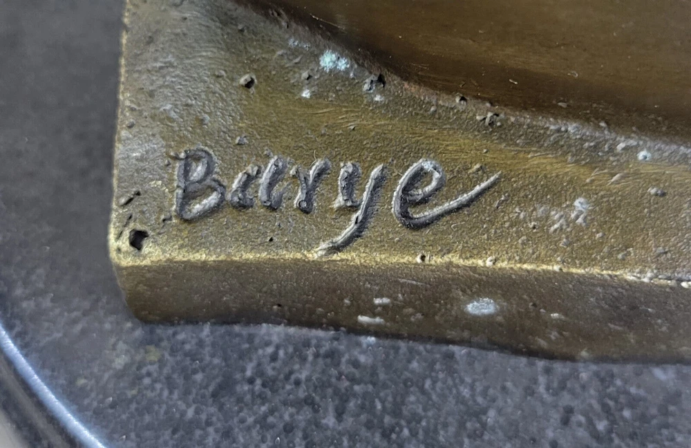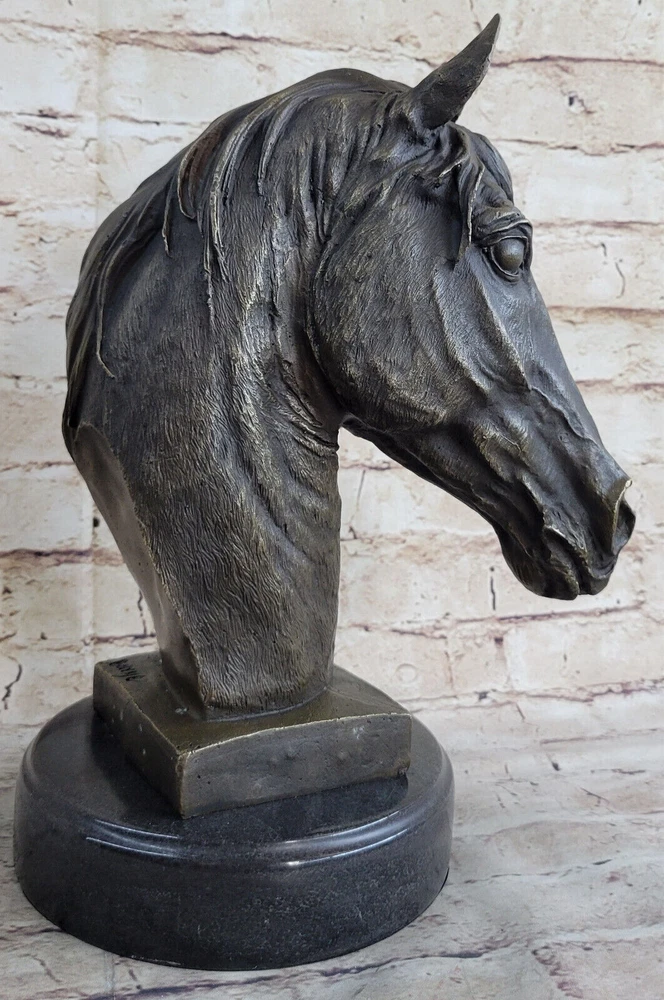 Condition : This sculpture is in perfect condition. Bronze Dimensions with Marble Base: Height 12" X Width 10" Marble Dimensions: Diameter 6.5" Height without base:11" Weight:13 LBS Inventory:32Y6705223 Dynamic Motion and Equine Spirit This striking bronze bust captures the raw energy and grace of a horse in motion, with its head bent downward and its mane flowing dramatically upward. The open mouth, as if mid-neigh, adds a dynamic element that brings the sculpture to life. Every aspect of the horse's pose reflects a moment of spirited movement, making it a powerful representation of the equine spirit. Exquisite Craftsmanship and Detail Crafted with extraordinary attention to detail, this sculpture is a testament to the artist's dedication and skill. Utilizing the traditional "Lost Wax Method," the piece is cast in 100% bronze, preserving every intricate feature of the original design. The rich brown patina and the smooth marble base enhance its elegance, while the flowing lines and textured surfaces demonstrate the artist's mastery in capturing the essence of the horse. A Timeless Tribute to Equestrian Art This bronze horse bust is more than just a decorative piece; it is a work of art that embodies the timeless beauty and majesty of equestrian subjects. The signature of the artist, Barye, adds to its authenticity and collectible value, making it a centerpiece for any art collection or a striking focal point in a room. Whether displayed on a mantelpiece, shelf, or table, this sculpture commands attention and admiration, celebrating the enduring bond between humans and horses. Signed Barye Unique Bronze Bust Horse Head Sculpture Marble Base Statue Figure YRD-670 Video will open in a new window Using the eBay App? Paste link into a browser window: [isdntekvideo]