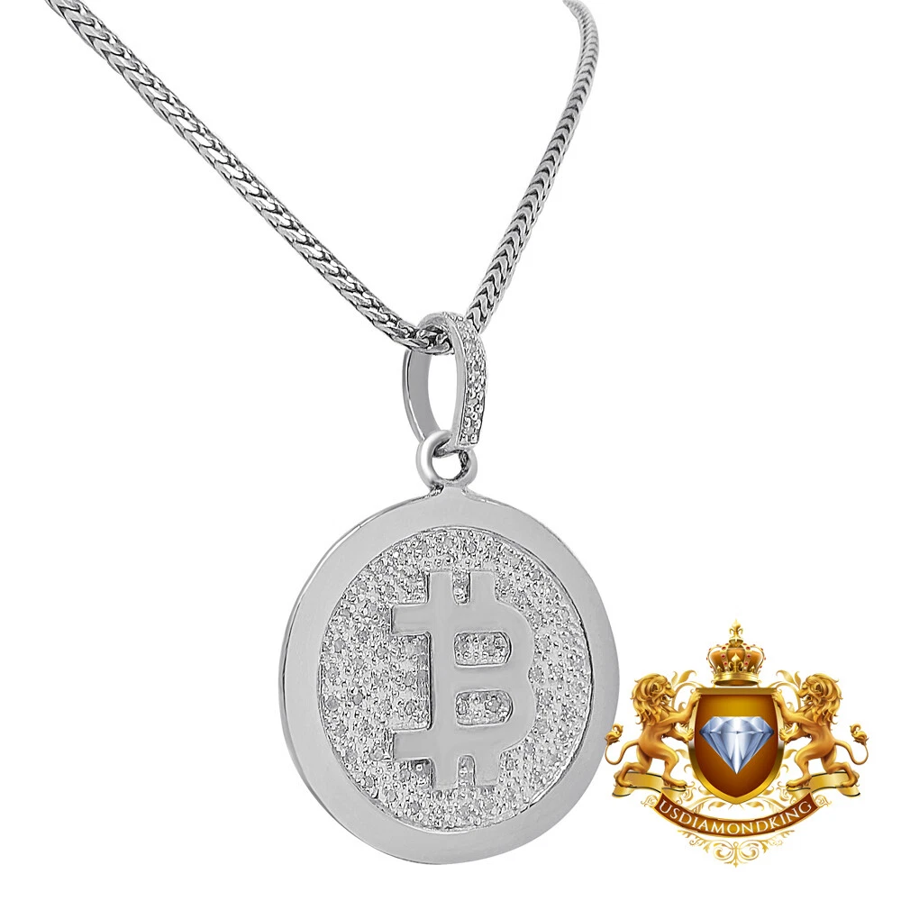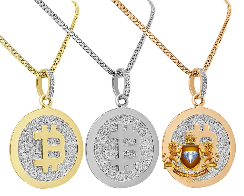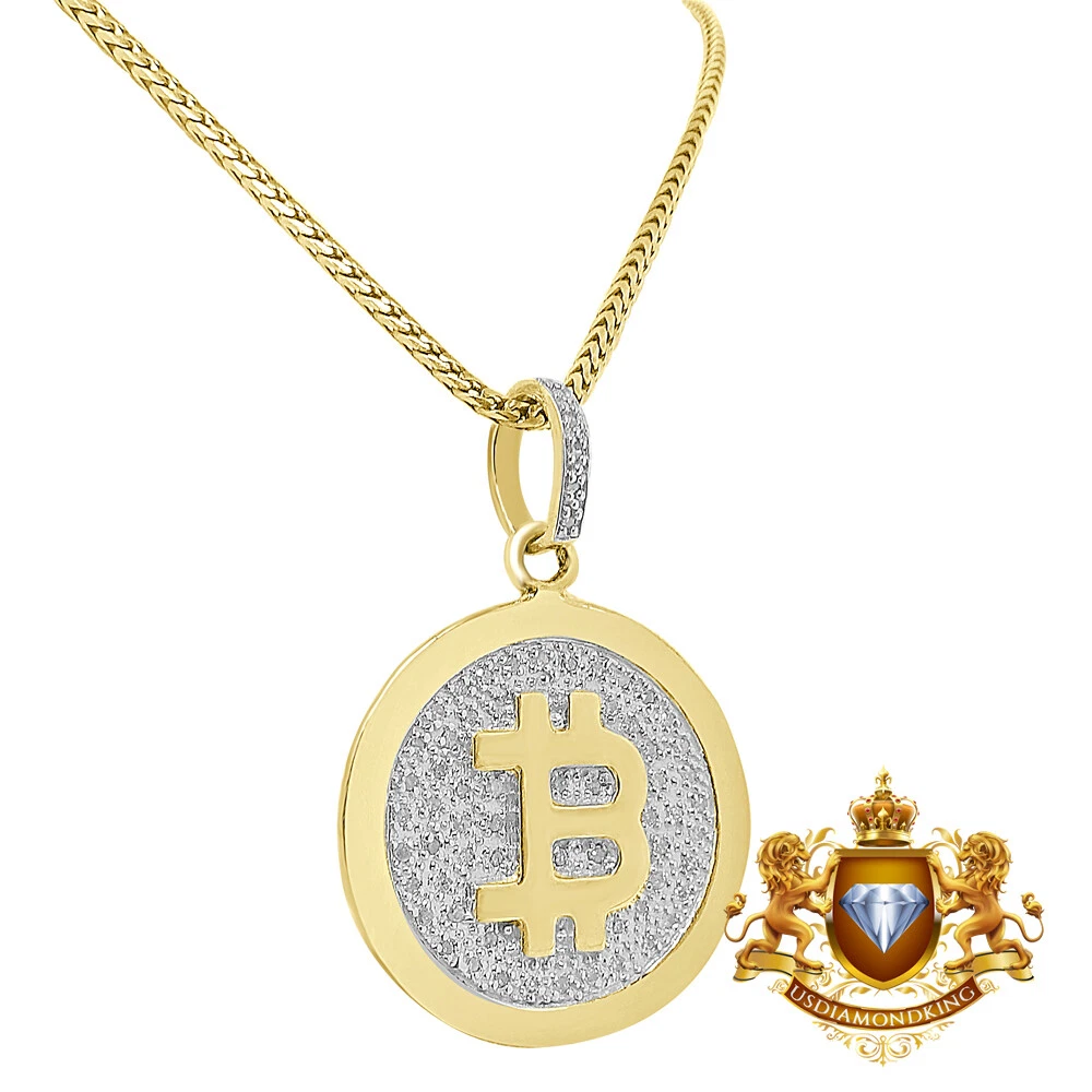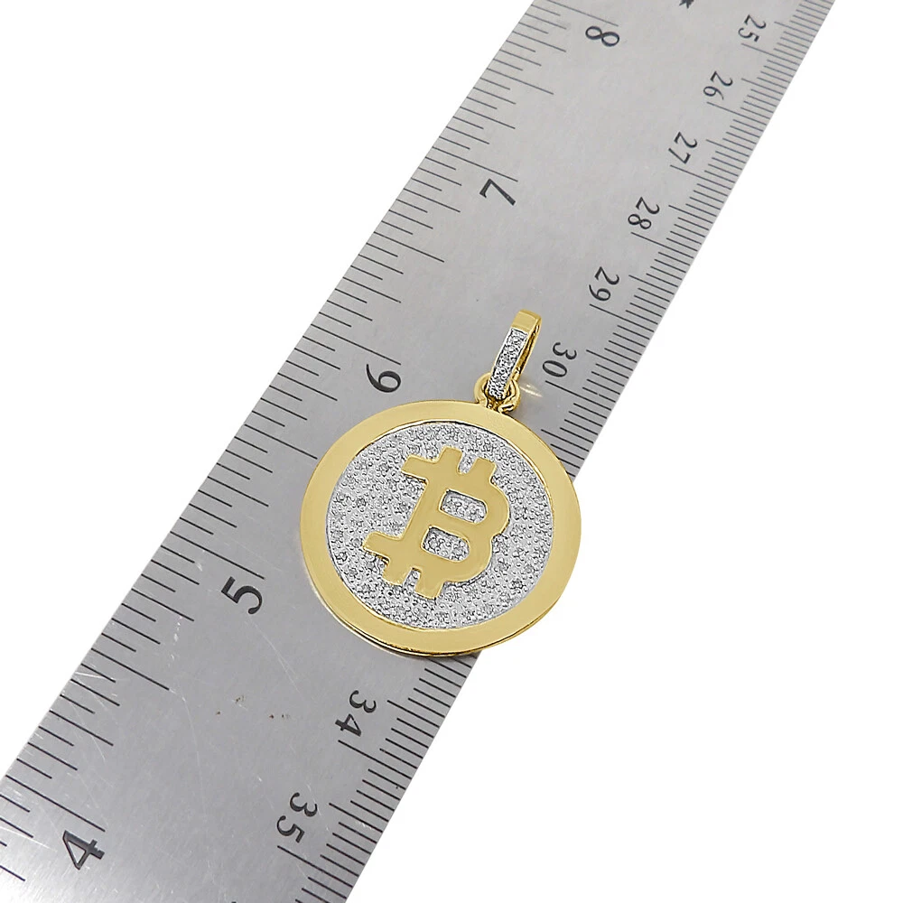 Real Diamond 10K Gold Over Bitcoin Cryptocurrency Mini Charm Pendent Chain Set 'Photos do not indicate actual size. All size dimensions are provided below. Please read through before purchasing." Style : Real Genuine Diamonds Custom Pendant Charm 10K Gold Finish Metal - 10k Gold Over Pure Italian Sterling Silver Charm Length : 1.50 Inches ( Including Bail ) Charm Width : 1.00 Inches Charm Thickness : 2 mm Main Stone : Real Genuine Authentic Diamonds Total Diamond Carat Weight (TCW) : 0.40 Cwt. Diamond Setting : Micro Pave Diamond Shape : Round Brilliant Diamond Clarity : SI1-SI2 Diamond Color : White ( H-I ) Diamond Cut : Good Diamond Treatment : Not Enhanced Chain Style : Franco Chain Metal : Sterling Silver Chain Length : 24 Inches Chain Width : 2 mm Gender : Men's / Women's Total Weight : 12 + Grams ITEM # ASC-12333 Weights are approximate, there may be up to 10% variation in actual item. *** Comes With Complimentary Presentation Gift Box ***