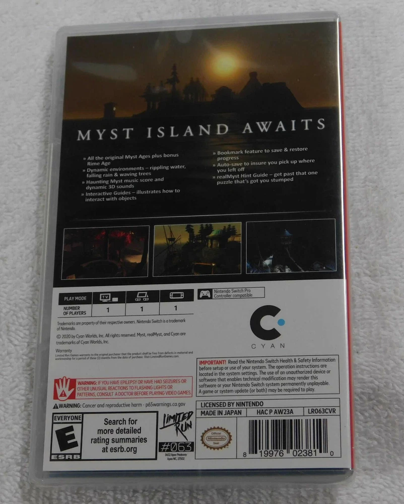 Region Code:Region FreeUPC:0819976023810MPN:LRS63brand:Limited Run GamesVideo Game Series:MystGame Name:RealmystRating:E-EveryoneGenre:Puzzle, Art Game, Fantasy, Detectivegtin13:0819976023810Release Year:2020Publisher:Limited Run GamesPlatform:Nintendo Switch