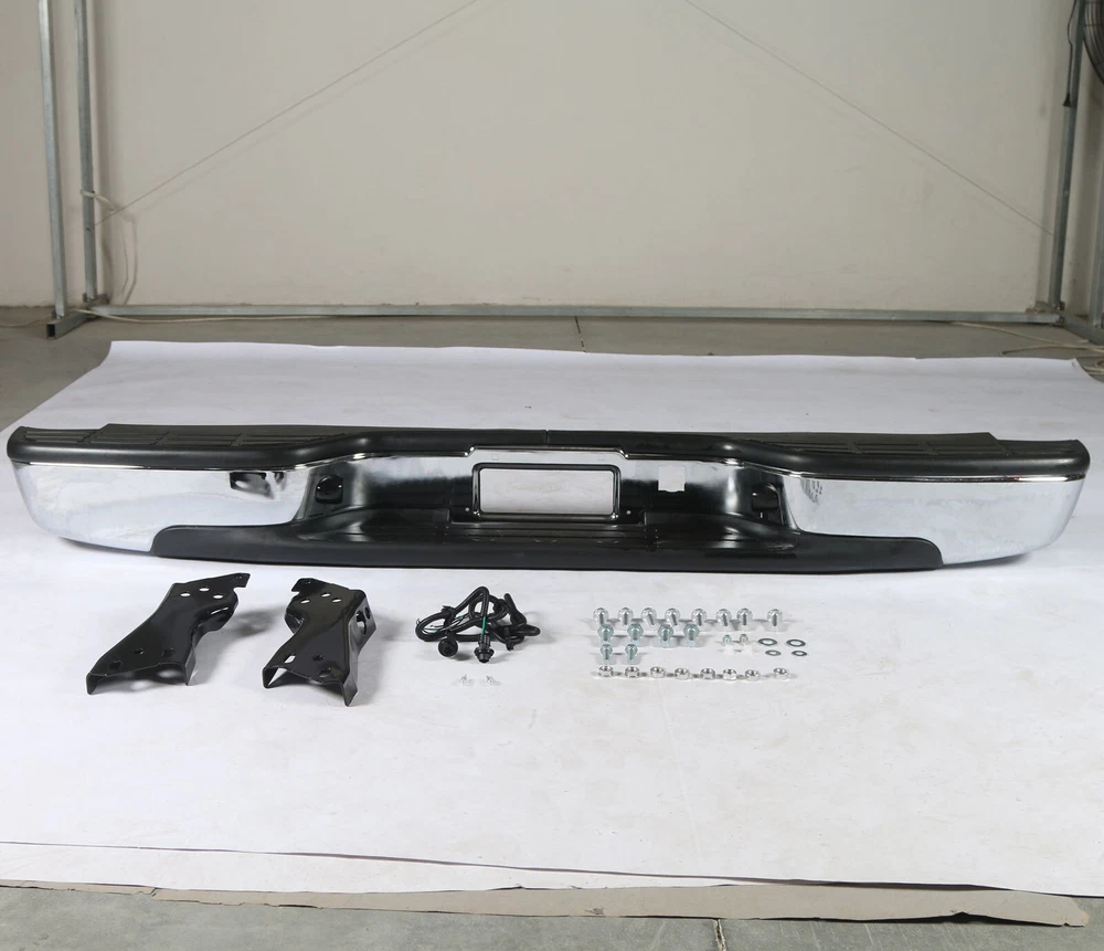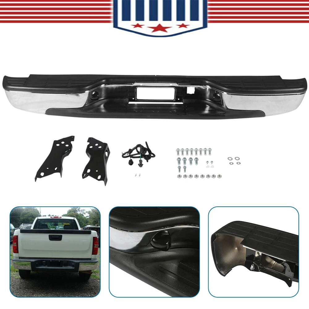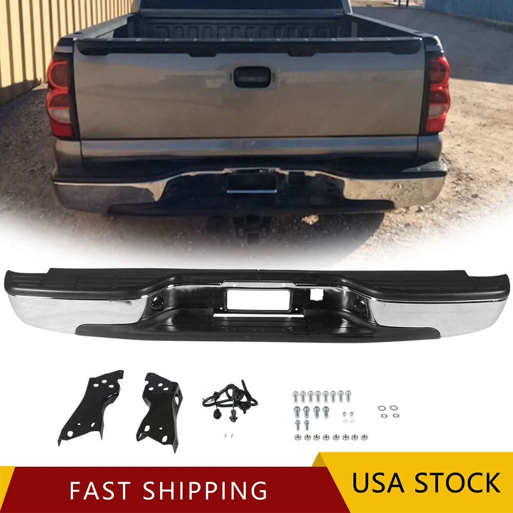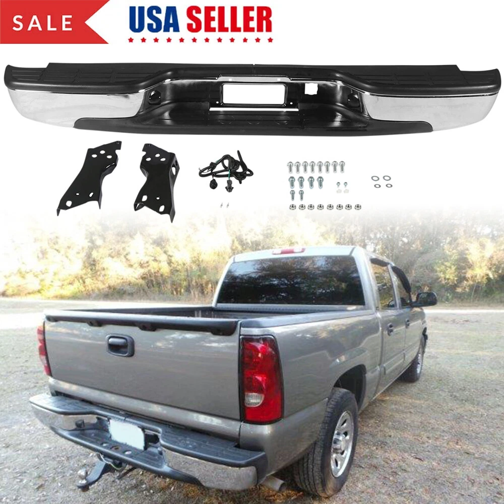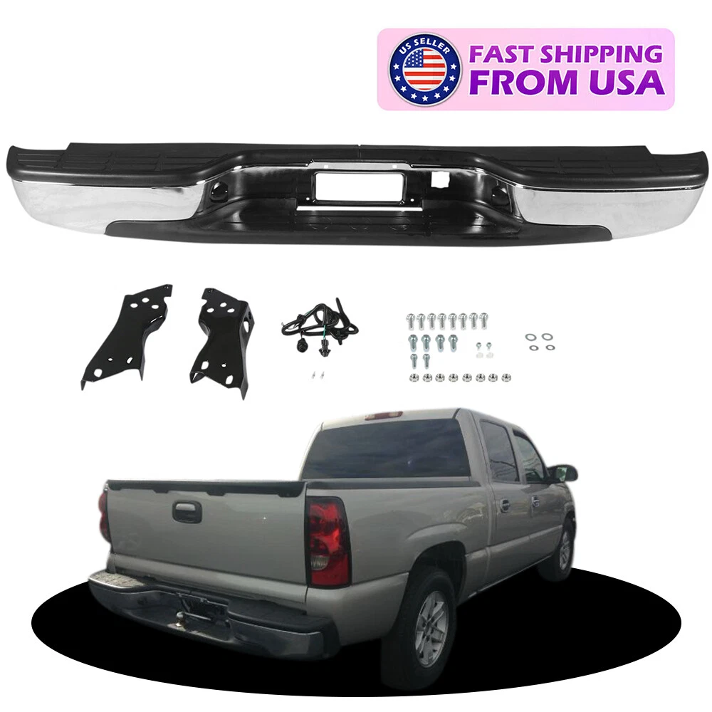 Feature Condition: 100% Brand New Color: Chrome Bumper + Black Step Pad Material: Steel + ABS Plastic Placement on Vehicle: Rear Comes with a Complete Set of Step Pads Requires no Modification or Drilling Upgrade and replace your standard or worn rear bumper with a new one. Professional Installation is Highly Recommended Installation Instruction is NOT Included Fits For 1999-2006 Chevrolet Silverado 1500 For 2007 Chevrolet Silverado 1500 Classic For 1999-2004 Chevrolet Silverado 2500 For 1999-2006 GMC Sierra 1500 For 2007 GMC Sierra 1500 Classic For 1999-2004 GMC Sierra 2500 Fits Models without Parking Sensor Holes Package Include 1×Rear Bumper 1 Set of License Plate Lamp Wiring Harness 2×License Plate Lamps Some bolts and screws On Jul 9, 2024 at 09:48:42 PDT, seller added the following information: On Jul 11, 2024 at 17:41:38 PDT, seller added the following information: On Jul 24, 2024 at 08:58:26 PDT, seller added the following information: On Nov 20, 2024 at 13:46:47 PST, seller added the following information: On Dec 11, 2024 at 17:48:42 PST, seller added the following information: On Dec 11, 2024 at 20:49:49 PST, seller added the following information: