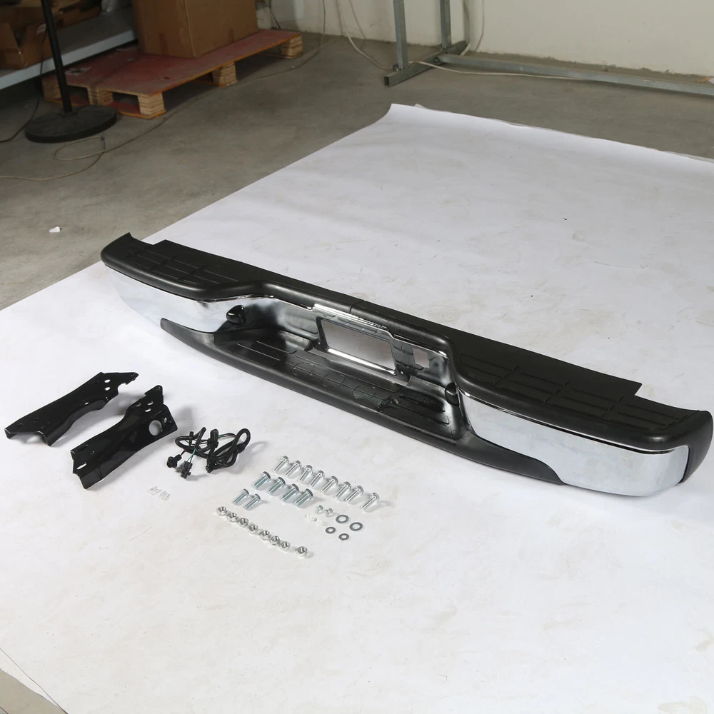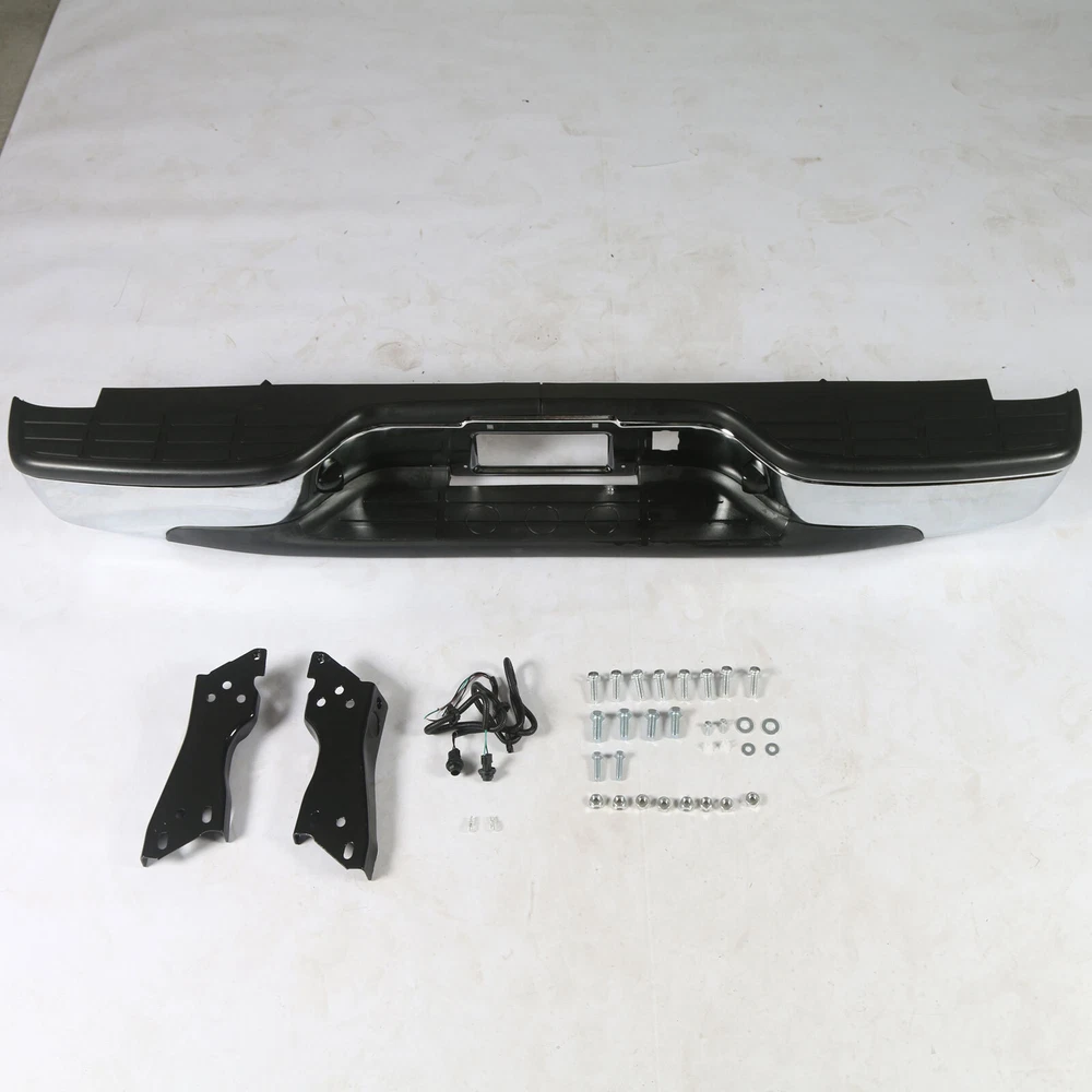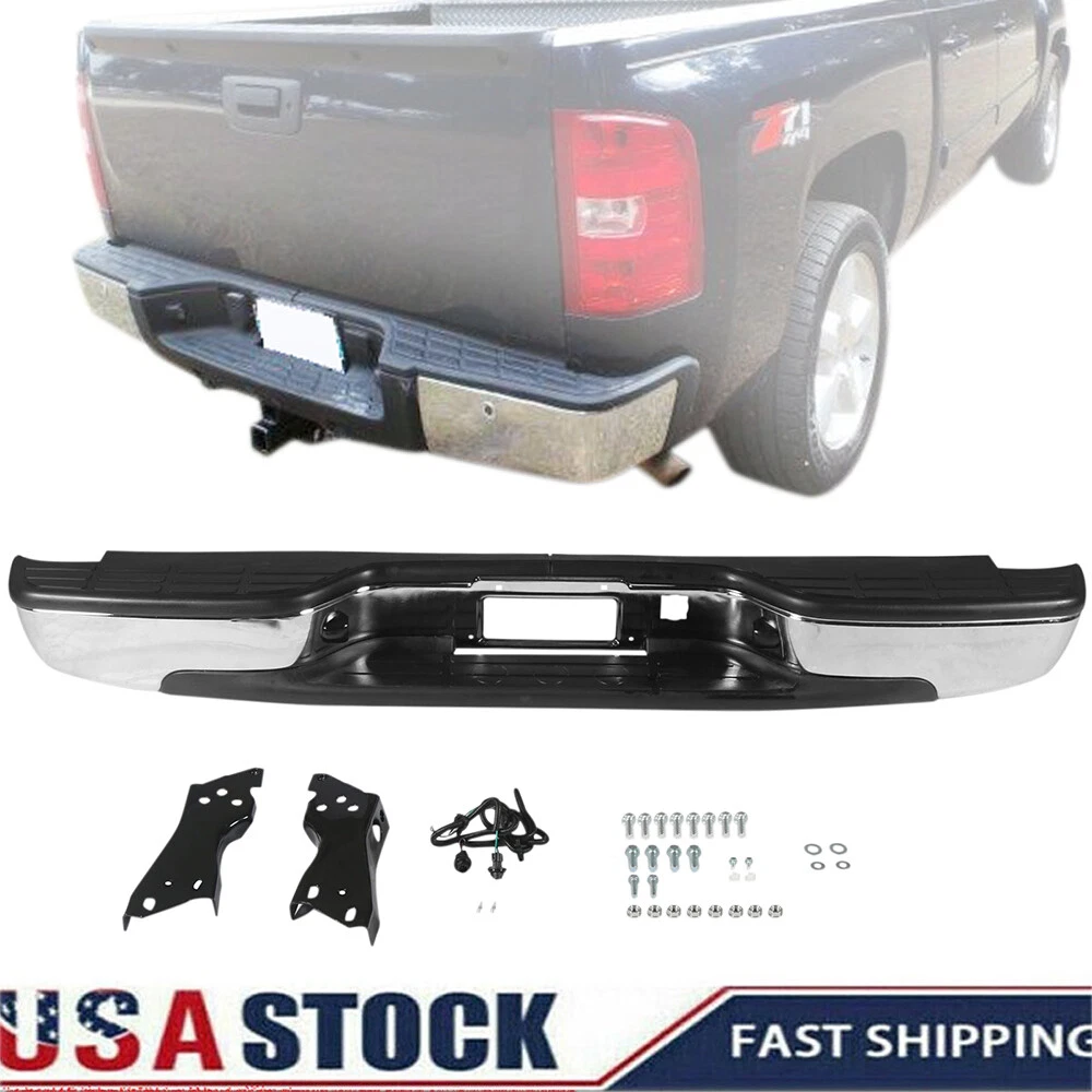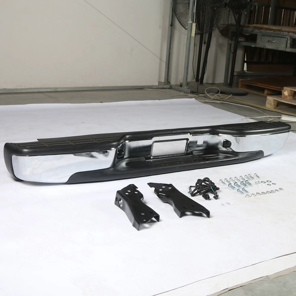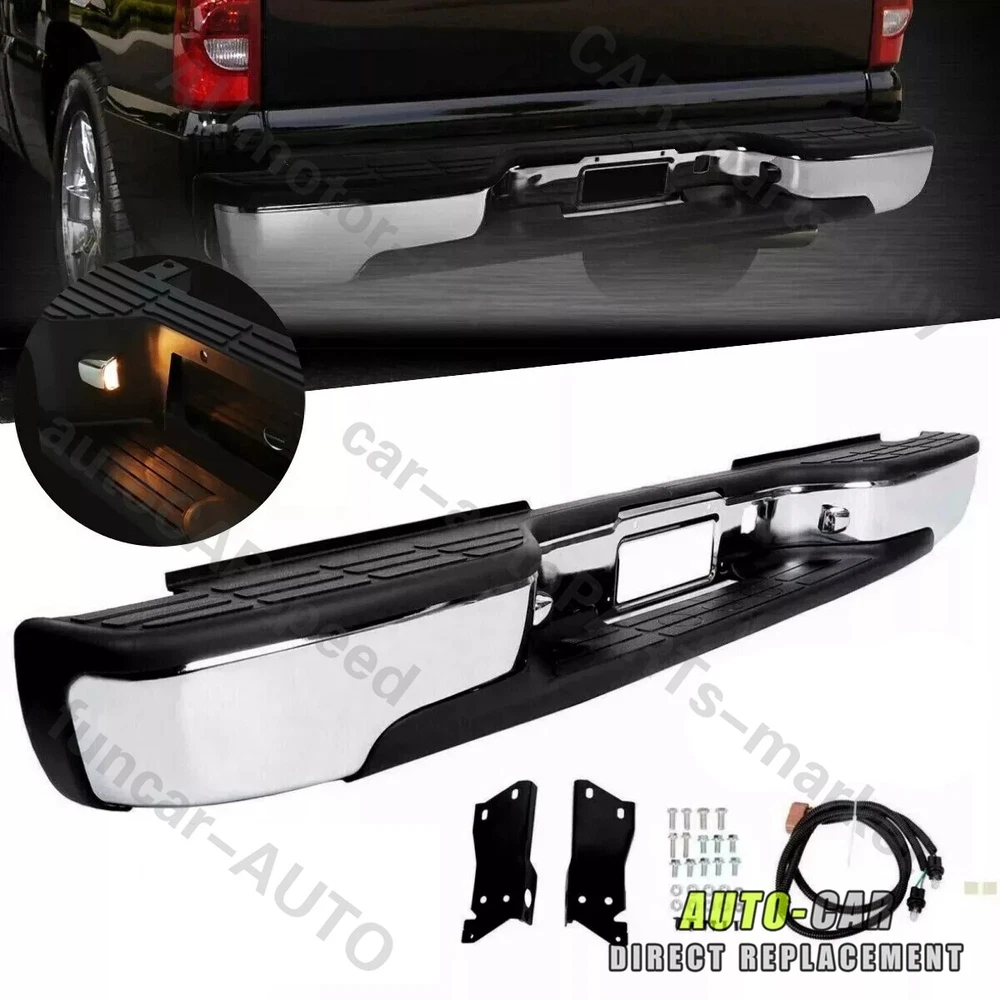 Feature Condition: 100% Brand New Color: Chrome Bumper + Black Step Pad Material: Steel + ABS Plastic Placement on Vehicle: Rear Comes with a Complete Set of Step Pads Requires no Modification or Drilling Upgrade and replace your standard or worn rear bumper with a new one. Professional Installation is Highly Recommended Installation Instruction is NOT Included Fits For 1999-2006 Chevrolet Silverado 1500 For 2007 Chevrolet Silverado 1500 Classic For 1999-2004 Chevrolet Silverado 2500 For 1999-2006 GMC Sierra 1500 For 2007 GMC Sierra 1500 Classic For 1999-2004 GMC Sierra 2500 Fits Models without Parking Sensor Holes Package Include 1×Rear Bumper 1 Set of License Plate Lamp Wiring Harness 2×License Plate Lamps Some bolts and screws On Jul 9, 2024 at 09:48:42 PDT, seller added the following information: On Jul 11, 2024 at 17:41:38 PDT, seller added the following information: On Jul 24, 2024 at 08:58:26 PDT, seller added the following information: On Nov 20, 2024 at 13:46:47 PST, seller added the following information: On Dec 11, 2024 at 17:48:42 PST, seller added the following information: On Dec 11, 2024 at 20:49:49 PST, seller added the following information: