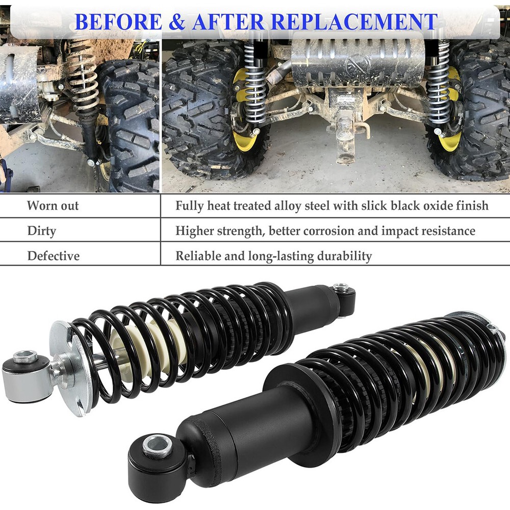 Fitment: Fits for John Deere Gator HPX 2004-2017, for John Deere Gator HPX 615E, 815E 2018-2020, for John Deere Gator XUV620i 2007-2010, for John Deere Gator XUV850D 4x4 Diesel 2007-2010 Features: 1) The shock absorber is fully-assembled, including necessary parts required for replacement. No need for special tools 2) Precisely machined from fully heat treated alloy steel with slick black oxide finish, higher strength, better corrosion and impact resistance, ensuring reliable and long-lasting durability 3) Package includes 2Pcs coil-over shock absorber for use on rear left and right strut (Replaces OEM# AM135375), manufactured and tested to meet original equipment standards and performance Package included: 2Pcs coil-over shock absorber