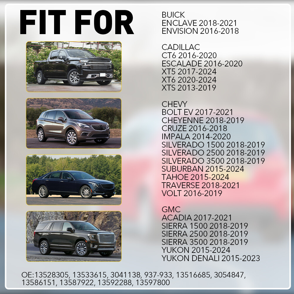 Fit for: Buick Enclave 2018-2021 Envision 2016-2018 Cadillac CT6 2016-2020 Escalade 2016-2020 XT5 2017-2024 XT6 2020-2024 XTS 2013-2019 Chevy Bolt EV 2017-2021 Cheyenne 2018-2019 Cruze 2016-2018 Impala 2014-2020 Silverado 1500 2018-2019 Silverado 2500 2018-2019 Silverado 3500 2018-2019 Suburban 2015-2024 Tahoe 2015-2024 Traverse 2018-2021 Volt 2016-2019 GMC Acadia 2017-2021 Sierra 1500 2018-2019 Sierra 2500 2018-2019 Sierra 3500 2018-2019 Yukon 2015-2024 Yukon Denali 2015-2023 Specifications: OE number: Rear Right Side fit 2015-2020 Silverado Sierra Door Lock Latch Actuator 13528305 Fit for: Buick Enclave 2018-2021 Envision 2016-2018 Cadillac CT6 2016-2020 Escalade 2016-2020 XT5 2017-2024 XT6 2020-2024 XTS 2013-2019 Chevy Bolt EV 2017-2021 Cheyenne 2018-2019 Cruze 2016-2018 Impala 2014-2020 Silverado 1500 2018-2019 Silverado 2500 2018-2019 Silverado 3500 2018-2019 Suburban 2015-2024 Tahoe 2015-2024 Traverse 2018-2021 Volt 2016-2019 GMC Acadia 2017-2021 Sierra 1500 2018-2019 Sierra 2500 2018-2019 Sierra 3500 2018-2019 Yukon 2015-2024 Yukon Denali 2015-2023 Specifications: OE number: 13528305, 13533615, 3041138, 937-933, 13516685, 3054847, 13586151, 13587922, 13592288, 13597800 Material: Metal&ABS Color: Black Pin: 5 Pin Connector Placement on vehicle: Rear,Right Features: *Durable structure Manufactured in accordance with strict quality control standards and factory standards. *Direct relacement This door lock actuator can replace the orginal one directly without other modifications. *Damage prevention Door lock actuator with strong plastic shell helps to protect the actuator from damage. *Note Please confirm the OE number and vehicle model before purchasing!! Packaging include: Door Lock Actuator*1 Note: Please check your Car Model, reference our pictures before you purchase. Please allow 1-2cm difference due to manual measurement. Item Specifics Country/Region of Manufacture China Manufacturer Warranty 2 Years Brand AUXITO Features Durable, Easy Clean, Easy Installation, Self-Adhesive, Waterproof Universal Fitment Direct Replacement Number of Product 1 Seller Notes “New OEM, Generic Packaging” UPC 808709897026 Manufacturer Part Number 13528305, 13533615, 3041138, 3054847 Condition Detail New OEM, Generic Packaging Fitment Type Direct Replacement Part Number 13528305, 13533615, 3041138, 937-933, 13516685, Other Info 13528305 is the same as 13533615, 5 Pin Plug Placement on Vehicle Front, Right Interchange Part Number 3054847, 13586151, 13587922, 13592288, 13597800 Package Quantity 1 Fitment1 Bolt EV 2017-2021 Fitment2 Cheyenne 2018-2019 Fitment3 Cruze 2016-2018 Fitment4 Impala 2014-2020 Fitment5 Silverado 1500 2018-2019 Fitment6 Silverado 2500 2018-2019 Fitment7 Silverado 3500 2018-2019 Fitment8 Suburban 2015-2024 Fitment9 Tahoe 2015-2024 Fitment10 Traverse 2018-2021 Fitment11 Volt 2016-2019 Store dyy_motor NOTICE Please double-check the part number and models FAQ ♥ If you have a decoding problem or any other problems, please contact us first, we will help you with it. We will reply you within 24 hours in working days. I'm a new seller, thanks a lot for your trust and convince! I will serve you with all my heart. ♥ Q1: Will this bulb fit my vehicle? A: We can match almost any vehicle to one of our bulb sizes. eBay only lets us include some vehicle fitments per listing, but if your vehicle does not show up on the compatibility table at the top of our listings, welcome you to contact us for free consulation before purchasing a product. Q2: My item has not arrived, what's taking so long? A: Sometimes items take longer than expected, especially if it’s going far or to rural area. Check with your post office to see if your item has been held up. Sometimes Royal Mail will not update a tracking number until it has arrived at its destination. If your item still don't arrive after a few days, let us know so we can double check for you and help solve it asap. Q3: My bulbs won't fit, help! A: Special bulb holder may be required. See if you can take the holder from the stock bulb. If not, let us know. The bulb size may be wrong, double check the item you received with the item you ordered. Do you have an aftermarket lighting housing? These may not be perfectly fitted for aftermarket bulbs and will require some manual modifications. Q4: Neither side lighting up? Both sides flicker, hyper flash, or work inconsistantly. A:Check the light fuses, and then check the ballast plugs to insure correct installation. If this doesn't work, there may be a voltage problem with the vehicle. You probably just need a relay or capacitor. Even though some bulbs are builtin resistors, they may still need a decoder. Pay & Ship (1). We gladly accepts payment via PayPal, We will ship your item(s) within 24 hours. (2). Before payment, please keep the consistency of Paypal address and ebay address. (3). Quantity orders are welcome! Returns (1). We offer 60 days free return policy. Please contact us within 60 days from the date you receive your order if you have any issues with the product or want return. Refund will be send after we got your resend package. (2). All returned items should be in the original packaging , return tracking information should be provided . Contact Us (1).Negative feedback will not help resolve any problems you have, please contact us via eBay messages before leaving negative feedback , our customer service will make best effort to help you with the issues. (2).We maintain high standards of excellenceand strive for 100% customer satisfaction! Feedback is very important to us. We request that you contact us immediately before you give us neutral or negative feedback, so that we can satisfactorily address your concerns. About us We're professional in car and motorcycle accessories, especially in LED bulbs. We have our own factory and R&D team. Our belief is to sell top quality items that fit your car and serve you with our heart. Anything please feel free to contact us! Our customer service 