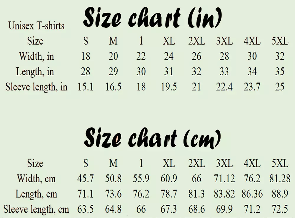 WELCOME TO OUR STORE If you are looking for a shirt for yourself or a gift for a loved one, our store is the perfect place to help you do it. We have a wide variety of t-shirt designs for you to choose from. We have attached the size chart so you can choose the right size. DESCRIPTION: Brand: Gildan Decoration type: Digital Print Material: 100% Cotton Available sizes: S, M, L, XL, 2XL, 3XL, 4XL (we also have 5XL if you request) SERVICE: Due to lighting effect and computer color, the actual color may be slightly different from the picture. Hope for your understanding on this. But customers who have used our products are very satisfied with the products they receive from us. We do not accept returns of goods for the following reasons: Customers choose the wrong size. we only accept return for damage or bad printing result FEEDBACK: The satisfaction of our customers is the first place for us. If you are happy with your purchase, PLEASE take a moment to leave Positive feedback for us. We really appreciate that. If you are not happy with the purchase, PLEASE contact us to resolve the problem. We are always here to give you the best solutions. THANK YOU SO MUCH, HAVE A GOOD DAY!