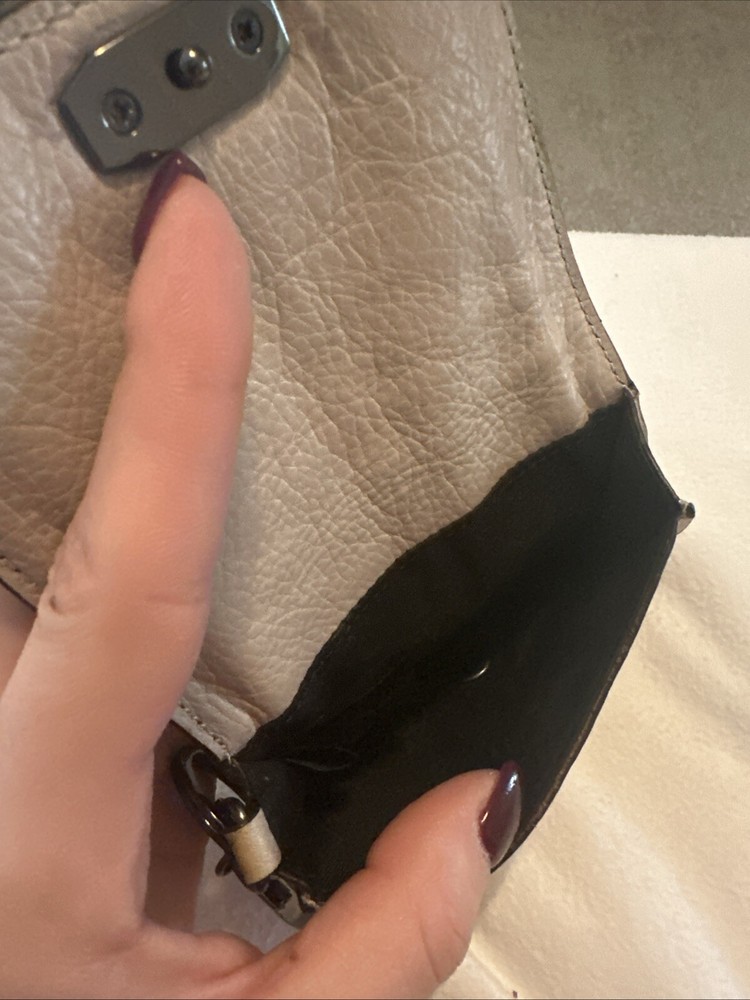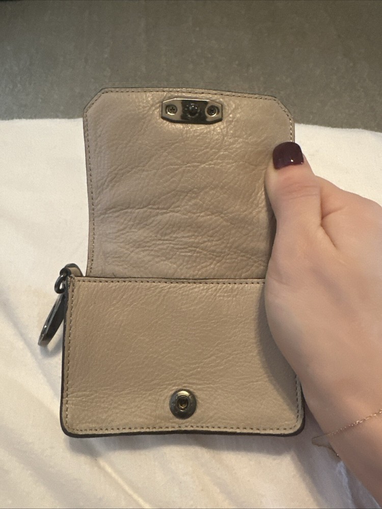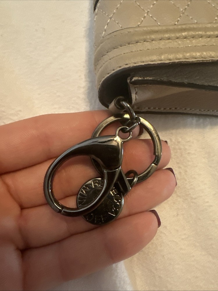 Rebecca Minkoff wallet Tan with keychain. Black/ Silver Chain and hoop. Condition is Pre-owned. Shipped with USPS Ground Advantage.