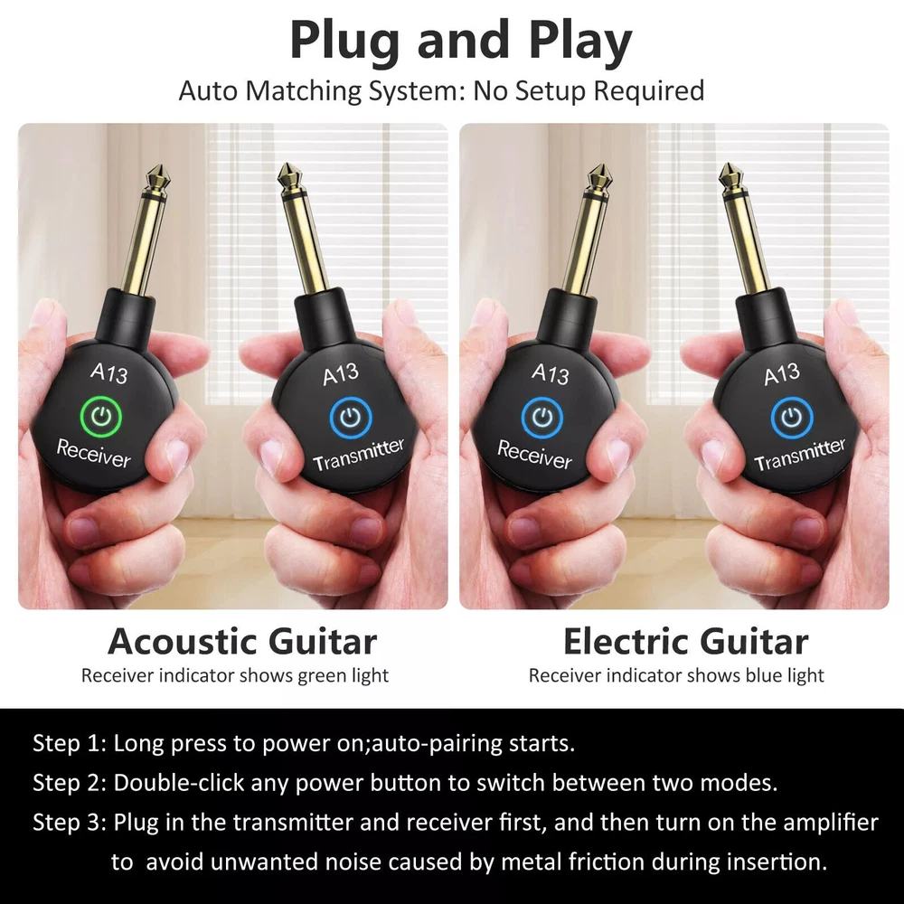 SAFE & SECURE SHOPPING 100% SATISFACTION GUARANTEED FAST SHIPPING Store Categories Store Categories You may also like You may also like 13Pack Metal 0.6-2.0mm 90mm Long Screwdrivers Repair Tools For Watchmakers Watch 15.04 USD 1:72 Scale US SBD-3 Dive Bomber Fighter Alloy Aircraft Model Military Plane NEW 45.57 USD 3.89 USD Foot Pedal-Pressure Control-Valve 3 Way 2 Position 1/4" Air Pneumatic Switch 25.43 USD Lower Duct Hose for Shark Rocket True Pet Slim Vacuum HV300 HV322 320 380 380UK 9.95 USD Durable Abrasive Mounted Stone For Rotary Tools Grinding Stone Wheel Head Dremel 9.95 USD Generic Part Watch Balance Wheel Hairspring For ETA 2824-2 2834 2836 Movement F 6.35 USD 3.89 USD Wireless Guitar System Adapter Transmitter Receiver For Electric Instruments Product Description Features: 2.4GHz digital wireless signal transmission with 24-bit/48KHz uncompressed conversion. High frequency which less than 4ms latency, no lag or no signal loss. effective range is about 100 feet. High quality restore the original guitar sound. Built-in rechargeable lithium battery, working time is up to 5 hours after fully charged, and comes with a Dual-ended Type-C Charging Cable for convenient recharging, which ensures good performance for your every show. This wireless transmitter and receiver system is compatible with all devices that have a 6.35mm (1/4") jack, including electric guitars, violins, basses, effect pedals, keyboards, and electronic instruments like the electric saxophone. A13 wireless guitar system is designed for wireless connection to electronic instruments.This wireless guitar transmitter receiver has the characteristics of low delay, low noise, low interference, fast charging, long working time and high transmission. A13 wireless guitar system in order to meet your requirements for perfect sound quality and best use experience, we have been working hard, so our guitar wireless transmitter receiver mission is to provide you with better stage performance, so that you can enjoy the best music experience! Wireless guitar makes strumming easy and happy, the wire winding pull, make playing the mood is not good.Wireless guitar transmitter receiver will be a best gift, throw away the cable, embrace the freedom of music, let yourself surrounded by 30 meters of surprise! Specifications: Material: ABS Plug: Gold-plated copper Transmission frequency: 2.4GHz Frequency bandwidth: 20Hz-20KHz Battery capacity: 200mHA Voltage: 3.7V Charging port: USB-C Charging time: 1.5 hours Battery life: 5 hours Transmission distance: 30 meters Package includes: 1* Receiver 1* Transmitter 1* Dual-ended Type-C Cable Payment Shipping Returns Contact Us Payment We accept all verified payments from ebay. Orders will be shipped after receiving cleared payment. Payment due within 7 days after auction ends and for buy it now listings. Shipping We ship most of our orders within 24 hours, and may up to 48 hours. If you want faster shipping way, please contact us before making a payment. Sometimes due to problems with our transportation company system, your shipping information may be delayed to update. We recommend that you try again after 3-4 days. If you still haven't checked the shipping information, you can contact us via ebay message. Returns Always believe we can figure things out with communication, but if it comes to return, the pacakge must be intact and the same as you receive. If you have any questions, please feel free to email our service specialists 24 Hours a Day, 7 Days a Week. We will reply you ASAP. Return/refund is accepted within 30 days after the buyer receives the item. NO exchange will be accepted after 30 days from the date when the item is received. Please contact us first before returning your product!!! Contact Us If you have any questions, you're welcome to email us. We strive to answer all questions and resolve any problems as quickly as possible. You can contact us 7*24, we will reply at the first time, and we will surely solve your problems. Copyright © 2022 Tongtool