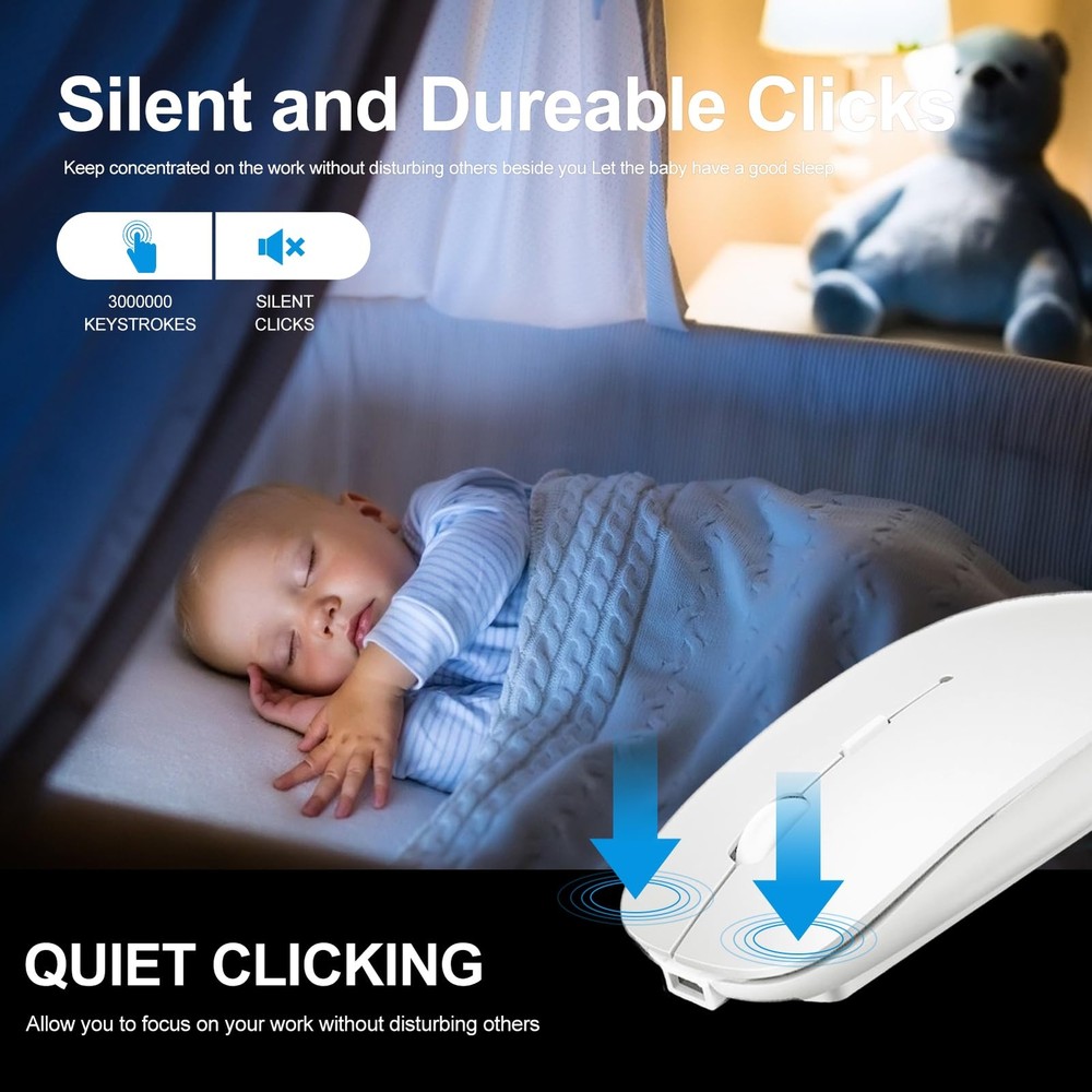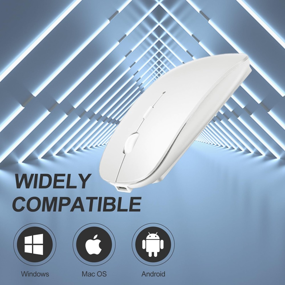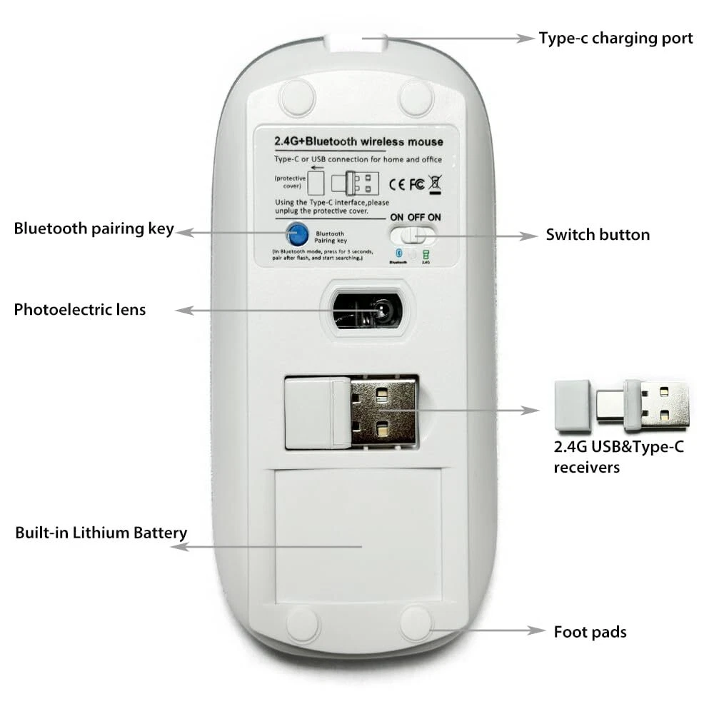 RECHARGEABLE DUAL MODE BLUETOOTH MOUSE(Bluetooth 3.0/5.2+Usb-2.4G/Type-C) It is compatible with Mac OS Windows XP, Vista, 7, 8, 10and is suitable for desktop, notebook, PC, Mac Macbook Pro/Air/ipad(2016/2017/2018/2019/2020/2021/2022) iMac and other devices. How to use it Bluetooth Mode: No need to occupy PC interface, fast and stable connection, Turn on the device's Bluetooth function,Switch to "ON/OFF" button to left(Bluetooth mode),Search the product of Bluetooth and find “BT5.2/3.0 Mouse” to pair,It's ready to use. How to use it 2.4Ghz Mode: just take the USB/Type-C receiver from the bottom of the mouse, then insert the USB/Type-C receiver into the computer USB/Type-C port,Switch to "ON/OFF" button to right,Then you can use the mouse in 2.4GHz Mode. How to connect to iOS/iPad/Pro/Air/iPhone (ios 13/ios 14) via Bluetooth Mouse first slide the button at the bottom of the mouse to the bluetooth " " position ( bluetooth mode), open tabletSettings >Accessibility > Touch > AssistiveTouch > Click to open (An auxiliary dot will appear on the screen),Go back to Settings > Click on the bluetooth > Click to open > BT 5.2/3.0 MOUSE > connect and Pair.(PIN:0000) Note: The mouse cursor will move slowly or stop moving when the mouse is low battery,Please charge it in time. The blue light beside the scroll wheel will be on while charging, and then goes off when the mouse is fully charged,It takes about 2.5 hours to fully charge. Packing list: rechargeable dual-mode mouse *1 USB charging line *1 USB2.4G/Type C Nano USB receiver *1(hidden in the slot at the bottom of the mouse) Instructions*1. ✪✪Upgrade version Rechargeable 4 Modes bluetooth mouse(Bluetooth 3.0/5.2+USB2.4G/Type C), Dual-port 2-in-1 Receiver USB2.4G/Type-C You can switch between the 4 connection modes, adds more fun to the boring office life. ✪✪ It is compatible with Mac OS Windows XP, Vista, 7, 8, 10and is suitable for desktop, notebook, PC, Mac Macbook Pro/Air/ipad(2016/2017/2018/2019/2020/2021) iMac and other devices. ✪✪Built-in durable Lithium polymer rechargeable battery,You can use the USB cable to charge the mouse without replacing the battery,Just 2-3 hours charging, you can use it about 7-30 days, Standby time is very long, energy-saving features, automatic sleep mode and wake-up mode are installed to save energy,If you do not use the mouse for 5 minutes, it will go to sleeping mode. ✪✪4 mode bluetooth mouse is designed ultra-silent and reduce noise by up to 96% compared with others, Sleek, well-built and lightweight , Contoured shape to fit comfortably in the palm of your hands so you can stay productive longer. ✪✪3 DPI switches (1000, 1200, 1600) change the speed of the mouse freely,This bluetooth mouse can meet your demand of daily office working and personal preference.