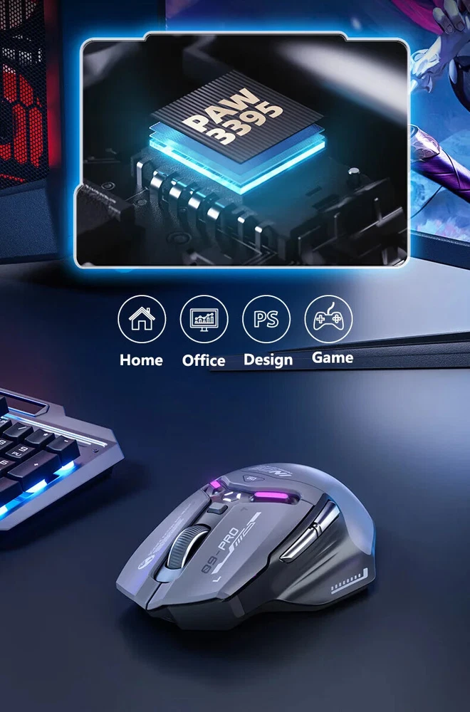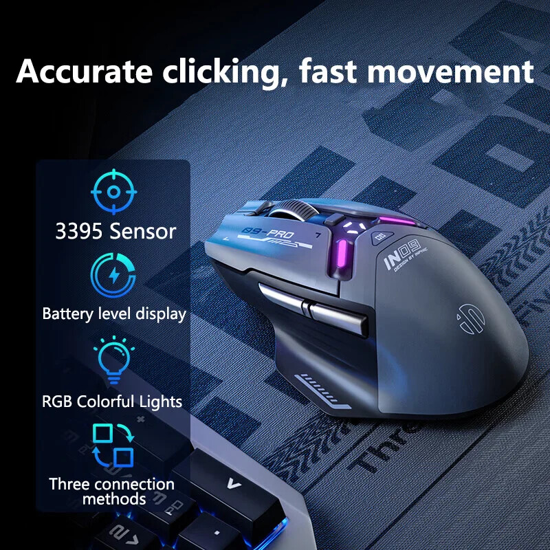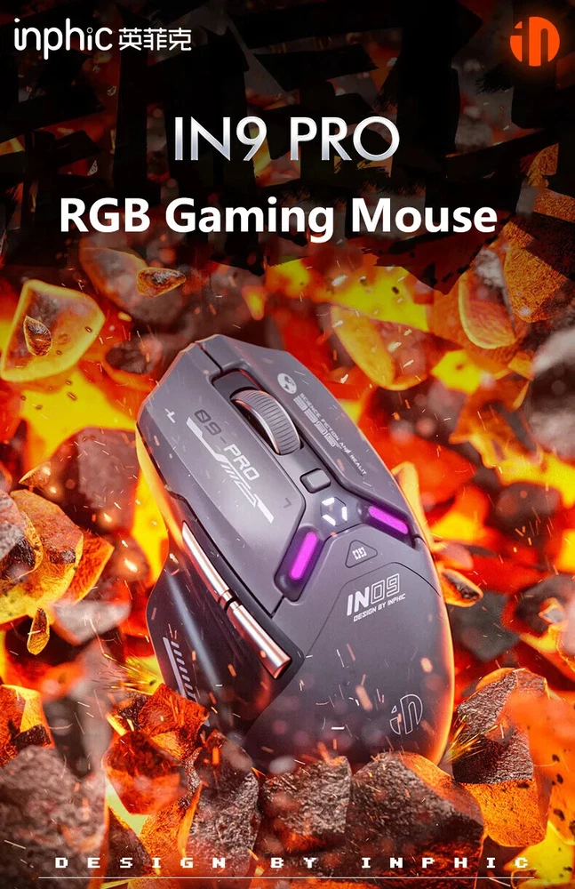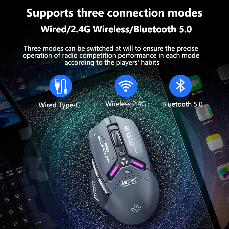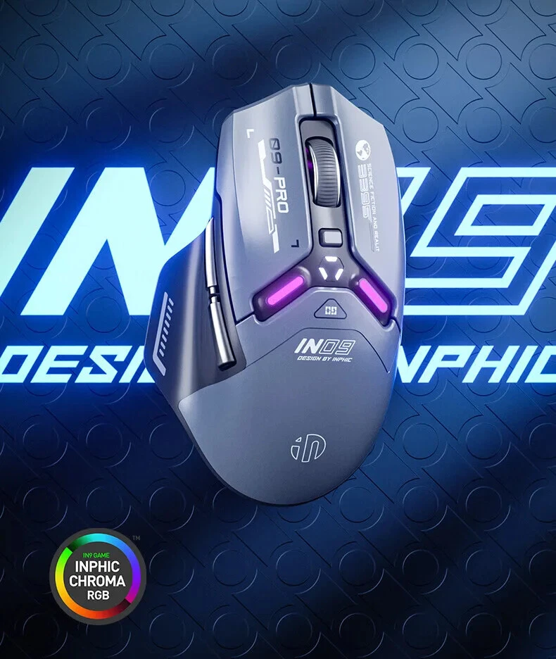 NOTE: Default configuration for 1K receiver, 8K receiver needs to be purchased separately Connect the 8k receiver to your computer via a USB Type-C cable, press and hold the DPI button on the mouse to re pair and unlock the 8000Hz return rate feature Improve wireless speed and reduce signal interference Product parameters: Product model: IN9 PRO Sensor: Primary phase PAW3395 Product size: 129x80x43mm Weight: 92 ± 3g Resolution: 800/1600/3200/6500/13200/26000DPI (DPI can be customized and adjusted by installing drivers) Chip: Shanghai Broadcom Return rate: 125/250/500/1000Hz (adjustable driver installation) Connection method: wired/2.4G wireless/Bluetooth 5.0 Micro motion: Huanuo Green Transparent White Spot 100 million times Rated working current: ≤ 8mA Foot patches: Teflon foot patches Battery capacity: 500mAH Charging interface: Type-C Operating system: Windows XP and above series, suitable for general-purpose mouse systems Packaging List: 1× Mouse 1×1K Receiver 1× Instruction Manual 1× Type-C Charging Cord Supports three connection methods: Wired connection、2.4G wireless、 Bluetooth 5.0 Ergonomic design, conforms to the palm, comfortable grip Original PAW3395 flagship optical sensor 50-26000DPI, from simple Word to intense FPS, meets delicate micro operations in various scenarios 500mAH high battery capacity, intelligent power-saving technology, with a maximum battery life of 120h 16.8 million color illusion RGB monochrome/breathing/multi-color switching 6-key custom macro programming, battery level display. The PTFE material foot patch allows for smooth movement without slipping, providing a stable and textured feel. Anti slip roller with clear markings, providing a better browsing experience up and down