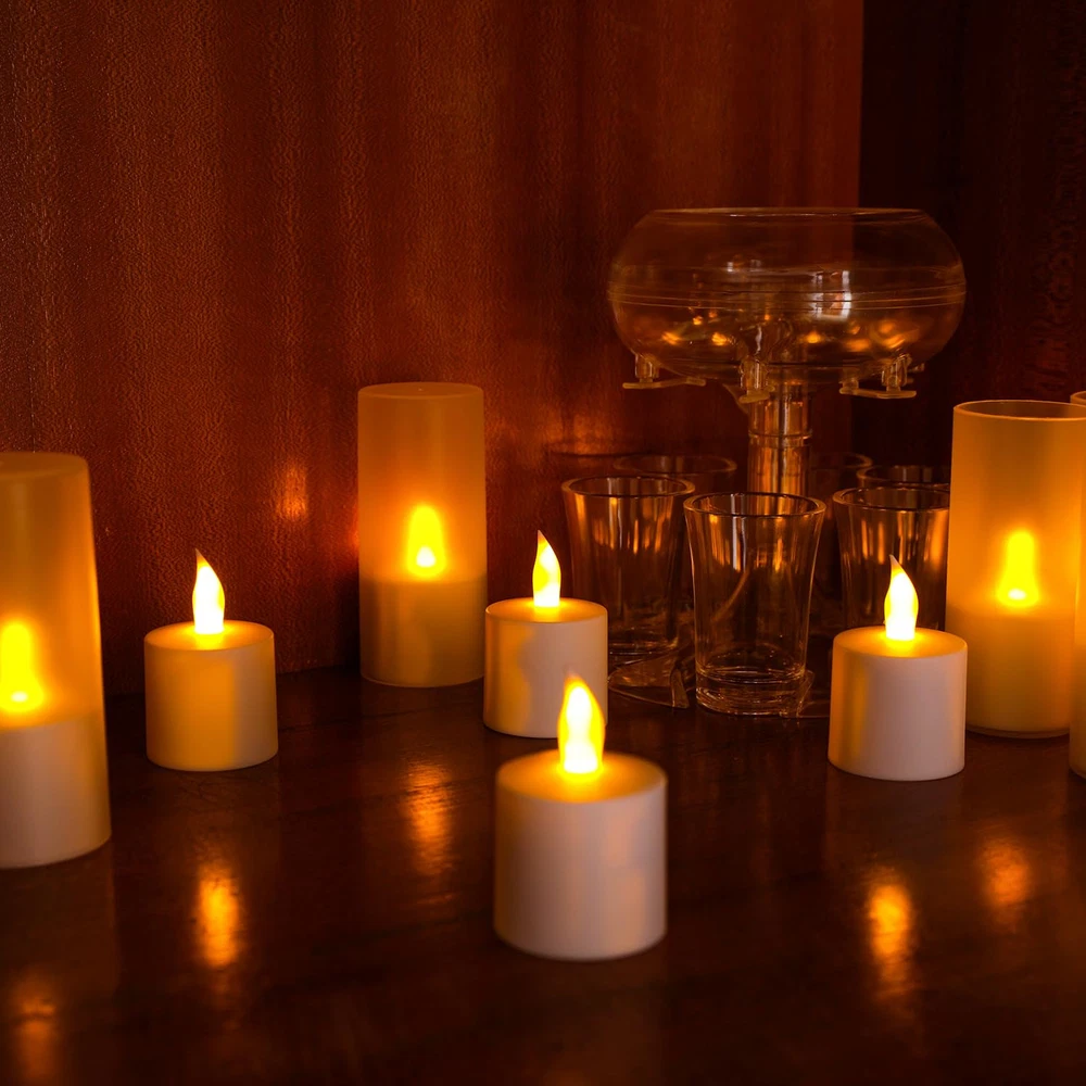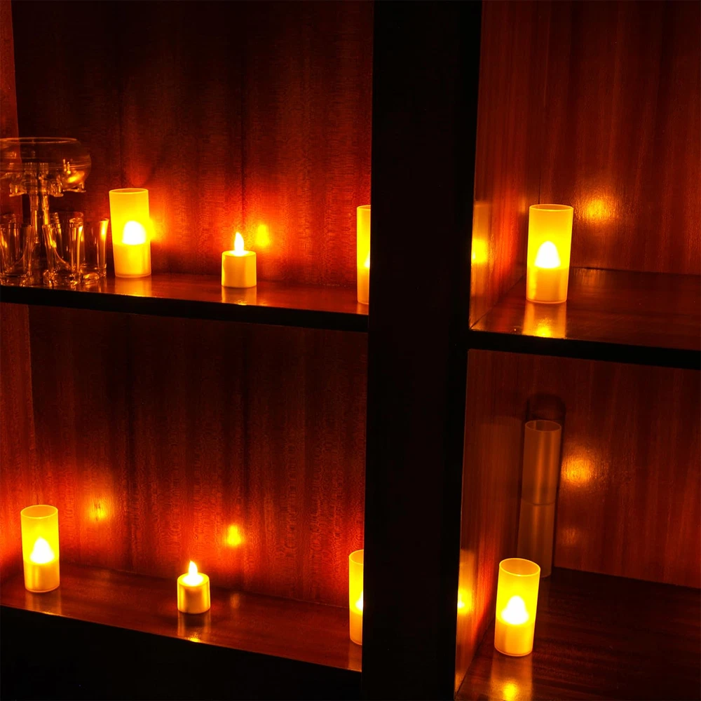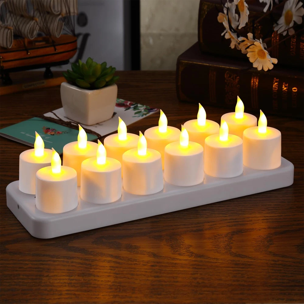 Excellent Performance: Rechargeable candles come with a USB charging cable and remote control, no need any battery candles . 5-7 hours charge can provide about 60 hours use, the indicator light will be green when it is fully charged Complete Set: 12 Flickering Battery Operated Rechargeable Tea Light Candles + 12 Frosted Plastic Candle Holders + 1 usb charging cable + 1 remote control Wide Applications: Perfect for Party Wedding Christmas Birthday's decorations Bedroom. Best Christmas gifts for your families or friends. Ambient home and Reception LED Lights etc Flameless Candles Warm & Romantic: Flameless flickering rechargeable warm white light candles are made of plastic which gives them the appearances of regular warm white flame candles Easily turned on / off via switch on the bottom of each individual light, please turn off the bottom switch before charging