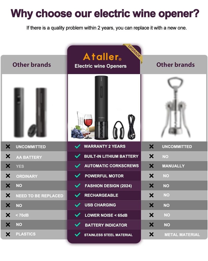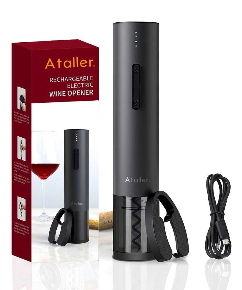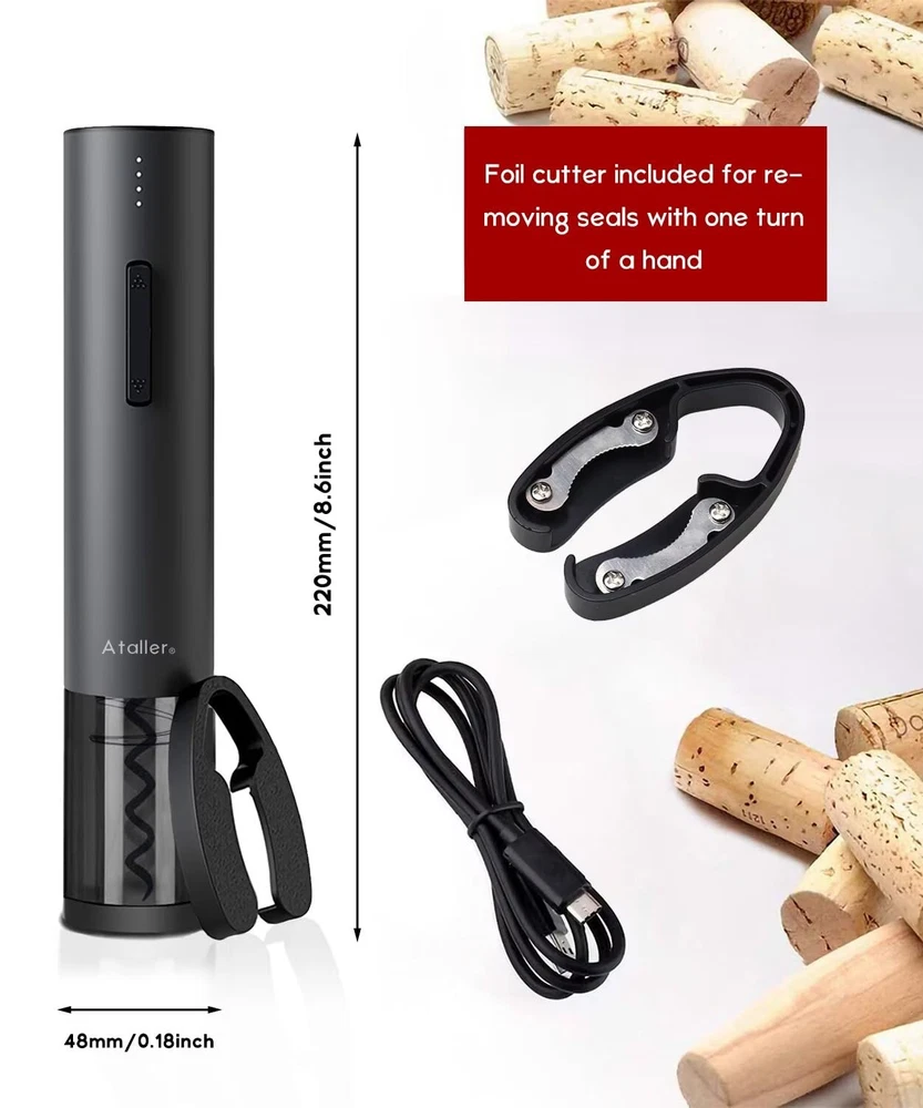 Easy open wine in 6 seconds: Foil cutter included for easily removing the bottle seal; Noiseless and fast, it can safely remove corks in just about 6 seconds, The best choice for wine enthusiast; Destined to become your favorite wine accessory Fashion design: cordless automatic corkscrew opener features a non-slip matte finish exterior with a black transparent shell surrounding the corkscrew mechanism; Blue led is on when removing the cork, Red led is on when exiting the cork, looks very stylish and elegant Powerful and USB rechageable: Built-in rechargeable lithium battery 550mAh battery capacity, Open up to 50-70 bottles on a single charge and charge quickly in 2.5 hours, you can reuse continuously User friendly design: Battery level reminder function displays the power level, you can control the power level and charging at any time; Note: Please charge your wine opener every three months when not in regular use, so as to extend the lifespan of the battery Perfect gift for any occasion: automatic wine opener is a great companion for wine. It's an elegant gift for wine lovers and drinkers at Birthday, New Year's Day, Valentine’s Day, Mother’s Day, Father’s Day, Halloween, Thanks Giving, Christmas, etc