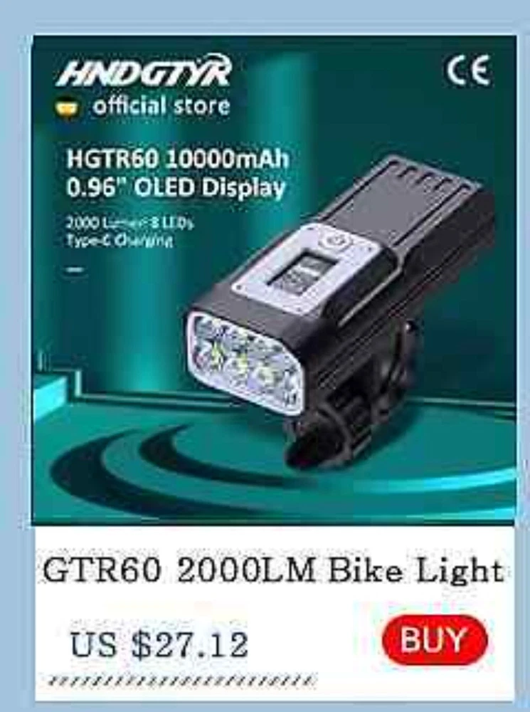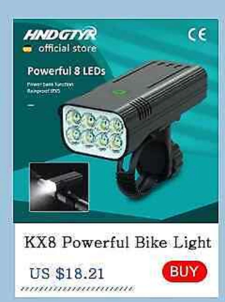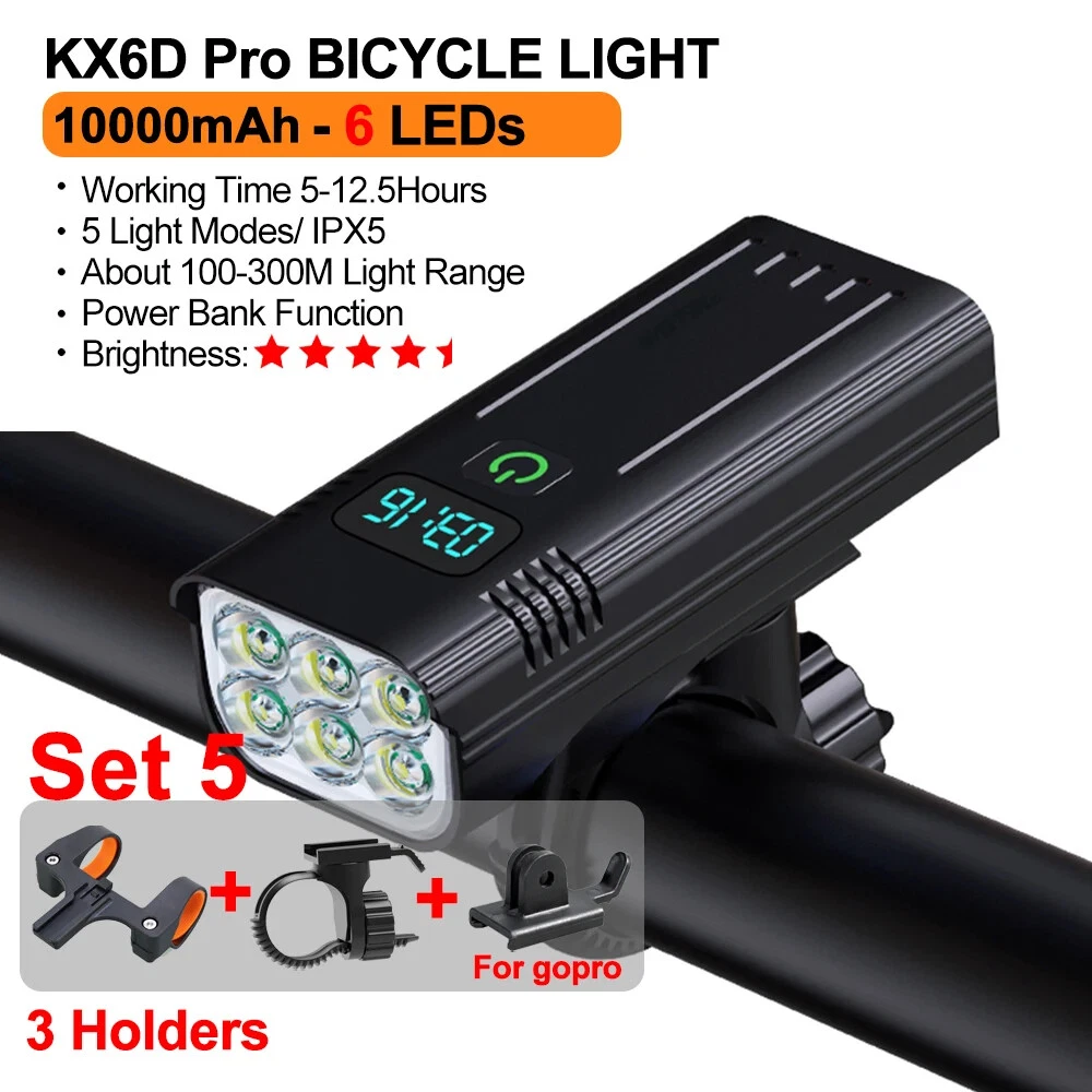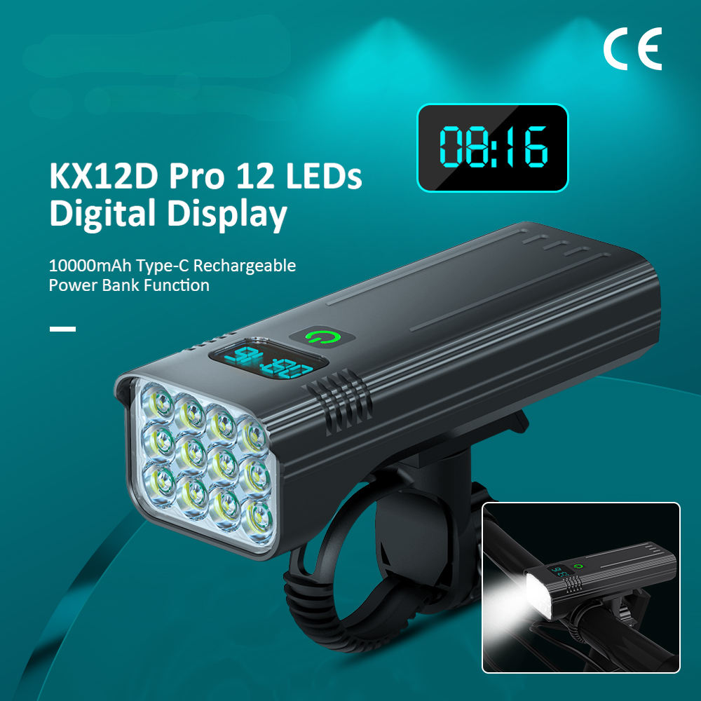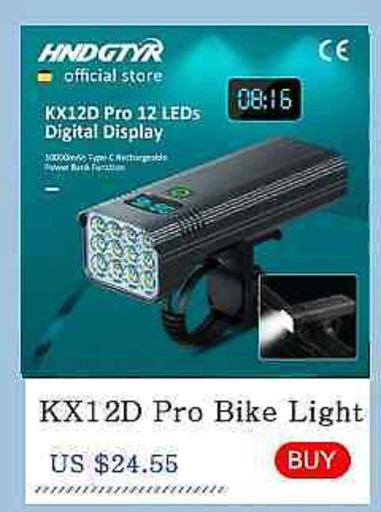 12 LEDs Bicycle Light Max 5000LM Digital Indicator USB Rechargeable Flashlight for Bike Headlight 18650 Battery MTB Cycle Lamp 【SUPER BRIGHT BIKE LIGHT TO KEEP YOUR SAFE】 adopt of extra bright LED bead for hndgtyr bike lights set, provide more than 300+ feet beam length ,You will be shocked and amazed at how bright it is! three light modes- High light, strobe mode and low light .so you can see clearly no matter on a urban road or on a dark lonely country road, excellent to keep you safe at night. 【Battery Power Display & 360° Rotation】 The Bicycle Front Light is designed with battery power display function, showing the actual time of remaining battery, which can help you to master the usage and charging time more conveniently. Moreover, the natfire mount bracket for the headlight is 360° rotatable, allowing you to adjust to the suitable angle according to actual situation during cycling. 【USB RECHARGEABLE】 Save your time to replace batteries every week. Never waste money on batteries anymore. HNDGTYR bike light and optional red rear light come with a CHARGING CABLE that charges from your computer, power bank or any device with a USB port. Built-in intelligence IC can prevents overcharge or over discharge and extend battery life. (Depends on the battery you choose, larger battery capacity, longer runtime) 【WE THINKING MORE FOR YOU】 No any tools needed making it easy to install. Easily mounted and secured with the adjustable mount. it's very easy to take off from bike for recharge and prevent thieves for stealing, portable design for rechargeable bicycle headlights.Water resistant rated to IPX5 - Protected against splashing water from any angle. hndgtyr Product Parameters Model: Bicycle Light HKX Material: Aluminum shell Mode: 3-5 Modes Working voltage: 5V Waterproof: IPX5 Battery:5200-10000 mAh Surface craft: Abrasion resistant anodizing Tips: If you do not use it for a long time, please charge it every three months. Do not shine into the eyes. Keep away from flammable and explosive materials. Waterproof grade is IPX5. Do not immerse the bicycle light in water. Place the bicycle lights correctly. Keep out of reach of children to avoid accidents. HNDGTYR gives you a better riding experience The HNDGTYR KX12D bike light will help you to see the road better when riding at night, both in the suburbs and in the city. Say goodbye to small stones, speed bumps and potholes in the middle of the road! Optical design for a safer ride Good light effect, even light distribution and long irradiation distance. Can effectively eliminate glare, no blinding to the view vehicle pedestrians, protect the safety of both sides Power bank design It's more than just a bike light! Don't worry when your phone runs out of battery on outdoor rides, this bike light can charge your electronic devices! IPX5 rated waterproof design Gives you the freedom to ride unrestricted. Fearless of the elements! 5 Light Modes of Headlight High / Medium / Low / Flash / SOS Comes with a 360 degree swivel bracket Adjustable bike light position at will.Suit for pipe diameter 20-36. 5mm The complimentary bracket is beautifully designed to make good use of handlebar space, allowing you to mount the bike light on the handlebars and freely adjust the rotation to the right lighting position, giving you a more stable cycling experience. ▼How to mount a light to a bike via a bracket? Watch this video▼ Digital screen display function You can see in real time the remaining battery capacity and the remaining usage time of the light USB Charging Output Not only is it a bike light, but it's a power bank! Even when riding outdoors, you don't have to worry about running out of battery power for your phone. This multi-functional bike light will both light up the road for your night ride and provide charging for your electronic devices! TYPE-C fast charging Built-in lithium battery charging protection circuit, automatically stops charging when fully charged Ergonomic design Sleek and beautifully designed, easy to grasp with one hand Digital display design Equipped with a digital display that allows you to see the remaining battery level in real time When charging, the green light breathing . After fully charged, the green light keeps on When power is sufficient,the green light keeps on . When power is insufficient, the green light breathing Equipped with two 21700 batteries Built-in overcharge and overdischarge IC to extend battery life Power indicator: green LED for full power, green LED for weak power Multi-angle display A02 Tail light option Charging input: 5V / 1A (Do not use 9V charger. lt may destroy the tillight) Power supply:One 18650 battery Battery capacity:1200mAh Irradiation distance:100- 1500 metres Light beam angle:120 degtee Waterproof rate:IPX5 (Small rain, Splash water) Charging time:2.5 hours Continuous use:50 hours time