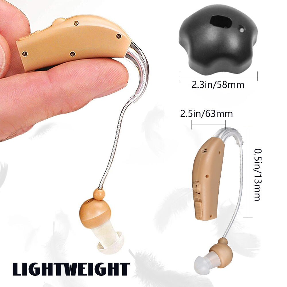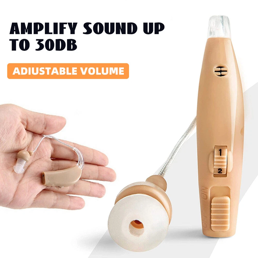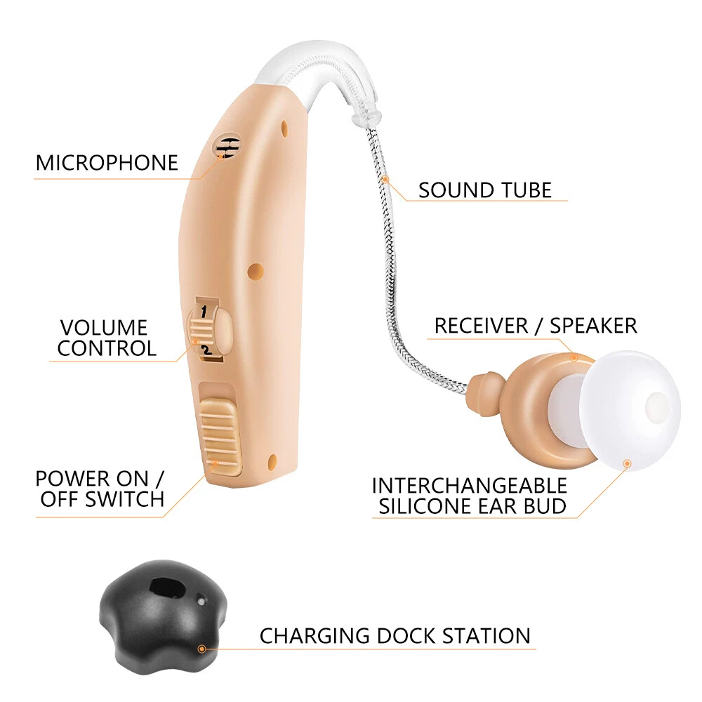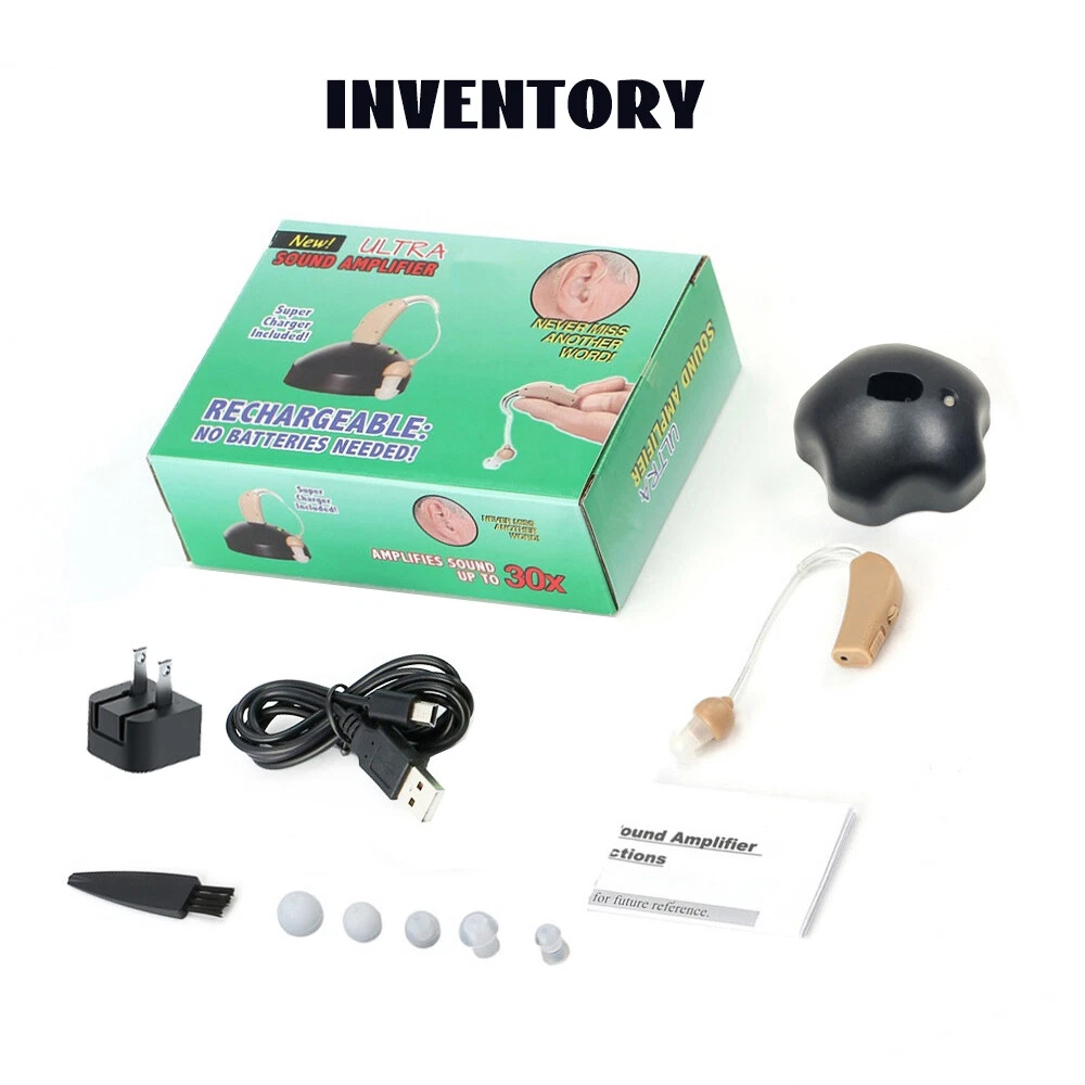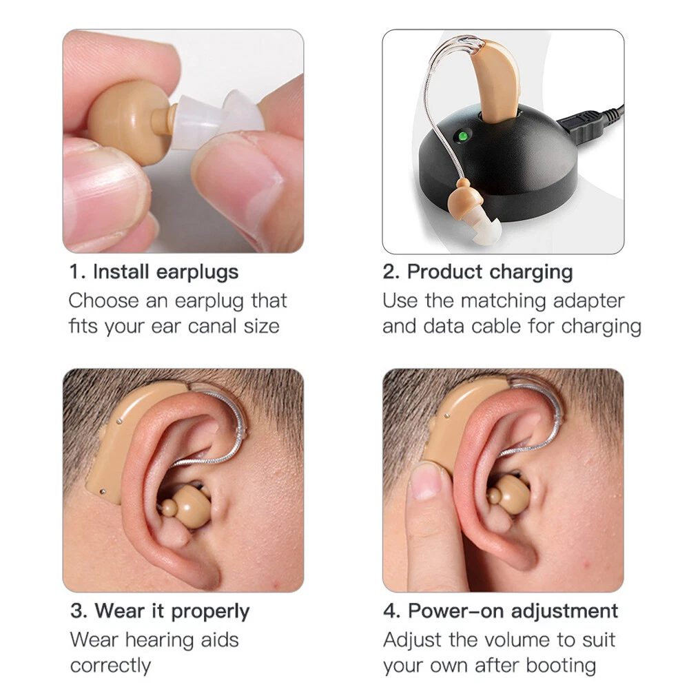 Fea ture : RECHARGEABLE HEARING AIDS: This sound amplifying earpiece comes with a rapid recharging station, so you can just set it on the charging hub once its batteries run low. The charger plugs directly into the wall for your convenience. Once charged, sound amplifier will provide up to 8 hours of continuous use COMFORTABLE TO WEAR: Double medical grade silicone ear plugs, breathable and comfortable, no blockage. Premium silicone ear hooks with bendable sound guide tube, free to rotate and not easy to fall off. AMPLIFIES SOUND BY 30 TIMES: This sound amplifier can amplify sound up to 30 times, allowing you to enjoy conversations, music, television shows, and even birds chirping. The volume is adjustable, so you can change it according to your preference. VIRTUALLY UNNOTICEABLE: It ha s a small, convenient size that makes it virtually unnotic eable to your peers. Additionally, it has clear tubing that makes nearly invisible to others. Its unisex design makes it perfect for both men and women . COMES WITH ACCESSORIES: With your purchase, you’ll receive 1Pcs or 2Pcs sound amplifier, a recharging base, 5 silicone tips, and 1 cleaning brush. The silicone earbuds allow you to customize the fit of your sound amplifier, ensuring that it is comfortable and secure on your ear. Specif ication: Product material: plastic Noise reduction rate: ≤ 28 (decibels) Product function: help hearing Output power: 3.6mW Maximum sound output: 120 +/- 3dB Sound gain: ≥30dB+/-5dB Frequency range: 450-4500MHz Equivalent input noise:≤30dB Harmonic distortion:≤10% Continuous working time:≥20 hours Battery capacity:40mAh battery is rechargeable battery Working current:≤2mA Operating voltage:DC 1.2V Speaker impedance:110 Ohm Charging time:2~3 hours Package include : 1/2/4Pcs Sound Amplifier 1 x USB cable 1 x Charging base 1 x Brush 5 x Ear plugs 1x English manual Detail display