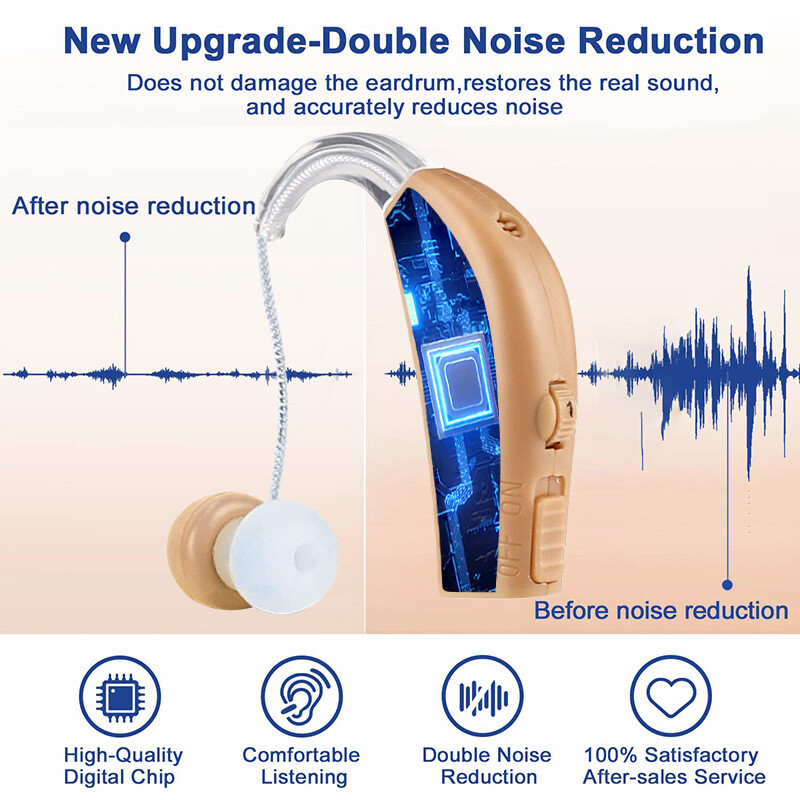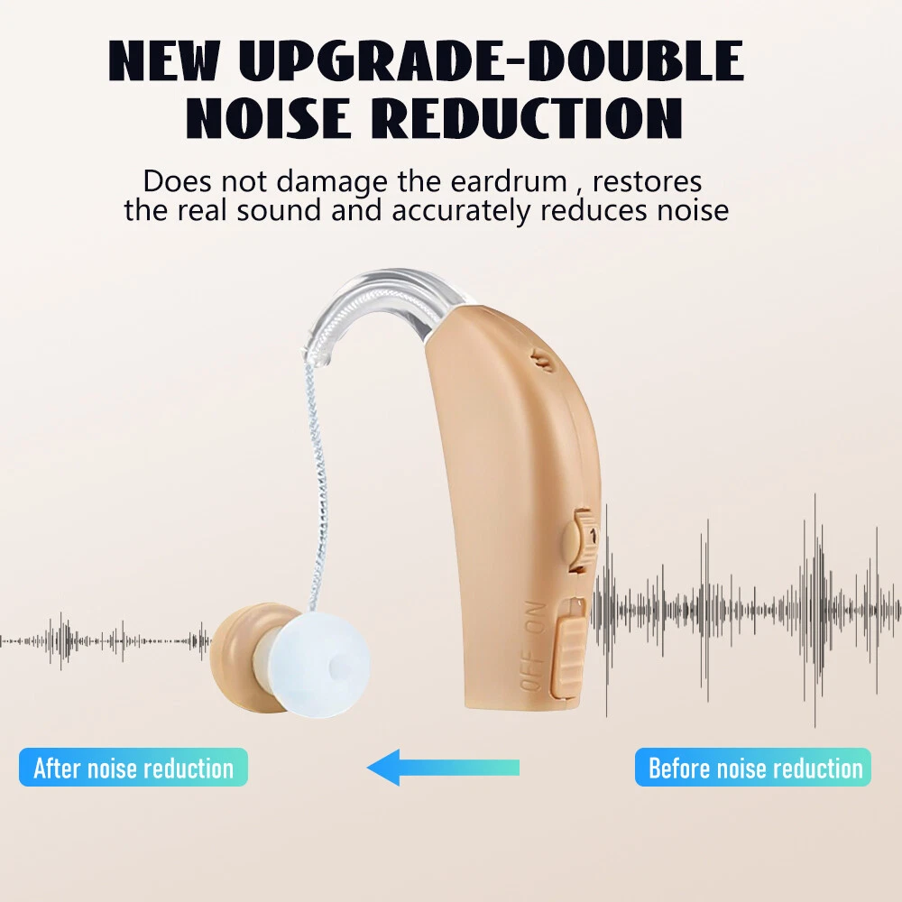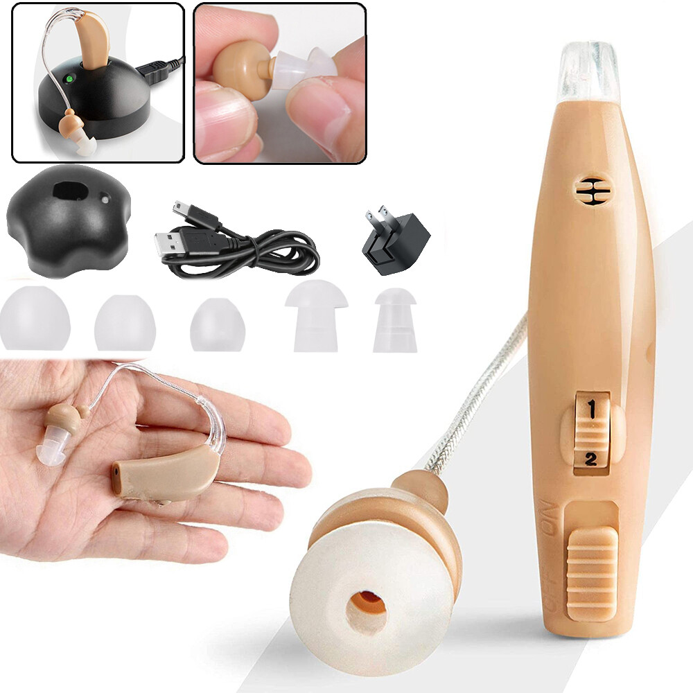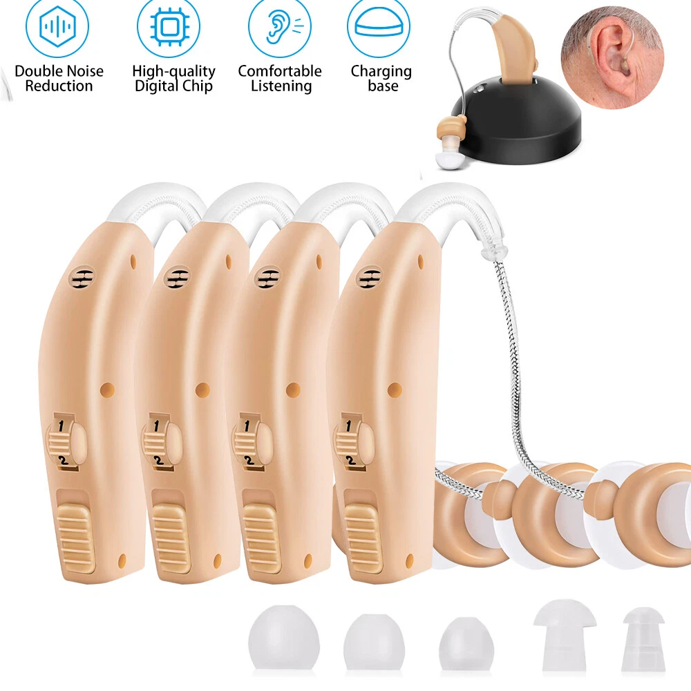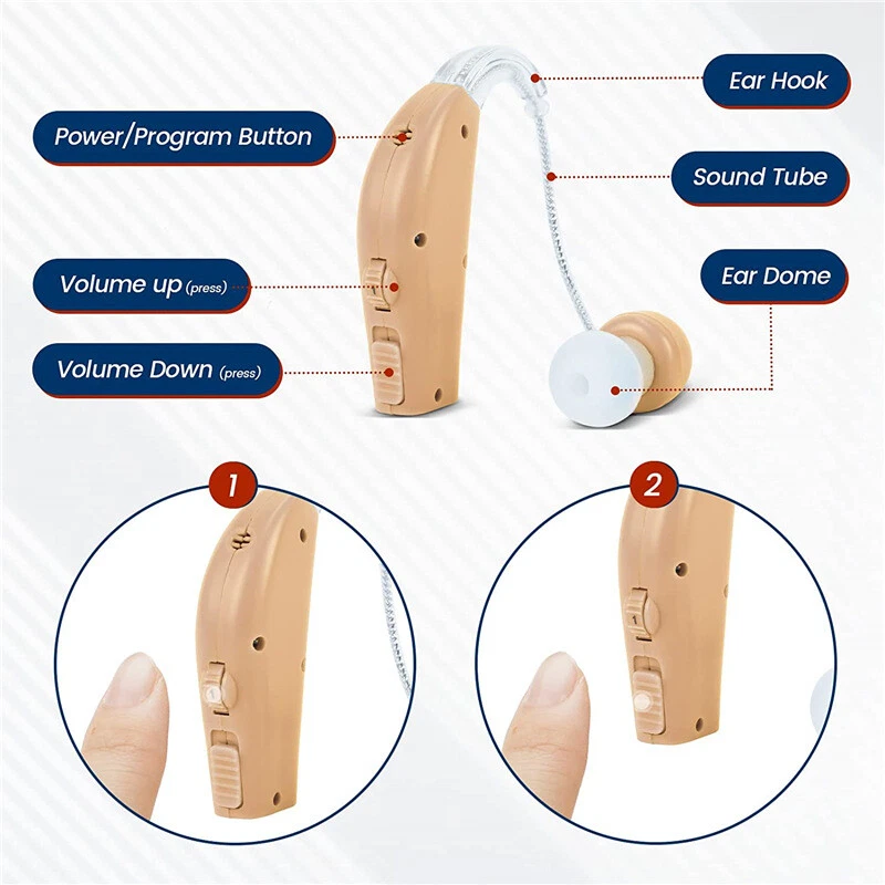 Fea ture : RECHARGEABLE HEARING AIDS: This sound amplifying earpiece comes with a rapid recharging station, so you can just set it on the charging hub once its batteries run low. The charger plugs directly into the wall for your convenience. Once charged, sound amplifier will provide up to 8 hours of continuous use COMFORTABLE TO WEAR: Double medical grade silicone ear plugs, breathable and comfortable, no blockage. Premium silicone ear hooks with bendable sound guide tube, free to rotate and not easy to fall off. AMPLIFIES SOUND BY 30 TIMES: This sound amplifier can amplify sound up to 30 times, allowing you to enjoy conversations, music, television shows, and even birds chirping. The volume is adjustable, so you can change it according to your preference. VIRTUALLY UNNOTICEABLE: It ha s a small, convenient size that makes it virtually unnotic eable to your peers. Additionally, it has clear tubing that makes nearly invisible to others. Its unisex design makes it perfect for both men and women . COMES WITH ACCESSORIES: With your purchase, you’ll receive 1Pcs or 2Pcs sound amplifier, a recharging base, 5 silicone tips, and 1 cleaning brush. The silicone earbuds allow you to customize the fit of your sound amplifier, ensuring that it is comfortable and secure on your ear. Specif ication: Product material: plastic Noise reduction rate: ≤ 28 (decibels) Product function: help hearing Output power: 3.6mW Maximum sound output: 120 +/- 3dB Sound gain: ≥30dB+/-5dB Frequency range: 450-4500MHz Equivalent input noise:≤30dB Harmonic distortion:≤10% Continuous working time:≥20 hours Battery capacity:40mAh battery is rechargeable battery Working current:≤2mA Operating voltage:DC 1.2V Speaker impedance:110 Ohm Charging time:2~3 hours Package include : 1/2/4Pcs Sound Amplifier 1 x USB cable 1 x Charging base 1 x Brush 5 x Ear plugs 1x English manual Detail display