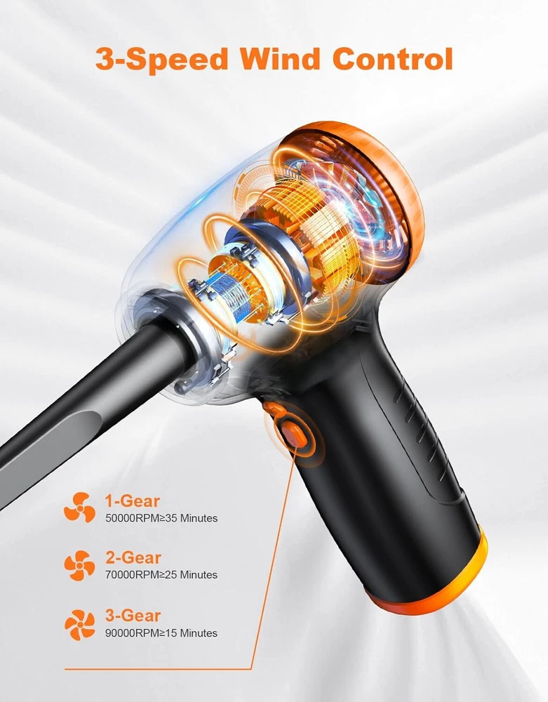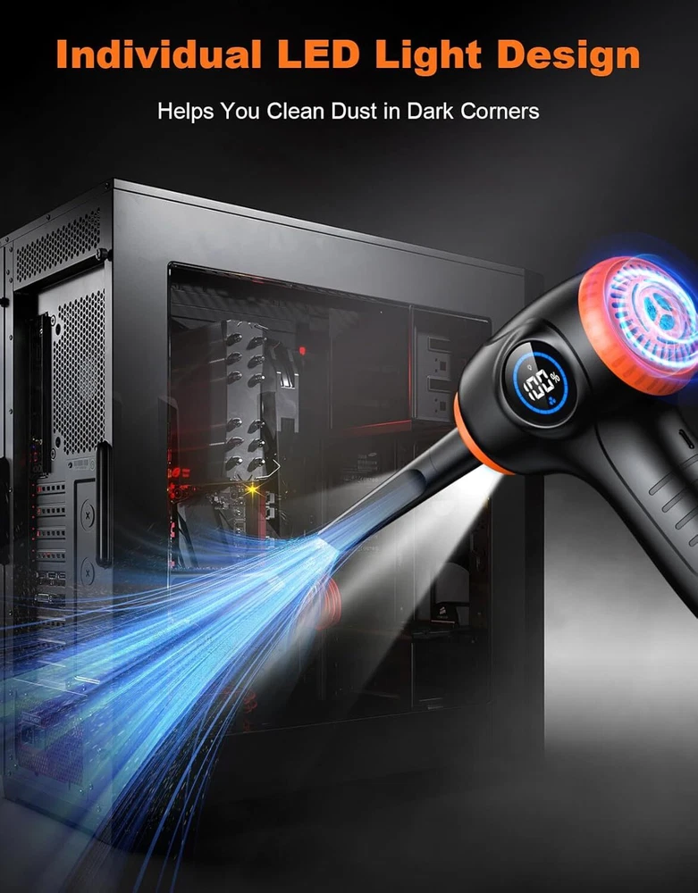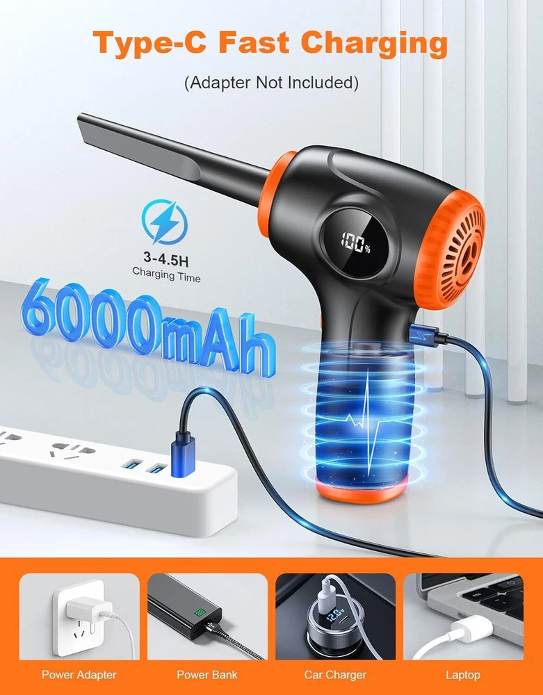 Product Description Compressed Air Duster for PC, Rechargeable Electric Air Duster with LED Light & Power Display, 3 Speeds Max 90000RPM Cordless Air Blower Duster with 5 Switchable Nozzles for Keyboard Car [Adjustable 3 Speed Modes] The compressed air duster is equipped with an upgraded 90,000 RPM high-power motor, providing up to 1.76 ounces of airflow while maintaining noise levels below 90 decibels. With a quick 3-second startup, easily switch between three airflow modes (50,000 RPM, 70,000 RPM, 90,000 RPM) for efficient cleaning of various devices, ensuring dust has nowhere to hide.ensure compatibility with your TV. [Multi-functional Application] With five different nozzle attachments, our air duster is suitable for a wide range of cleaning tasks. Whether it's cleaning dust off a keyboard, tidying up a computer tower, cleaning car seat crevices, or inflating balloons, swim rings, air mattresses, or yoga balls, our multi-functional cleaning tool is up to the task. [Personalized LED Design] The independent LED light button enhances convenience and energy efficiency. When activated, it illuminates hard-to-reach areas, making it easy to remove dust and debris from dark corners. Additionally, the electric air duster is equipped with a large screen for visual appeal and easy monitoring of battery levels. [Excellent Battery Performance] Our air blower includes a USB-C quick charging cable, fully charging within 3-4.5 hours, easily powered by a power adapter, laptop, power bank, or car charger. The upgraded 6000mAh battery offers up to 35 minutes of continuous cleaning power (1st gear: 35 minutes, 2nd gear: 25 minutes, 3rd gear: 15 minutes). [Lightweight & Comfortable] The compressed air for computers measures 6.89 x 4.25 inches and weighs only 550 grams, making it compact, lightweight, and easy to carry. The ergonomic handle provides a comfortable grip. Whether at home, in the office, or on the go, it's an excellent cleaning assistant. About Us We are a reputable seller with many years of experience selling on eBay. Our goal is to provide high-quality products and excellent customer service. Payment 1.We accept PayPal only. 2.All major credit cards are accepted through secure payment processor PayPal. 3.Payment must be received within 7 business days of auction closing. 4.We ship to your eBay or Paypal address. Please make sure your eBay and Paypal address is correct before you pay. Feedback will be left automatically after we receive your feedback. Please contact us before leaving a Negative feedback or Neutral feedback. We would try our best to help you solving any problem. Shipping Items will be shipped within 1-3 business days when we received payment. (Orders are not processed on weekends & holidays) Tracking information will be sent once item is shipped. Delivery time depends on destination and other factors Item is shipped to ebay address. Leaving correct address can minimize delay. For international shipping and shipping to Guam, Hawaii and Alaska, Please contact us before placing the order. International buyers please note: Import duties, taxes and charges are not included in the item price or shipping charges. These charges are buyer’s responsibility. We will try our best to reduce the risk of the custom duties. Local pick-up is unavailable at the moment. Returns For any issues with Defects, Return, Item Exchange request, please contact us first and send us a message first before opening any type of case or request. We devote ourselves making EVERY CUSTOMER in 100% Satisfactory and resolve any problem. We highly value and appreciate your business. Thank you. No returns will be accepted without an RMA number. Please contact us for the RMA number. Return is acceptable within 30 days of delivery. Return for replacement or money back is optional. Returned items must be in the brand new, unaltered and resalable condition. Seller is not responsible for any labor cost, expense in a dealer store, or damage due to wrong installation. Contact Us We reply any email messages within 1 business / working days(off-duty at weekend). If you do not get a response from us, then please check your junk or spam mailbox. Our Business hours: Mon-Fri 9:00-18:00, UTC/GMT +8 hours. Please contact us either by clicking "contact seller" in the "purchase history" section or simply click "ask a question" at the bottom of this page. If you are unsatisfied with our item or service, please contact us before leaving any feedback. We are committed to resolve all issues in a friendly and satisfactory manner. powered by