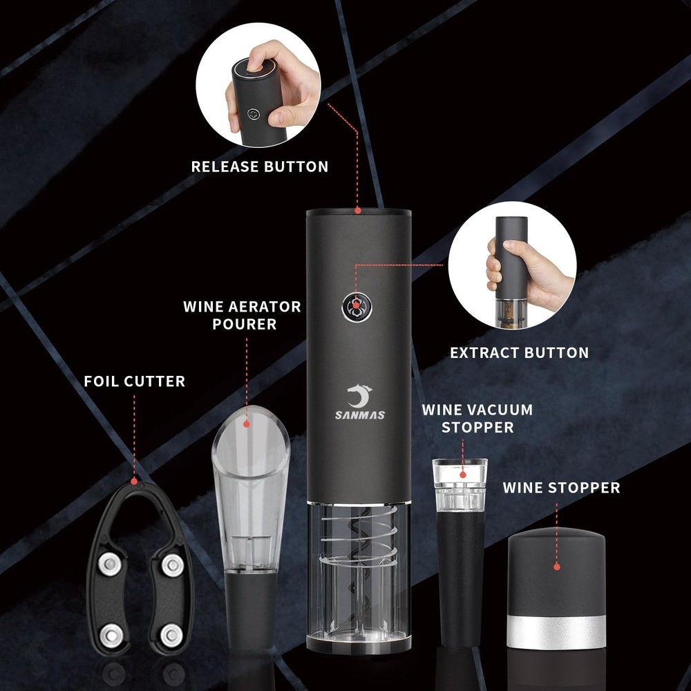 MULTIFUNCTIONAL TOOLSET: In addition to the automatic corkscrew, this electric wine opener set includes a foil cutter for removing wrappers, wine pourer for proper pouring, and 2 wine stoppersf or sealing partially consumed bottles AUTOMATIC OPENING: This electric wine bottle opener effortlessly removes corks with one touch of the button and release the cork with the top button, no twisting or struggling required RECHARGEABLE CONVENIENCE: A full charge takes about 3-4 hours and provides enough power to remove up to 80 bottles. Simply recharge via included USB cable for cordless use anytime PERFECT GIFT FOR WINE LOVERS: With its modern look and versatile functionality, this electric wine opener makes a thoughtful gift for entertaining at home or on-the-go. It takes the work out of opening bottles and enhances the wine drinking experience 100% GURANTTED: We are a manufacturer of red wine corkscrews and wine peripherals integrating R&D, production and sales. The electric corkscrews we provide you have passed and obtained CE, ROHS, FCC and other relevant mandatory certifications. If you have any questions when using the product, feel free to contact us