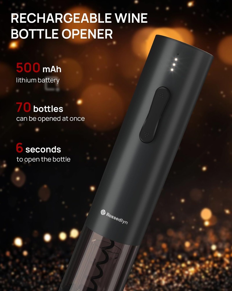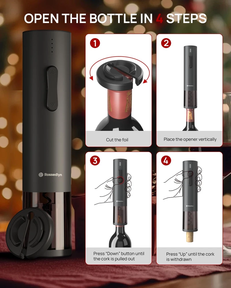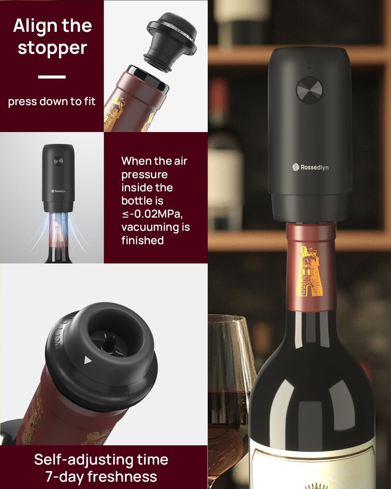 Surprise Gift for Wine Lovers: The electric wine opener set with complete wine accessories, give you the most comfortable wine drinking experience. The wine opener set is packaged in a classic and elegant gift box, making it an extremely attractive gift option for Christmas, Anniversaries, Birthdays, Thanksgiving, Mother's Day, Father's Day, Housewarming, Valentine’s Day, Weddings etc Electric Wine Opener: With just a gentle touch of a button, the automatic wine opener effortlessly removes corks within seconds, capable of opening up to 70 bottles of wine continuously on a full charge. Crafted with a high-quality stainless steel exterior and classic color scheme, the thoughtfully designed indicator light keeps you informed of the opener's battery level at all times and enjoy opening bottles Automatic Wine Aerator: The one-touch automatic pourer fully oxygenates the wine during the pouring process, softening tannins and enhancing the original flavor and aroma of the wine. A glass of better-tasting wine is often the perfect companion for memorable moments! Electric Wine Vacuum Pump and Vacuum Stopper: The stopper is made of high-quality ABS material and food-grade silicone, complete with a date setting. Simply align it with the stopper and press the vacuum pump switch to automatically extract air from the bottle, preserving the wine for up to 7 days while maintaining its original flavor and aroma Worry-Free Customer Service: Your satisfaction is our top priority. The electric wine opener set comes with a 12-month limited warranty, please contact us if you have any issues, we’ll be happy to help