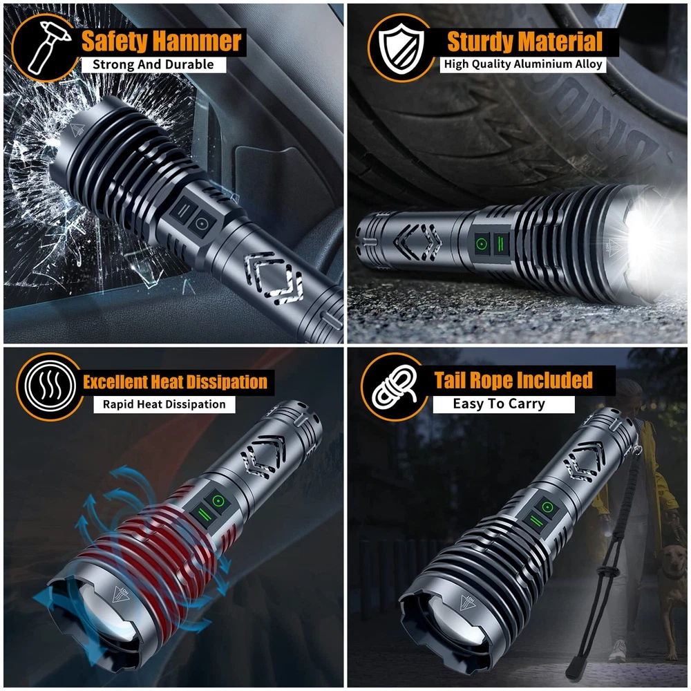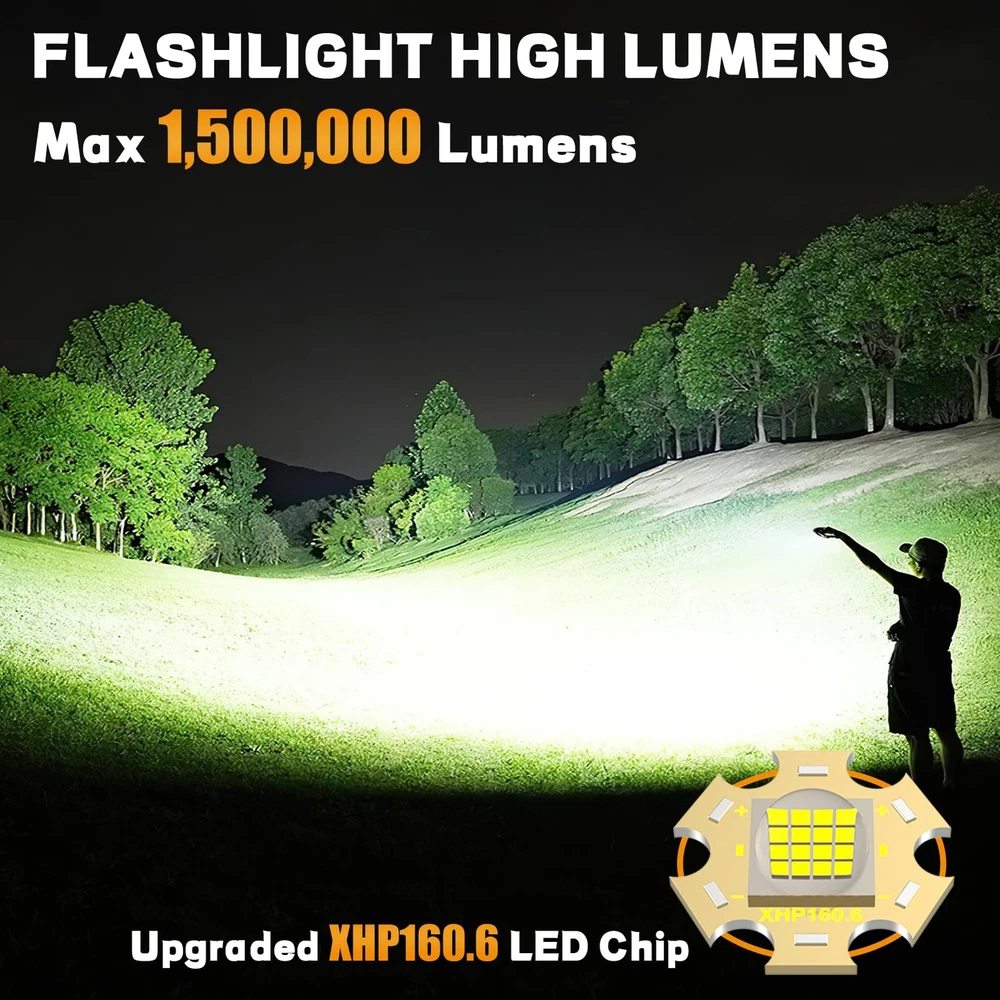 【BRIGHTEST FLASHLIGHT/Flashlights 1,500,000 LUMENS 】With 16 beads, the super bright Flashlights powered by XHP160.6 LED chip is not only brighter than Flashlight with fewer beads such as the XHP90, XHP70 and XHP50, but also brighter than Flashlights with 36 beads, whose light is dispersed across 36 squares. Our Rechargeable LED Flashlights High Lumens can support a maximum output of 1,500,000 lumens, which is about 30 times brighter than a regular LED Flashlights. 【WITH ZOOMABLE ADJUSTABLE & 6 LIGHTING MODES】Compared to the traditional Flashlights with only 5 modes (high/medium/low/sos/double flash), our powerful Flashlights with 1,500,000 lumens have a new super bright mode to meet the brightest lighting needs. In addition, we have set up a separate function key to the Super Bright Flashlight to make the sos and double flash functions more convenient to use. 【POWERFUL BATTERY & USB RECHARGEABLE Flashlight】Built-in fast charging chip, twice as fast as the charging speed of ordinary USB Flashlight rechargeable. This high-power Flashlight can work about 8-20 hours on a single charge. With circuit protection, such as overcharge protection, over-discharge protection, over-voltage protection, short-circuit protection, etc., which can extend the life of the Flashlight high lumens rechargeable up to 200000 times. 【IP67 WATERPROOF & SHOCKPROOF TACTICAL FLASHLIGHT】The Super Bright rechargeable Flashlight is specially made of aviation grade aluminum alloy all over. With the thick rubber ring can do IP67 level of waterproof, dust-proof, drop-proof. There is no problem to use the rechargeable Flashlights in extreme weather such as heavy rain and snowstorm. We also customize the tactical Flashlights with five parts of heat dissipation area, so the bright flashlight has good heat dissipation performance. 【WIDELY USED & OUTDOOR ESSENTIAL HANDHELD FLASHLIGHTS】This rechargeable Flashlight for emergencies can be used as an emergency energy source to charge some common USB devices, such as cell phones, headphones, etc. Powerful Flashlights high lumens are not only suitable for daily use such as camping, night dog walking, night running, night fishing, night riding, hiking, but also for police night patrol, car maintenance and other workplace such as gas stations, charging stations, chemical labs, airports, warehouses, etc. 【FLASHLIGHT PACKAGE】: What you get: 1 x LED Flashlights High Lumens, 1 x 5000mAh Battery, 1 x Charging Cable and 1x Manual and 1 x Gift box. We have carefully checked all flashlight rechargeable before shipment and ensured that the products are working properly. Most importantly, we provide 7*24 hours customer service. If you have any questions, please to contact us.