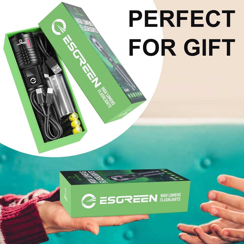 [ ULTRA LONG RANGE - 3280 FT & ADJUSTABLE FOCUS ] The ED2405B rechargeable flashlights high lumens is made of improved PH-L330 30W LED which has the features of high concentration and ultra long range, you can adjust the focus from narrow to wide. It is a high concentration circle beam, it can be used as a spotlight to illuminate on objects up to 3280 feet away even if it is fog day or rainy day. It is quite ideal for camping, hiking, night walking or other emergency situations. [ SINGLE 2 MODES HIGH/LOW - BRIGHTNESS ADJUSTABLE ] The LED flashlight rechargeable USB C is single modes, only high or low mode without annoying strobe or SOS. It is easy to adjust the correct brightness you need according your situation. The brightness can be up to 1000000 Lumens, it can easily illuminate a whole room and backyard of 500 square meters. It is suitable for night work or power failure. [ MULTIFUNCTIONAL 2-IN-1 USB C CHARGING & DISCHARGING ] The super bright LED flashlight long range is built-in 2 USB interfaces, one is USB C input for charging, the other is USB output for discharging such as it can charge your phone for emergencies. It supports various of USB devices such as smartphone, earphone, computer etc. It is convenient to get charged or discharged in indoor or outdoor activities as the USB C interface is universal that can be replaced. [LONG LASTING 10H & UPGRADED LCD DIGITAL POWER DISPLAY] The high powered flashlight long beam is equipped with 1pcs 6000mAh rechargeable battery, so it can provide up to 10 hours of powerful and non-diminishing brightness. Both the battery and flashlight are built-in a smart chip that has the overcharging protection to ensure safety. The LCD power display shows remaining power exactly, you will get known when to charge it in advance. [ STYLISH LOOK WITH FLUORESCENT STRIP & COMPACT SIZE WITH CLIP ] Different with others, the powerful flashlight rechargeable is inset 6pcs of fluorescent strip on the head, it can glow with different colors in dark, with compact handheld size, it looks beautiful and quite cool. It is only about 6.41 inch long, lightweight and portable to carry and storage in your pocket backpack or drawer at home. With a clip, it is easy to put on your waist belt. [PRACTICALLY INDESTRUCTIBLE & IPX7 WATERPROOF] The body of the high intensity flashlight long distance is made of super hard aviation-grade aluminum alloy, impact resistance, wear-resistant and drop-resistant. It is strong enough to withstand a 10 feet accident drop and even ran over by a truck, it still works! IPX7 waterproof flashlight long lasting has a built-in high tenacity seal rubber waterproof ring, so there is no any problem to be used in any bad weather, such as rain or snow day. [PACKING LIST & EXCELLENT CUSTOMER SERVICE] You will get 1x ED2405B flashlight (6000mAh rechargeable battery included), 3x AAA Alkaline batteries, 1x USB C to USB A cable, 1x USB C to USB C cable. We are providing high quality products and the best customer service as our aims. You will be pleasantly surprised by the brightness, quality, longevity and performance of the most powerful flashlight. If you have any questions, please feel free to contact us. We will be happy to answer your questions.