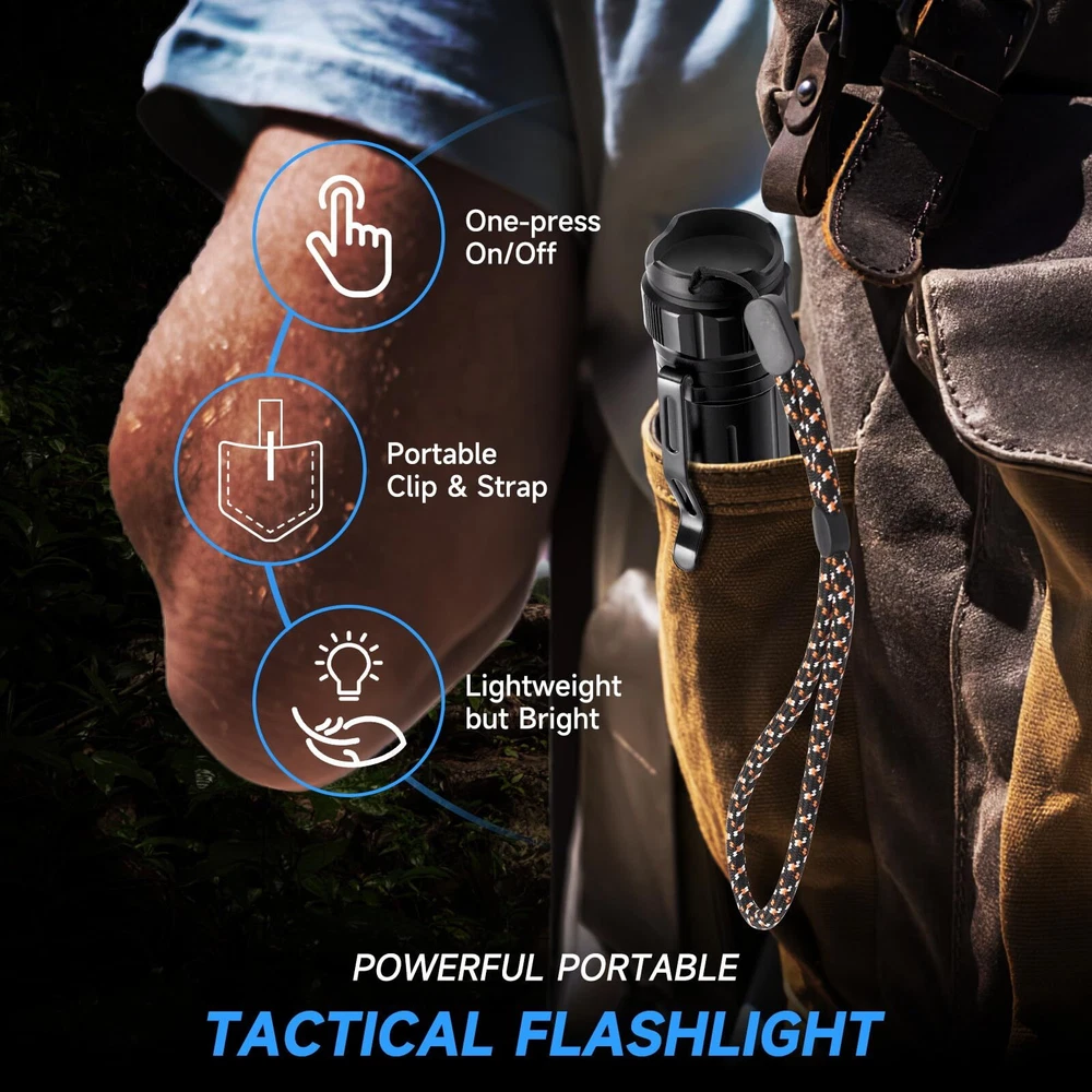 【Small but Bright】 The small rechargeable flashlight features an upgraded chip to provide the brightest light. The performance is improved by 50%, and it's 5 times brighter than ordinary LED flashlight. With a lighting range of over 1680 feet, it can easily illuminate an entire mountain. At the same time, designed with a built-in clip and hand strap, our flashlight is easy to carry and attach to your backpack, belt, or pocket. It's compact in size, making it a reliable companion wherever you go. 【Powerful & Versatile】 Our tactical flashlight offers 5 different modes - High/Medium/Low/Flash/SOS allowing you to adjust the brightness and functionality according to your needs.Flashlight is designed with a zoom function. Zoom in, zoom out – it’s all under your control! The unique memory mode allows you to close it by just pressing and holding it for 2S. The next time you open it, it will still be in the previous mode, eliminating the need to cycle through it every time you close it. 【Never Worry About Running Out of Power Again!】Not only does our powerful flashlight serve as a reliable lighting tool, it also comes with a convenient remaining battery display, so you never have to worry about when it needs to be recharged. Plus, it can even double as a power bank, allowing you to charge your phone or other devices on the go. 【Durable & Waterproof】px Our waterproof flashlight features advanced sealing technology to stay waterproof so you can brave rain, storms, and any challenging weather conditions. This high powered flashlight is made from aircraft aluminum alloy and has been rigorously tested to withstand accidental drops up to 36 feet and rough handling. Ideal for outdoor running, camping, fishing, hiking and exploring. 【Exceptional Customer Service】We firmly believe in the quality of our products and offer a reliable after-sales service. If you encounter any issues or have any questions, our dedicated customer support team is here to assist you. So why settle for a regular flashlight? Choose ours, this top-of-the-line flashlight that's both compact and incredibly bright! Get your hands on it now and be prepared for whatever the darkness throws your way.