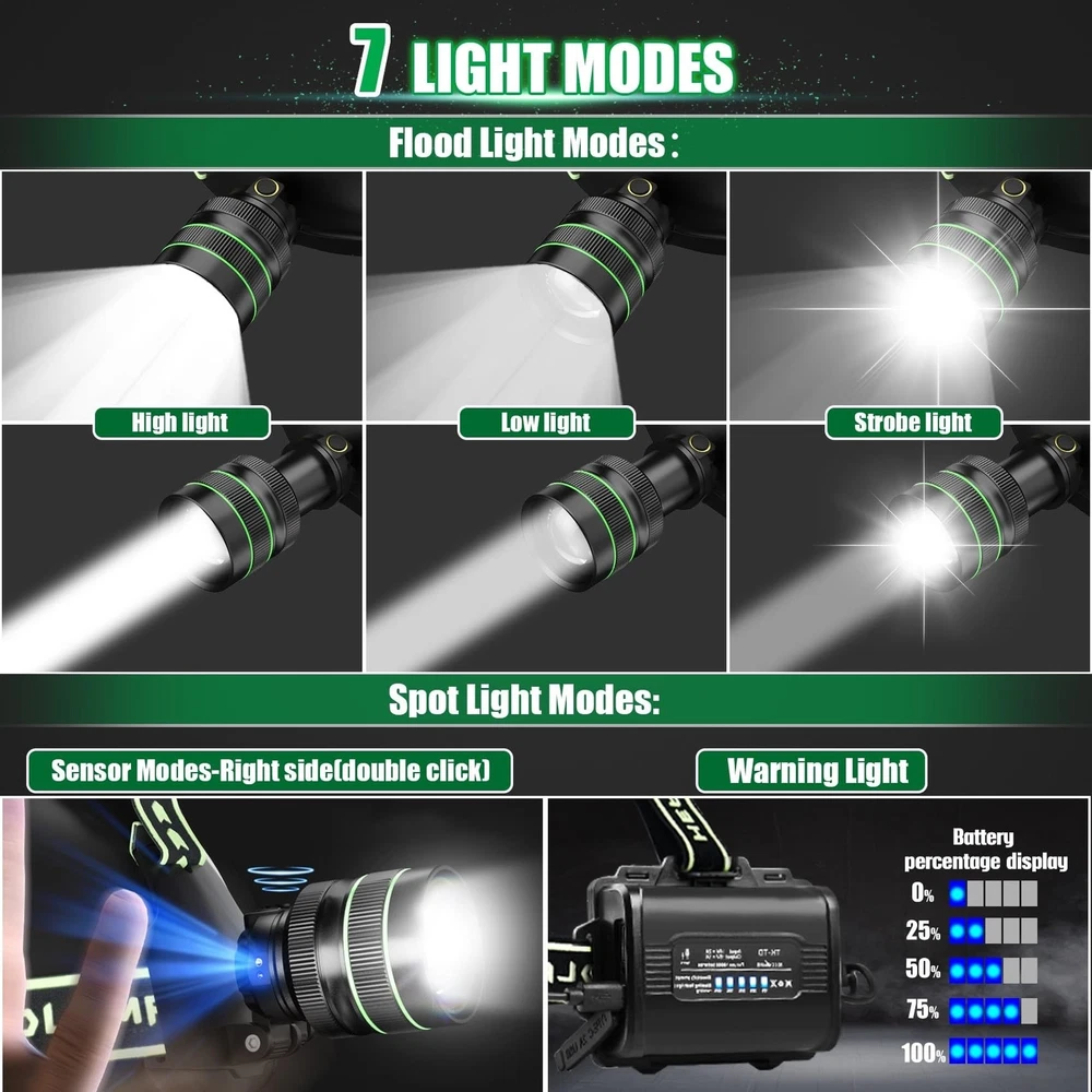 Rechargeable Headlamp, 100000 Lumens LED Super Bright Headlight with Motion Sensor, 5 Modes Zoomable Head Lamp, 180°Adjustable, IPX6 Waterproof Head Lamp for Camping, Running, Climbing, Hiking Product Details Special Feature: Portable, High Power, Adjustable Light Modes, Adjustable Focus, Rechargeable Color: Black Power Source: Battery Powered Light Source Type: LED Material: Aluminum Product Dimensions : 1 x 1 x 1 inches; 1.14 Pounds Item model number : LED Rechargeable Headlamp 088 Batteries : 1 Lithium Ion batteries required. (included) Date First Available : August 7, 2024 Manufacturer : Northlet LED Rechargeable Headlamp Country of Origin : China Customer Reviews: 4.4 4.4 out of 5 stars 65 ratings Special Feature: Portable, High Power, Adjustable Light Modes, Adjustable Focus, Rechargeable Color: Black Power Source: Battery Powered Light Source Type: LED Material: Aluminum White Brightness: 100000 Lumens Included Components: 1*Rechargeable LED Headlamp, 3 *Rechargeable Battery, 1*USB Cable, 4*Hard Hat Clip Product Dimensions: 1"D x 1"W x 1"H Voltage: 5 Volts Light Path Distance: 1000 Meters Battery Cell Composition: Lithium Ion Number of Batteries: 1 Lithium Ion batteries required. (included) Water Resistance Level: Waterproof Warranty Type: Extended Brand: Northlet Brightness: 100000 Lumen Runtime: 6 hours Style: Rechargeable Headlamp, 100000 Lumens LED Super Bright Headlight with Motion Sensor, 5 Modes Zoomable Head Lamp, 180°Adjustable, IPX6 Waterproof Head Lamp for Camping, Running, Climbing, Hiking Finish Type: Polished Recommended Uses For Product: Hunting, Climbing, for Outdoor camping, Running, Hart hat, Cycling, Emergency, Fishing, Repiring, Home use, Hiking Manufacturer: Northlet LED Rechargeable Headlamp Age Range (Description): Adult Part Number: LED Rechargeable Headlamp 088 Item Weight: 1.14 pounds Country of Origin: China Item model number: LED Rechargeable Headlamp 088 Batteries: 1 Lithium Ion batteries required. (included) Item Package Quantity: 1 Finish types: Polished Special Features: Portable, High Power, Adjustable Light Modes, Adjustable Focus, Rechargeable Batteries Included?: Yes Batteries Required?: Yes Wattage: 60 watts Date First Available: August 7, 2024 Super Bright 100000 Lumens HeadlampThis rechargeable headlamp with a zoomable function boasts a powerful 60W LED chip, Delivers up to 100,000 lumens, the maximum irradiation distance can reach 1000m/3280ft, USB headlights run time can reach up to 6-12 hours. Headlamp flashlights are the best choice for jogging, camping, fishing, hiking, running, backpacking. 5 Lights ModesThis brightest headlamp flashlight offers 7 main modes: flood mode (high - low - strobe), spotlight mode (high - low - strobe), sensing mode - right (double tap), and a warning light blue light on the back of the LED headlamp, which turns on to ensure your safety in the dark. 180 AdjustableThe LED headband can be adjusted 180 degrees by a simple upward or downward movement, lighting you from different angles to fully achieve the outdoor effect you want, head lights for forehead uses a comfortable elastic strap, which can be easily adjusted in length to perfectly fit on the head, hard hat and helmets. Headlamps for adults are ideal headlamps for outdoor adventurers. Zoomable HeadlampThe headband light features a telescoping zoom. Pulling back the head of the running headlamp switches it to floodlight mode, and pulling the head forward switches it to spotlight mode. While using a headlamp, the spotlight mode is best for long-distance lighting while the floodlight mode is best for headlamp wide-range lighting. You can switch modes according to your different environments. USB Charging & Power OutputVersatile head lamp is specially designed with USB charging and power output, you can use any USB-C port to charge the headlamp when you are outdoors, You can also use the adjustable headlamp USB output is designed to be used as an emergency power source to charge smartphones, PCs or other devices, bringing more convenience to your outdoor activities. IPX6 Waterproof IPX6 waterproof headlamp has been professionally tested outdoors, it is extremely waterproof and drop resistant, suitable for use in rain, snow, or bad weather outdoor activities situations. Do not immerse this head lamps outdoor LED rechargeable directly in water or discard the dust cover of the charging port, as these may directly damage the rechargeable outdoor headlamp. Digital Power DisplayThe led rechargeable headlamp With digital display function, so you can see the power level at a glance and control the remaining power at any time,it is convenient for you to charge it in time. Northlet high lumen headlamp is your best Choice as a camping headlamp to wear.