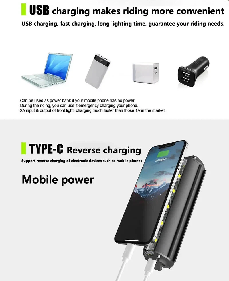 Name: Bicycle headlight Material: aluminum alloy Size: 9.1cm/15.1cm*4.1cm*3.0cm Height: 1800/2800/2400/5200 lumens Lamp beads: TG3/XPG/P9/lamp beads Battery: 3.7V/2000/4000/4000/8000mAh built-in rechargeable lithium battery Endurance time: 4h-10h Charging time: 3h/4.5h/4.5h/8h Waterproof grade: IPX5 Charging method: TYPE-C Reverse Charge: Power Bank (S630 and S640 support, S610 and S620 not support) Mode: 4 light modes Features: Battery display, mobile power supply, aluminum alloy, German anti-glare design, 180-degree wide-area lighting, bicycle handlebars can be installed within 3.5cm in diameter. Product includs: Bicycle headlight*1 Aluminum bracket*1 Anti-skid pad*1 Bracket belt*1 Data cable Type-C*1 Note: S620 and S640 have 2 Aluminum brackets