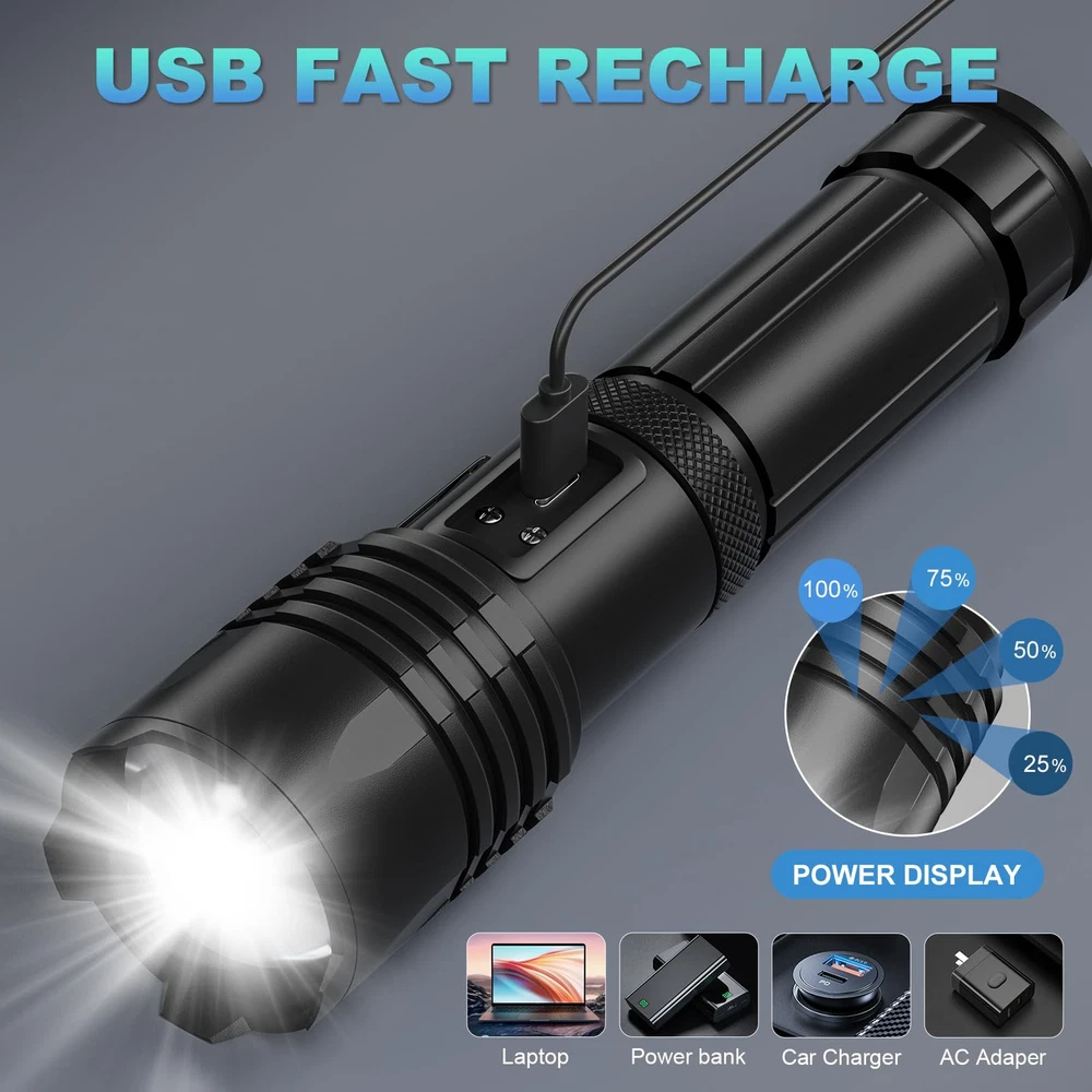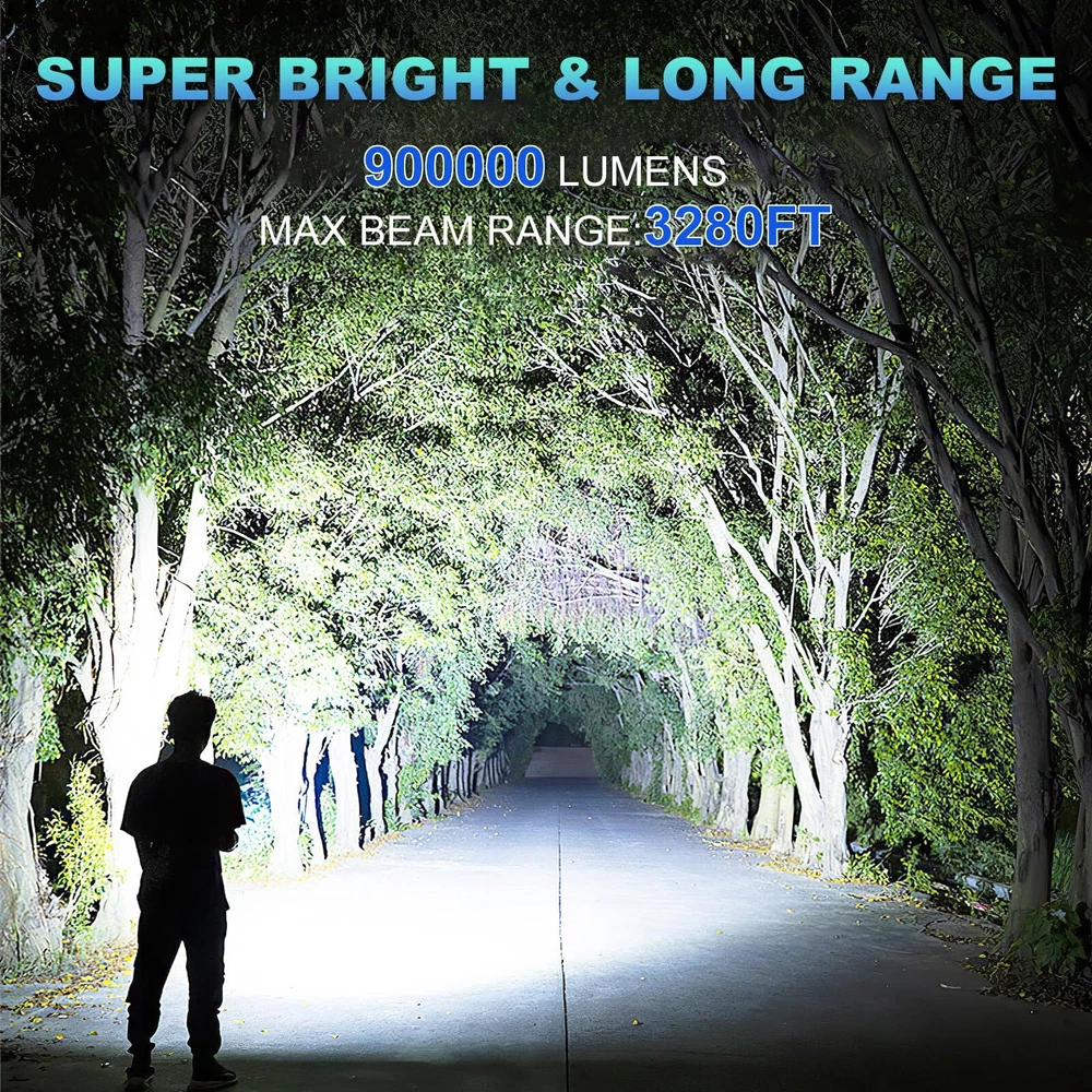 [Still worried about the flashlight isn't bright enough?]: Try our 2 pack 990000 lumens brightest Flashlight.This Rechargeable flashlights high Lumens powerful flash lights up to 30 times brighter than ordinary LED flashlight.The Super Bright Flashlights can clearly illuminate things within 3280 feet (1000m) on a dark night, easily lighting up an entire room or backyard. [Rechargeable flashlight]: Our flashlights are rechargeable with USB ports. It can be charged from power banks, outlets and laptops for easy indoor and outdoor charging. [Flashlights often run out of power quickly?]: Try our latest ultra strong flashlight, which only needs to be charged in 3-4 hours to provide a minimum efficiency of up to 12 hours. For camping, hiking, fishing, barbecuing, dog walking or any other outdoor activity you want [Meet various lighting needs-7Modes]: This strong handheld flashlight have 3 Main Light: high, medium, strobe, and 4 cob sidelight: High,medium,Red,Red Strobe.(Quickly press the on/off button twice to switch to the COB modes.) Powerful flashlight combined with cob light leaves your hands free to do other things at night. Whether you need to light up a vast expanse of space or just need a reliable source of light for your next camping trip, this flashlight has got you covered! [Waterproof & anti-slip Long-lasting]: The flashlight is IPX7 waterproof.can be used normally in any bad weather. such as rain or snow.it is made of Long-lasting aluminum alloy housing. wear-resistant. [Great Value Powerful Flashlights Kit]: What you will get:2pcs Led Flashlights.2pcs USB Charging Cable .1pc User Manual.You will be pleasantly surprised by the brightness, quality, longevity and performance of the led flashlights high lumens Rechargeable Flash light.