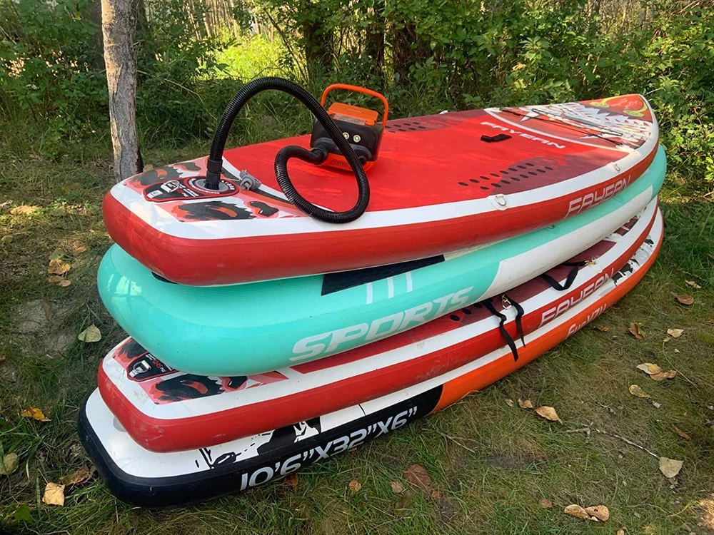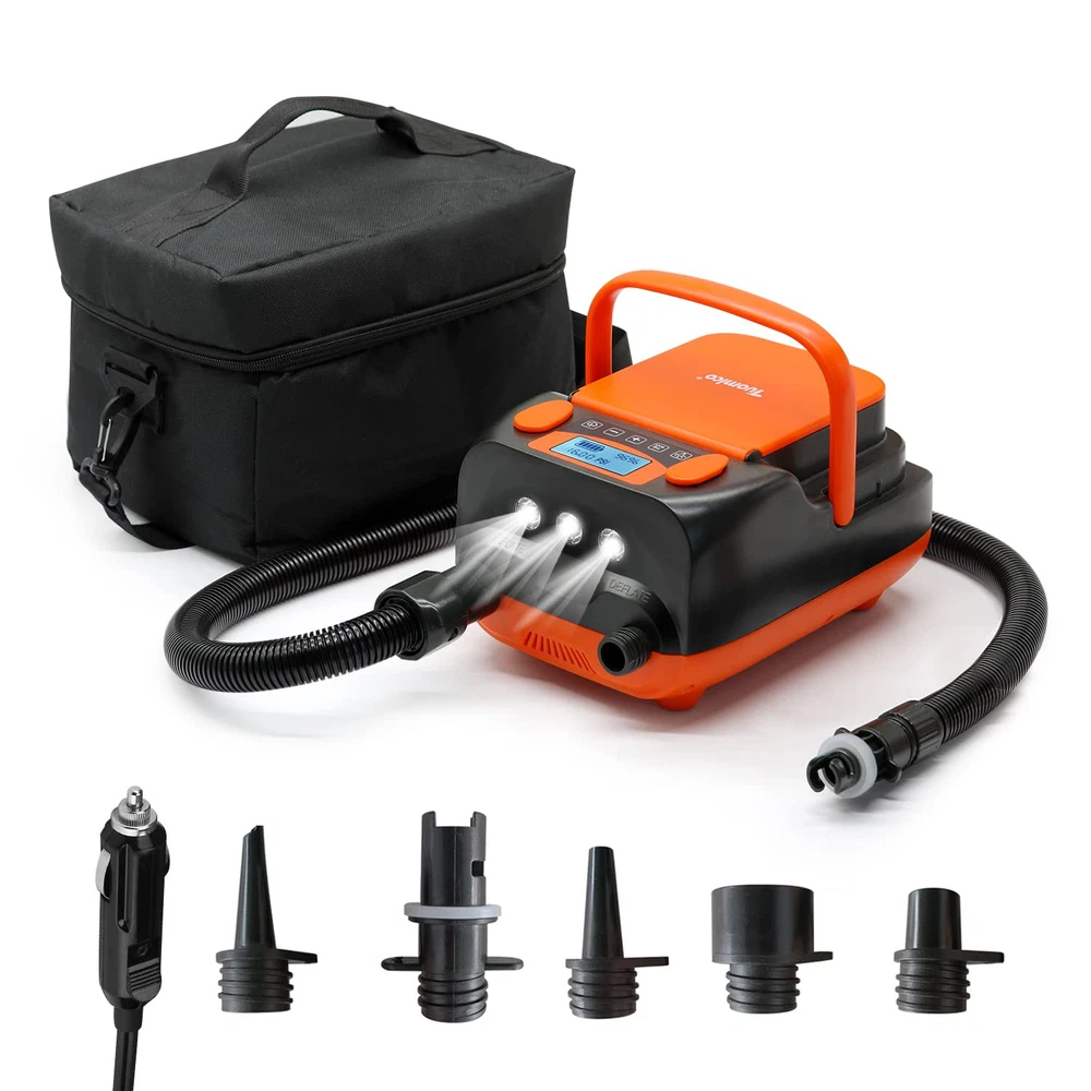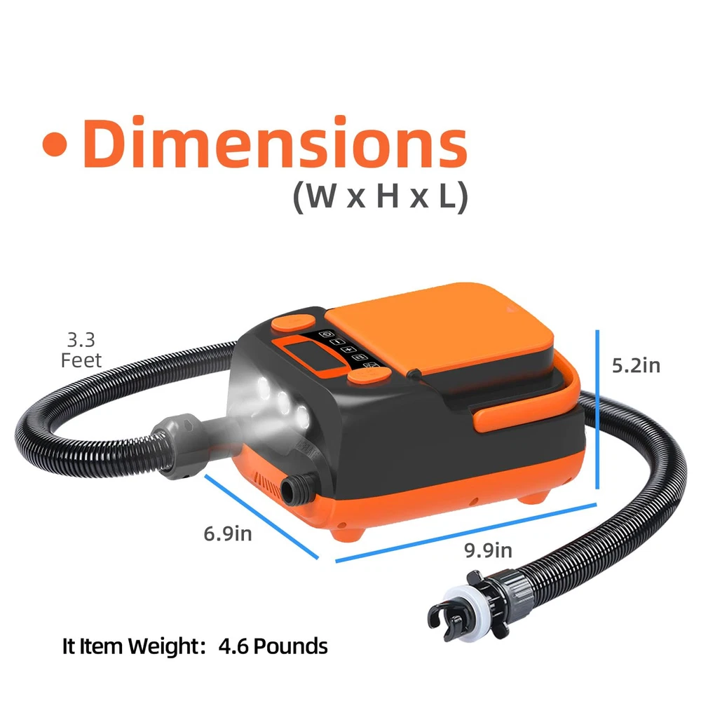【SUP Inflator & Deflator】The pressure of the battery powered sup electric pump is up to 16 PSI, Ideal for use in high-pressure inflatables, can inflate and deflate the SUP, Tent and other inflatables quickly. This sup eletric pump can inflate stand up paddle board to 16 PSI and takes about 10 minutes to reach that maximum capacity.letting the air out of the paddle board and folding it up and get the last bit of air out by using the defaltion fuction. 【LCD PSI Display & Auto Shut-Off】The battery operated paddlebord pump supports real-time pressure monitoring with the integrated lcd digital display, you can set the target pressure and monitor the pressure in real-time.It will automatically stop when your pre-selected pressure is reached.The fully automatic operation makes inflating or deflating ISUP, inflatable tents, inflatable raft,kayak a breeze. 【Portable and Rechargeable】The high pressure paddle board air compressor have a built-in 66.6Wh rechargeable battery which can inflates up to 4 typical Isups with no issues once it is fully charged. It can also be powered via integrated car cigarette plug power cable so you can use it anywhere. 【Space Saving 】The sup inflator electric pump has a space-saving compact design w/ housing access lid to store power cable and a convenient carry handle for easy travel and all the pump and accessories can be storaged in the including carry case. 【Multiple Valve Adapters Included】Comes with full set of nozzles including C7 & H3 halkey roberts valve adapter and other adapter Suitable for SUPs,inflatable fishing kayak,tandem,boats,canoe,raft,kitebaord ,airbed,large inflatable toys etc.
