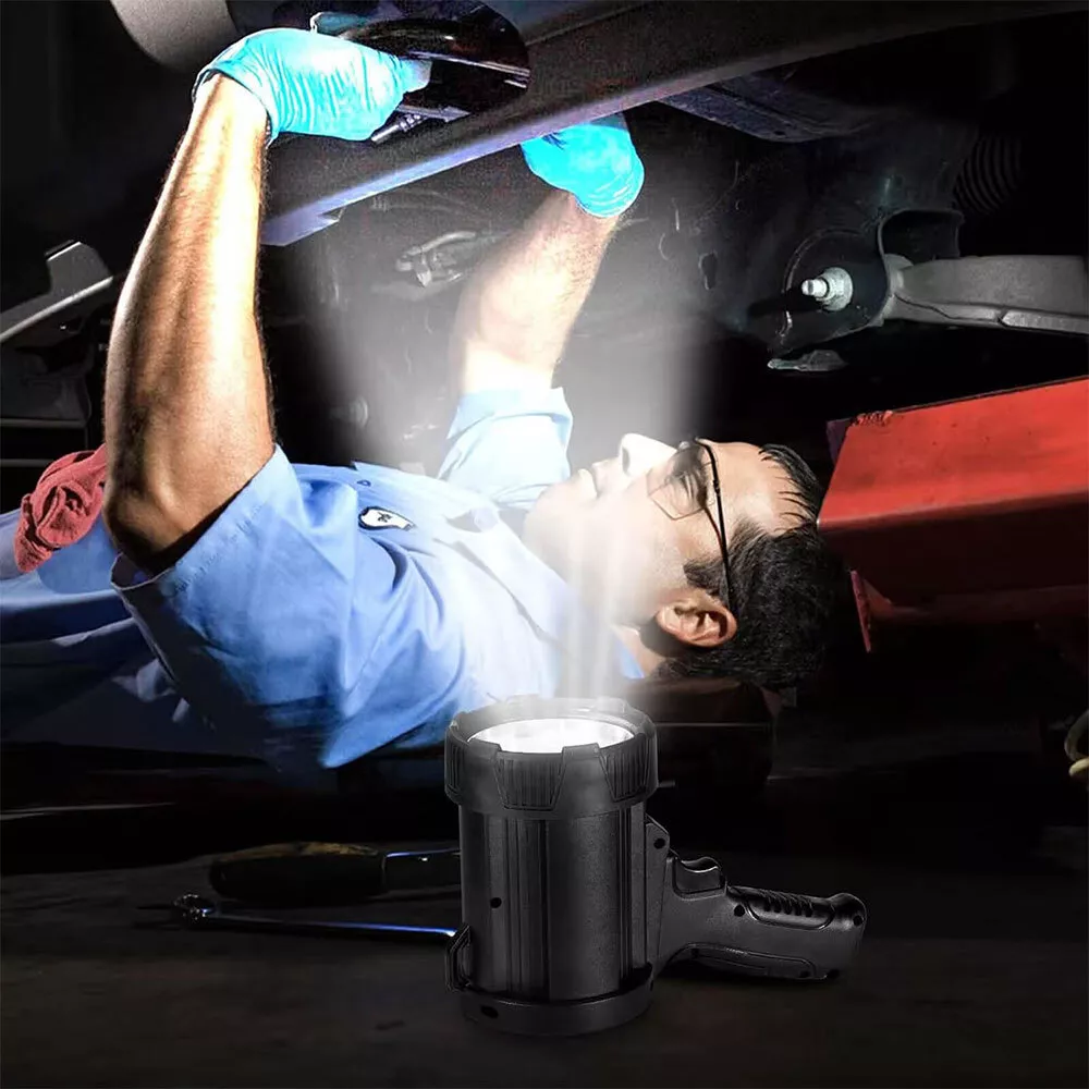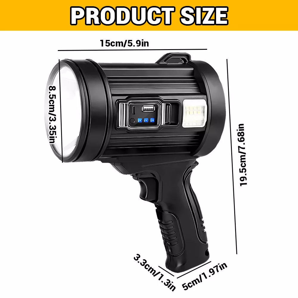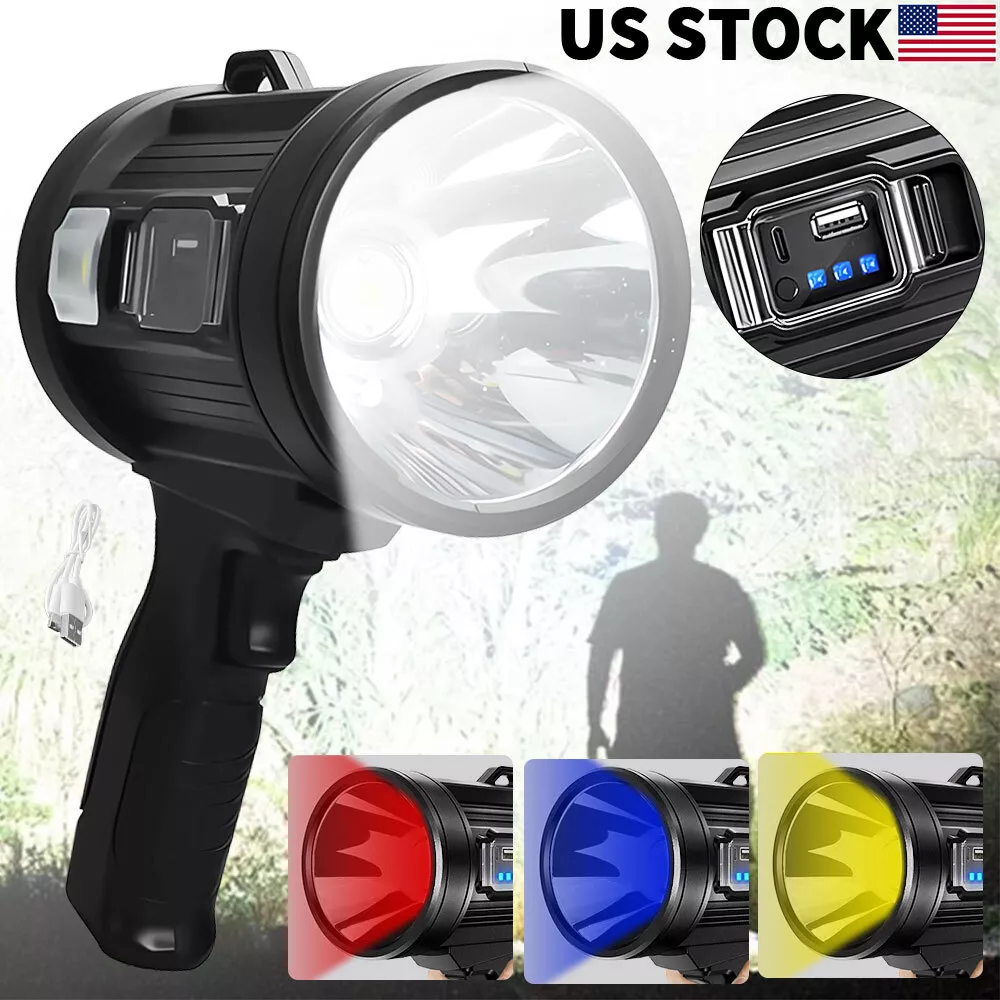 About this item: 1、1000,000 Lumen High Brightness Spotlight - Super bright 1000,000 lumen spotlight flashlight with built-in high brightness LED chip, 10 times brighter than other spotlights, bright and steady light. The strong light sweep is about two soccer fields long and has a range of up to 3,600 feet. Our rechargeable spotlight is perfect for outdoor hunting, hiking, fishing and night work. 2、2 CHARGING MODES - High lumen spotlight with built-in 9600 mAh high capacity ΒATERY, guaranteed to charge over 10,000 times.USB CHARGING TIME: 4-6 hrs. Solar charging time: 10-20 hours. It can also be used as a mobile power to charge your cell phone, very convenient.3 blue indicator lights show the remaining power (25%, 50%, 75%, 100%) . This solar spotlight is a great companion when you are out and about! 3、MAIN LIGHT 3 MODES - The main light of the outdoor spotlight has 3 modes: Front Light (High-Medium-Strobe). Penetrates deep darkness, fog and water. Up to 20 hours of run time. Upgraded LED spotlight emits bright, even lumens of white light that is less visually fatiguing and ideal for close up lighting indoors or in work areas. Side Light 2 Modes - Versatile spotlight with 2 modes of side light: Side Light (High-Low). Up to 30 hours run time. Upgraded handheld soft curved handle for comfort and durability. Bi-directional push-button design is easy to use and makes it an ideal gift for family, friends and the holidays. 4、4 COLOR FILTERS & ADJUSTABLE SHOULDER STRAP - In addition to the standard white light, the main light of the handheld spotlight is equipped with 3 colors of interchangeable lenses (Red-Blue-Yellow) to project different colors to meet the needs of different lighting environments. The included shoulder strap makes it easy to carry the spotlight, freeing up your hands during boating, camping and car maintenance. 5、100% SATISFACTION GUARANTEED - The IPX6 waterproof spotlight flashlight brings great convenience for your outdoor travel, allowing you to work in hot, rainy and snowy weather. It is made of sturdy aluminum alloy and ABS material to protect your searchlight from scratches. We promise to serve every customer seriously. Product Description 1000,000 Lumen Brightest Spotlight Flashlight - Turn Night into Day! WHY CHOOSE OUR RECHARGEABLE FLASHLIGHT? 1. BRIGHTEST SPOTLIGHT - Our rechargeable spotlight uses an upgraded P90 led chip, with higher output lumens, up to 1000,000 lumens. Easily illuminate an entire room or focus on objects within 3600 feet. Long runtime make it a quality lighting tool. 2. BRIGHT 5 MODES - Multifunctional spotlight with 5 modes: (1)Main Light(High - Medium-Strobe) . (2)Side Light(High - Medium) . Can penetrate deep darkness, fog and water. 3. 30H LONG RUNTIME - Our powerful spotlight has a capacity of 9600 mAh ΒATTERY, can provide up to 30 hours or more for outdoor lighting activities. 4. FAST CHARGING & POWER BANK - Our flashlight USB fast charging on 4 hours, Suitable for wall chargers and USB charging ports. It can also be used as a power bank to charge your mobile phone. 5. POWER DISPLAY : Our power display allows you to know the remaining power and when it needs to be charged more accurately, which is very convenient. 6. IPX6 WATERPROOF - The waterproof grade of the our flashlight is IPX6, No problem on rainy days! Great for outdoor camping, hiking, night running, dog walking, boating, fishing, climbing, hunting, including home emergencies, garages, power outages, car repairs. Perfect for treating yourself or giving as a gift. Spotlight Flashlight with 5 Light Modes for Your Choice Main Light 3 Modes - Outdoor Spotlight with Main Light 3 Modes: Front Light (High-Medium-Strobe). Run time up to 20 hours. Can penetrate deep darkness, dense fog and water. Side Light 2 Modes - Handheld Spotlight with Dual Side Lights 2 Modes: Side Light (High-Medium). Run time up to 30 hours. Red & blue strobe light for warning and help call. White/Red/Blue/Yellow - Replaceable Lenses : Powerful LED spotlight with 4 color lenses, with high-medium-flash mode. You can cycle through different lighting modes by installing lenses of different colors to meet your lighting needs. Outdoor Spotlight - Supports USB+ Solar Charging. It Can be Charged with Sunlight! A high-conversion solar panel is installed on the back of the searchlight body. The searchlight can be charged by placing it under the sun during the day. Charging is quick and convenient. Solar charging time: 10-20 hours. It is very suitable for outdoor camping, hiking, mountain climbing, and dog walking. It solves the problem of difficulty in charging outdoors and gives you a full sense of security when outdoors! Our Rechargeable Spotlight with USB Input Port & Output Port Fast Charging in 4 Hours: This flashlight can be charged either with a wall charger at home or outdoors with a USB car charger/mobile power supply. As a Power Bank: The spotlight can also be used as a mobile power source to charge your cell phone or laptop in an emergency. Power Display: Rechargeable spotlight with 4 power indicators for more accurate indication of remaining power (25%, 50%, 75%, 100%). Built-in 9600mAh Large-capacity ΒATTERY : The spotlight flashlight is equipped with a 9600mAh large-capacity ΒATTERY, which can provide up to 20 hours of working time in the main light medium brightness mode and up to 30 hours of working time in the bright light mode. Side light medium mode to keep the light bright. Multi-functional Spotlight, Light up Your Life Work IPX6 Waterproof: The LED spotlight adopts IPX6 waterproof design and can withstand harsh environments such as heavy rain, extreme cold, and high temperature. Powerful Spotlights: Sturdy aluminum alloy + ABS design, with extremely high drop-proof performance, very suitable for home or outdoor use. Adjustable Shoulder Strap: Convenient to use and carry. A must-have for the outdoors! Led Spotlight With 4 Color Lenses to Meet The Lighting Needs of Different Scenes Materia